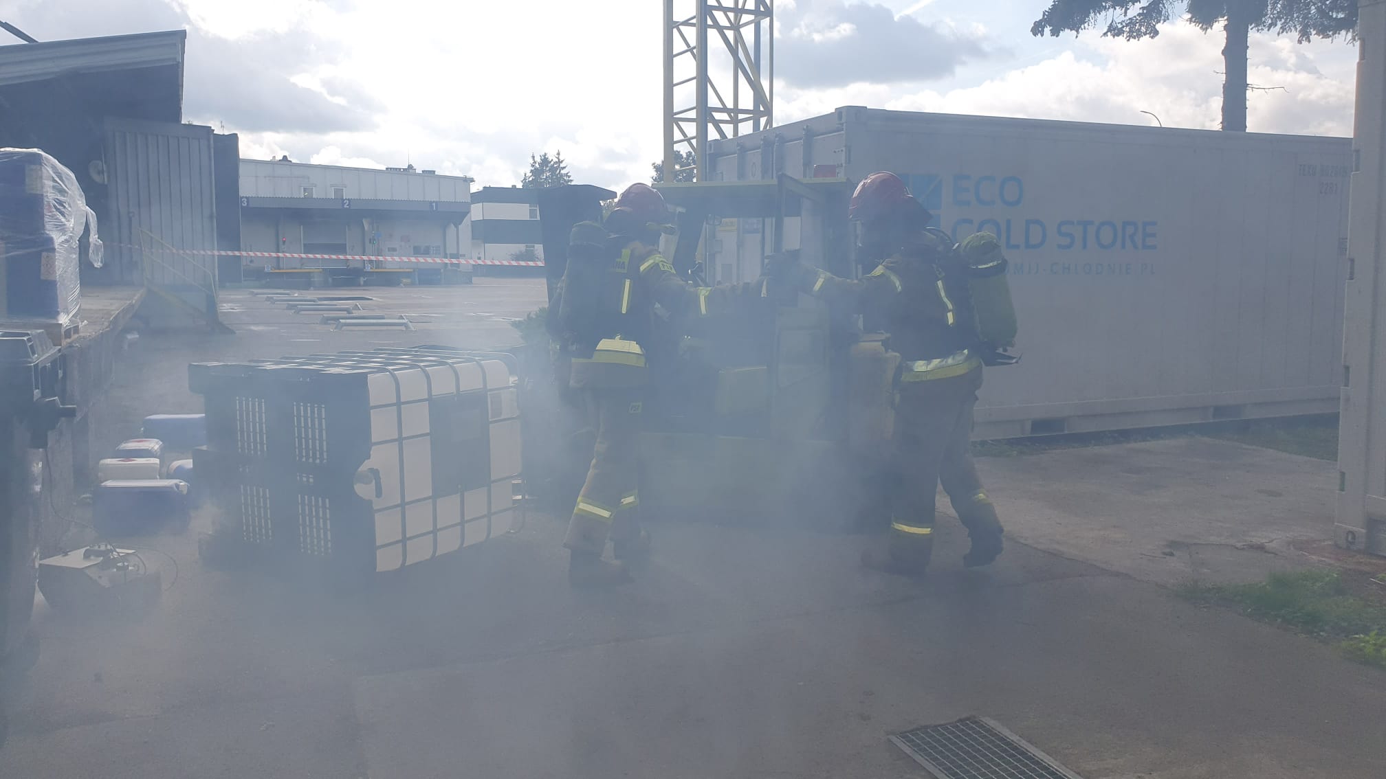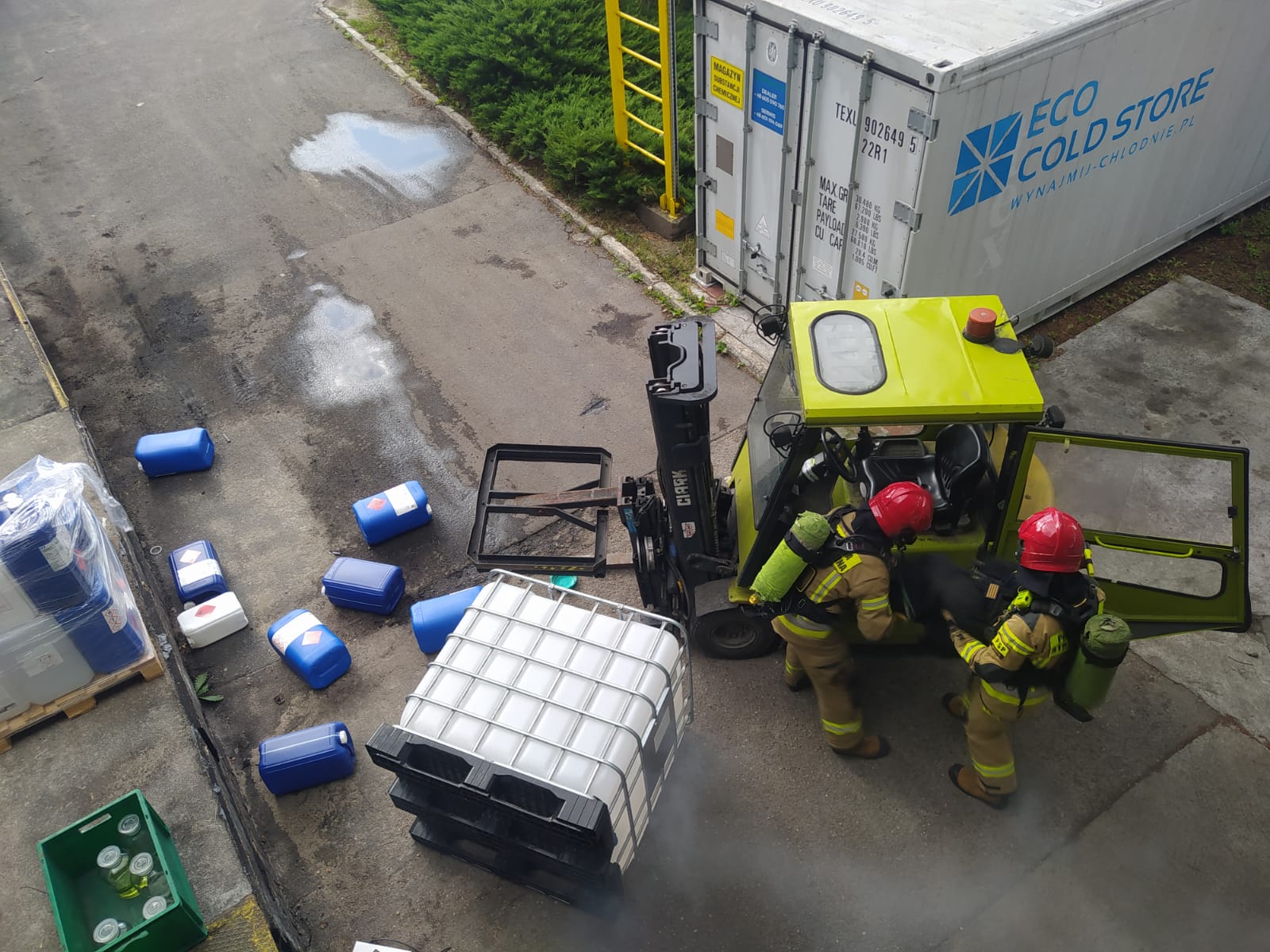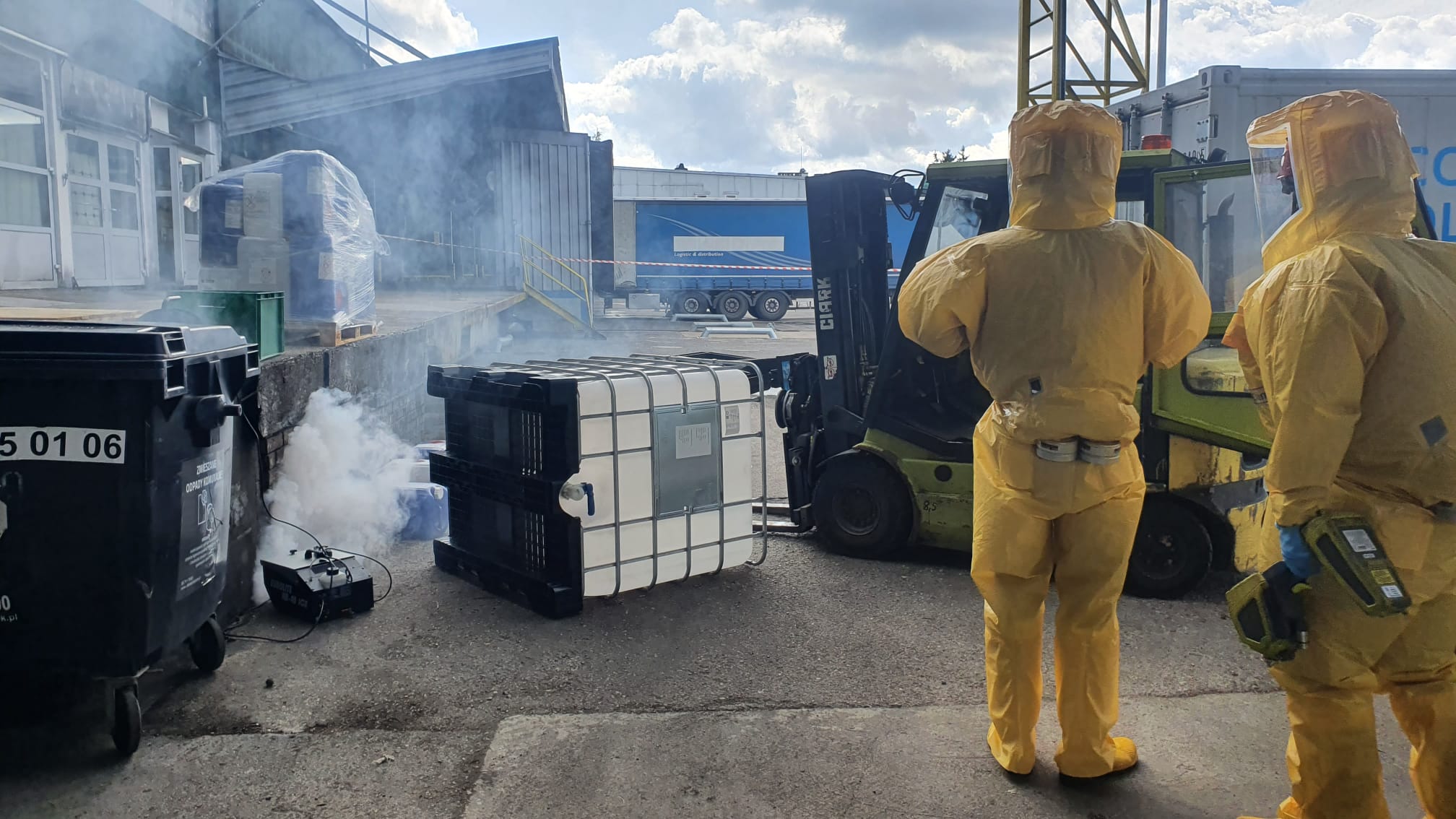 Celem ćwiczeń było przeprowadzenie akcji ratowniczej na pozorowanym zdarzeniu, które zakładało, że przy jednej z ramp rozładunkowych, w wyniku zasłabnięcia operatora za kierownicą wózka widłowego, dochodzi do uszkodzenia pojemników z niebezpiecznymi substancjami chemicznymi. W wyniku tego zajścia poszkodowana zostaje jedna osoba,