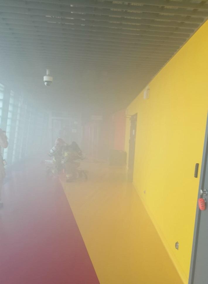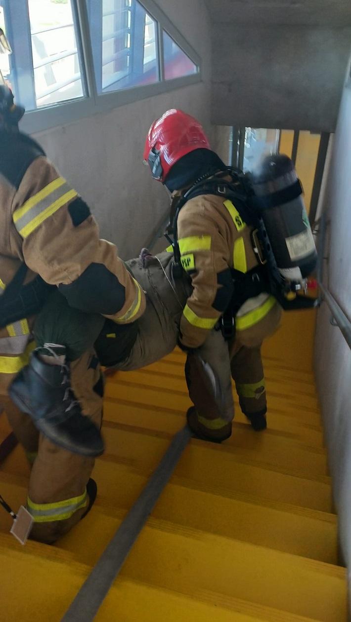 W związku z nieudaną próba ugaszenia pożaru, pracownicy podejmują decyzję o ewakuacji. Kierownik obiektu stwierdza brak dwóch osób. Jedna z nich przeprowadzała prace konserwatorskie na wysokości, druga w pomieszczeniu cateringu. O zdarzeniu zostają poinformowane służby, w tym Państwowa Straż Pożarna.