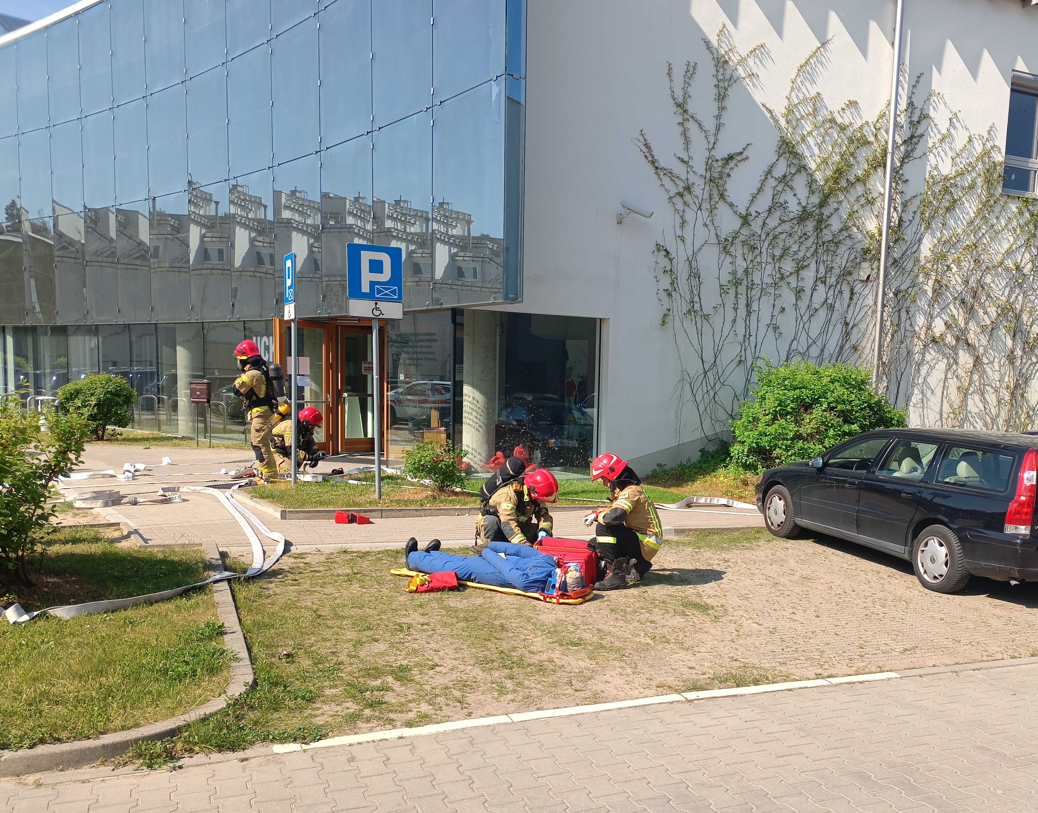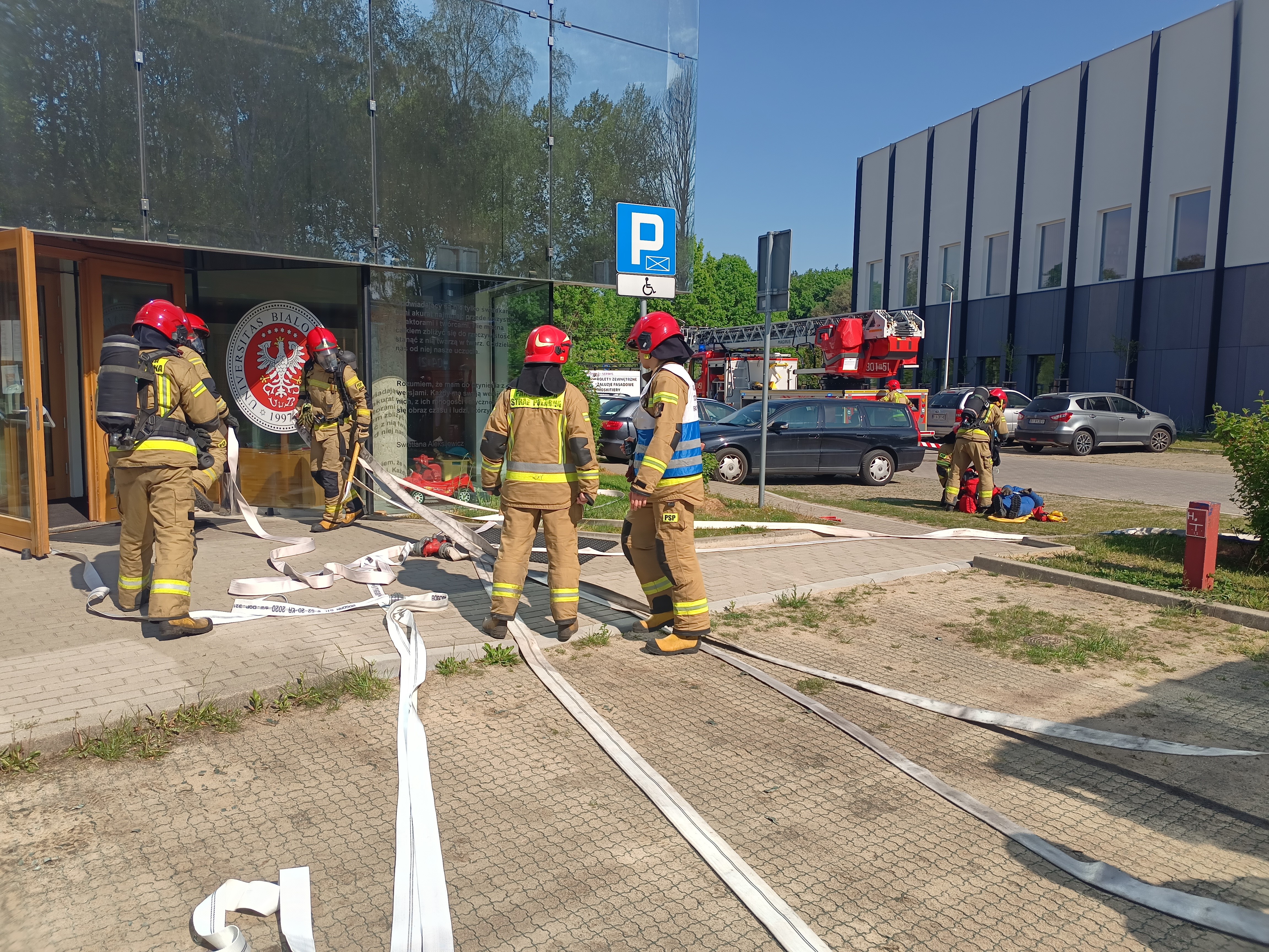 W dniu 25.5.2022 roku przeprowadzono ćwiczenia w celu rozpoznania możliwości i warunków prowadzenia działań ratowniczo-gaśniczych przez jednostki PSP w budynku Uniwersyteckiego Centrum Kultury, w kampusie Uniwersytetu w Białymstoku.