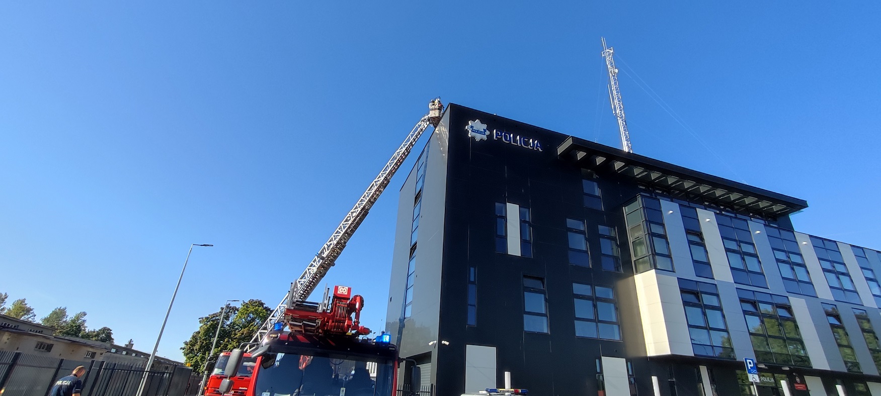 Latający obiekt zrzucił łatwopalną substancję na dach obiektu. Powstały pożar zaczyna się szybko rozprzestrzeniać. W momencie ataku w budynku komisariatu znajduje się kilkunastu pracowników, którzy zaalarmowani zaczęli się ewakuować na zewnątrz obiektu. Stwierdzono brak jednej osoby, która prawdopodobnie doznała ataku paniki i pozostała w pomieszczeniu siłowni.