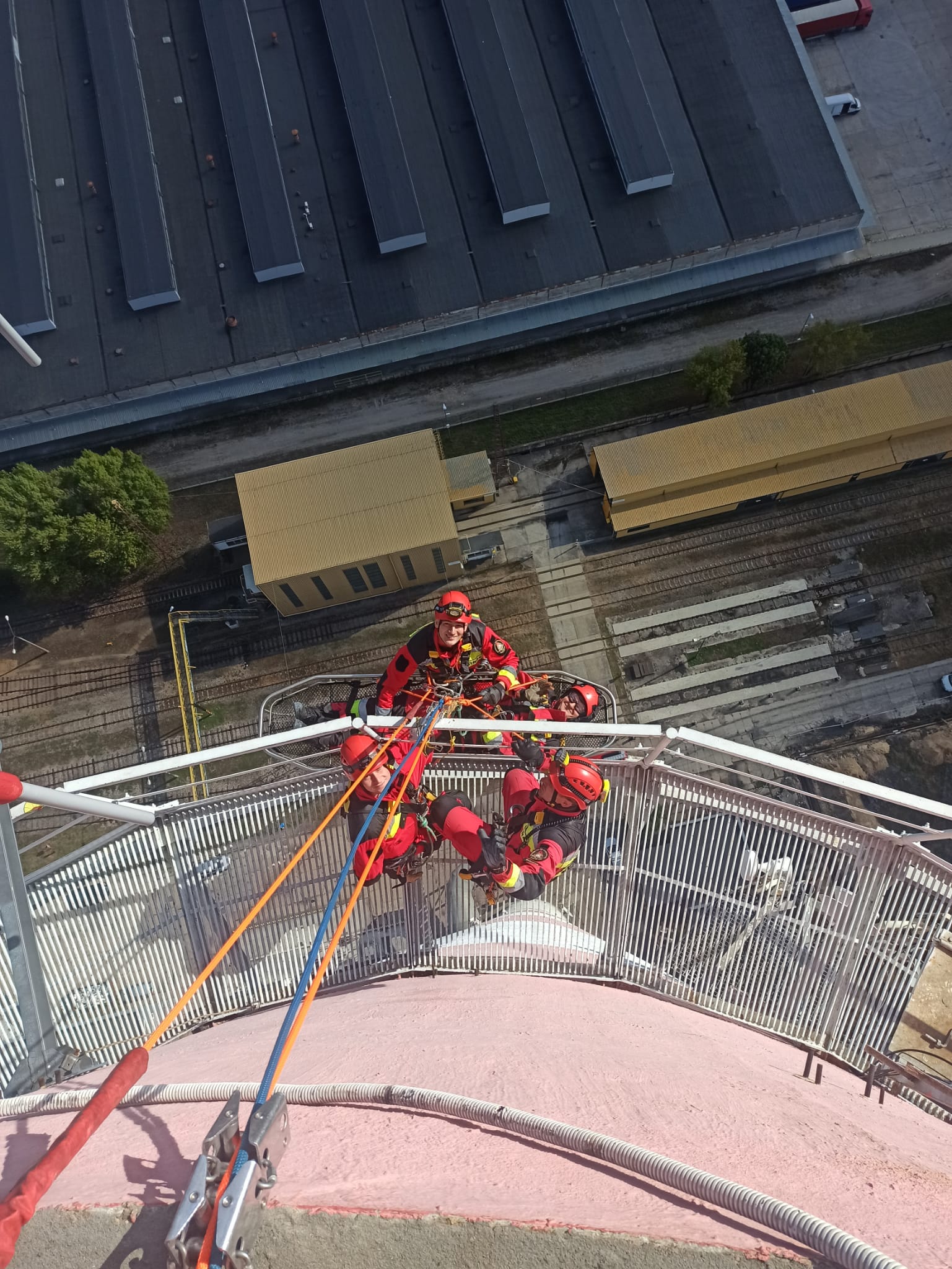 20 września 2023 r. białostoccy ratownicy wysokościowi wspólnie z funkcjonariuszami Policji ćwiczyli na dużych wysokościach. Epizod przewidywał ewakuację spadochroniarza, który zawisł na szczycie komina oraz ewakuację pracownika, który utknął we wnętrzu komina. Działania ratowników przebiegały równolegle we wnętrzu komina oraz na zewnątrz na wysokości 120 m. Ewakuacja spadochroniarza polegała na opuszczeniu go w noszach po linie kierunkowej natomiast poszkodowanego pracownika w pionie pomiędzy podestami roboczymi we wnętrzu komina. Spadochroniarzem zajęli się również Policjanci ponieważ istniało niebezpieczeństwo sabotażu.