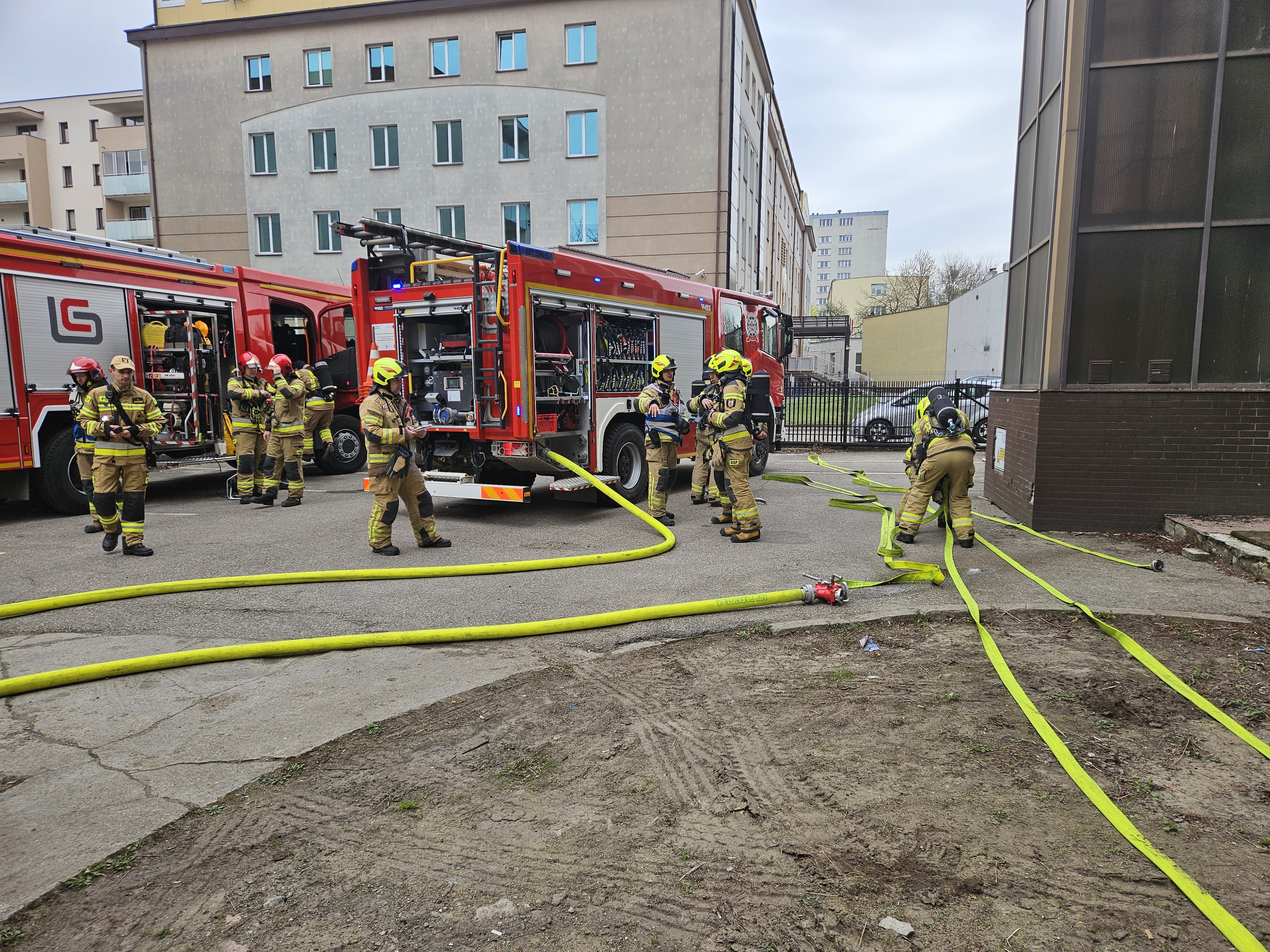 Ćwiczenia z taktyki działań gaśniczych podczas pożaru budynku na ulicy Krakowskiej w Białymstoku