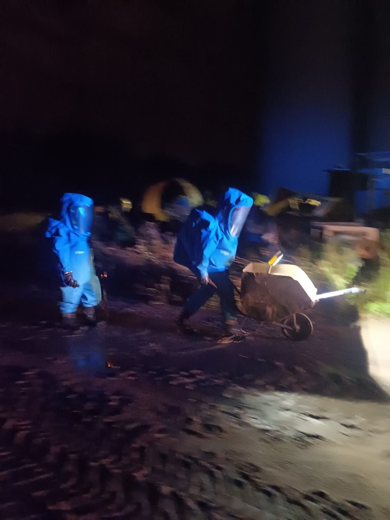 Działania przybyłych na miejsce zastępów polegały na jego zabezpieczeniu i wyznaczeniu strefy niebezpiecznej. Równocześnie z karty charakterystyki substancji niebezpiecznej ustalono, że obecny w mieszaninie związek chemiczny - fosforek glinu w wyniku kontaktu z wodą wydziela palny i trujący gaz - fosforowodór, który w kontakcie z powietrzem zapala się spontanicznie, a zastany pożar należy gasić piaskiem lub proszkiem gaśniczym. Na podstawie tych informacji przystąpiono do gaszenia substancji poprzez zasypywanie jej piaskiem dowożonym przy użyciu ładowarki teleskopowej przez pracownika Podlaskich Zakładów Zbożowych. Ratownicy w ciężkich ubraniach gazoszczelnych i sprzęcie ochrony układu oddechowego zasypujący ręcznie poszczególne miejsca pożaru byli regularnie wymieniani, z uwagi na opady deszczu intensyfikujące reakcję spalania substancji. Strażacy działający w strefie kontrolowali miejsca występowania podwyższonej temperatury przy użyciu kamery termowizyjnej oraz wspomagali się sprzętem oświetleniowym. Ratowników opuszczających strefę zagrożenia dekontaminowano wodą z mydłem, a następnie spłukiwano strumieniem wody z linii szybkiego natarcia. Po zasypaniu wszystkich miejsc o podwyższonej temperaturze ponownie miejsce pożaru sprawdzono kamerą termowizyjną wykluczając obecność pojedynczych zarzewi ognia, a także nie stwierdzając obecności pochodnych fosforu spektrometrem ruchliwości jonów.