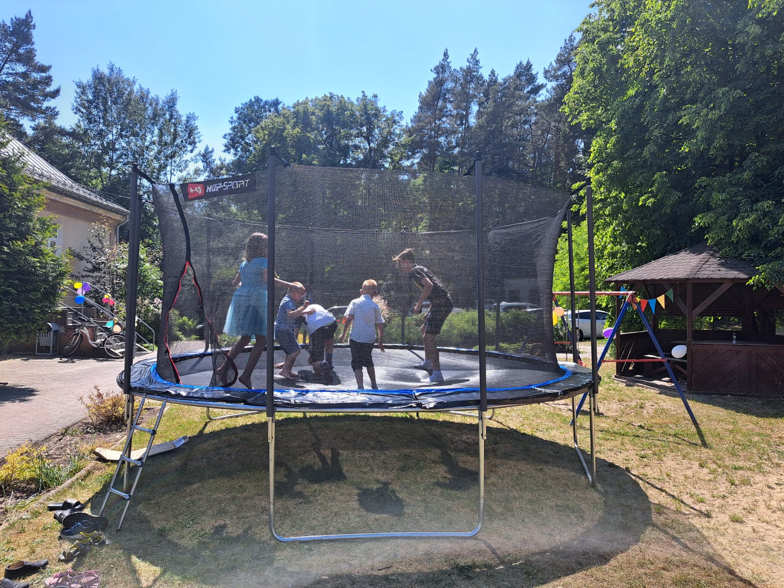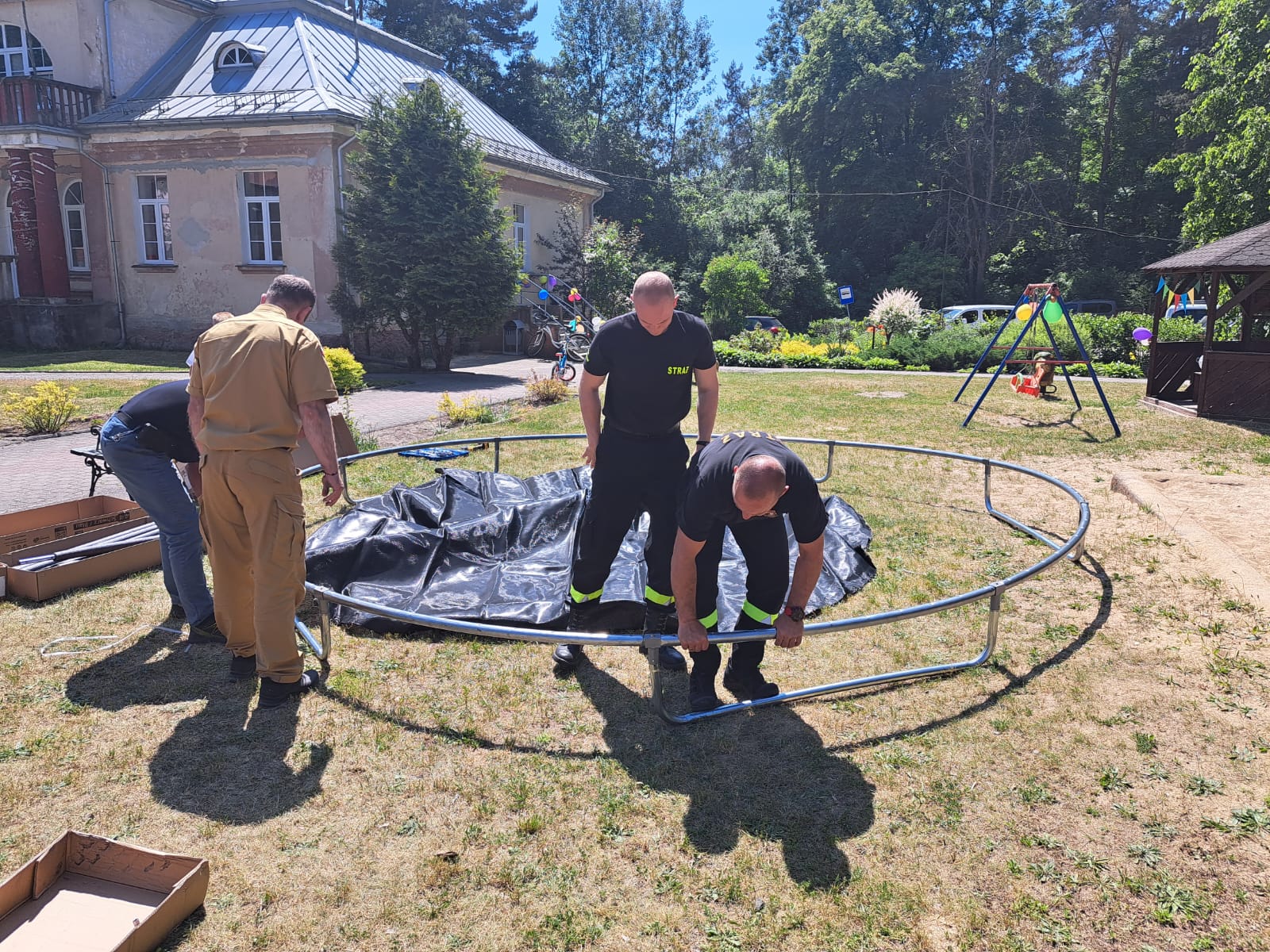 Natomiast po godz. 12:00 Dowództwo Jednostki Ratowniczo-Gaśniczej nr 5 KM PSP w Białymstoku wraz z przedstawicielami Ośrodka Szkolenia KW PSP oraz druhami z OSP Zabłudów odwiedzili dzieci w Domu Dziecka w Krasnem. Podczas tej wizyty została przekazana i złożona trampolina do zabaw, zakupiona na potrzeby przebywających w Domu Dziecka dzieci.