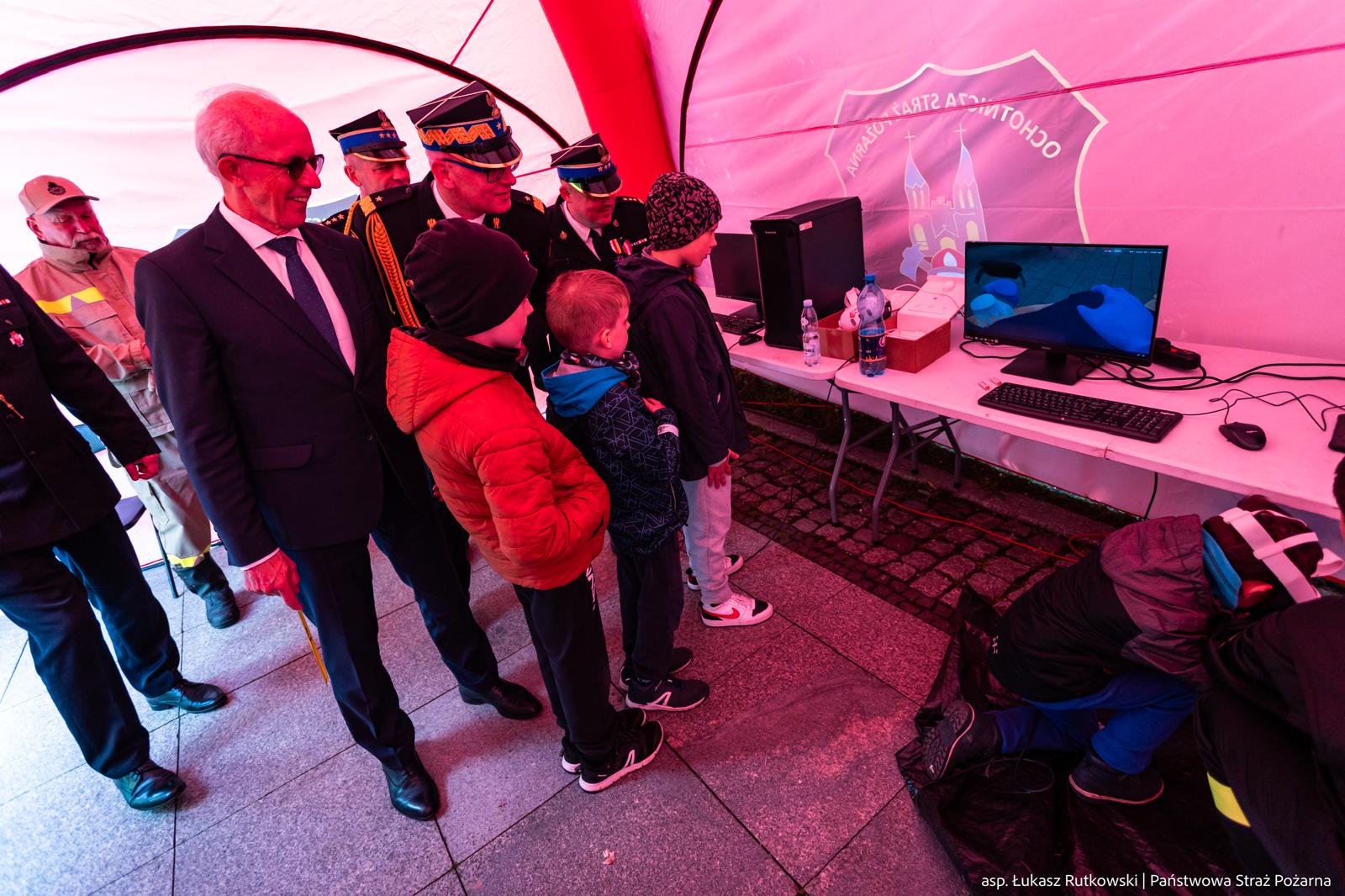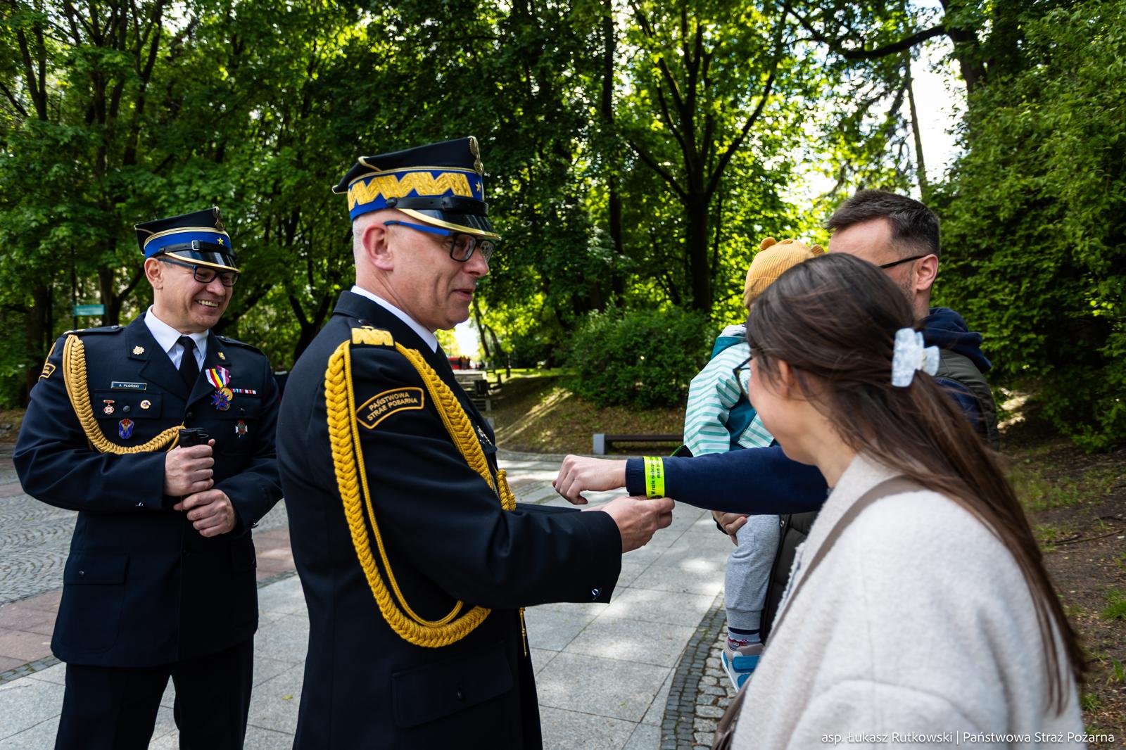 Po zakończonym w Podlaskim Urzędzie Wojewódzkim uroczystym apelu, opaski odblaskowe uczestnikom festynu rozdawał również Zastępca Komendanta Głównego PSP – nadbryg. Paweł Frysztak, który wraz z Wiceministrem Spraw Wewnętrznych i Administracji - Panem Wiesławem Leśniakiewiczem odwiedził przygotowane stanowiska.