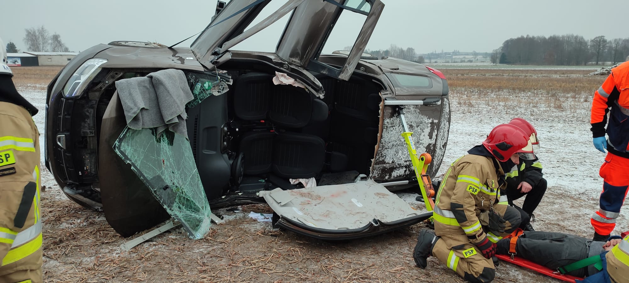 Trzydziestoletni kierujący Dacią Logan, jadąc w kierunku Białegostoku, stracił panowanie nad pojazdem, zjechał z jezdni i dachował. Ratownicy przybyli na miejsce zdarzenia zabezpieczyli teren akcji, a następnie przy użyciu sprzętu hydraulicznego ewakuowali z pojazdu zakleszczonego kierowcę i przekazali przybyłemu Zespołowi Ratownictwa Medycznego. Poszkodowany został przetransportowany do szpitala, w celu wykonania szczegółowych badań.