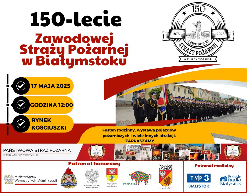17 maja 2025 r. o godz. 12:00 na placu przed pomnikiem Marszałka Józefa Piłsudskiego odbędą się uroczyste obchody jubileuszu 150-lecia Zawodowej Straży Pożarnej w Białymstoku połączone z Wojewódzkimi Obchodami Dnia Strażaka.