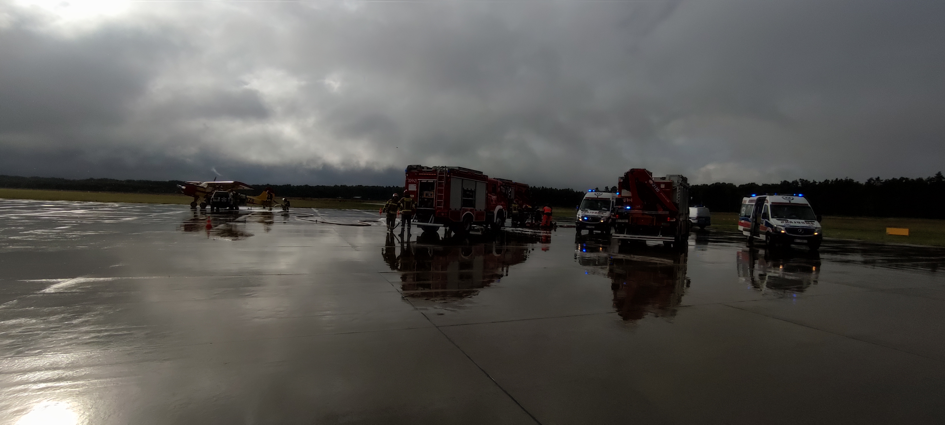 Na teren lotniska wjeżdża z dużą prędkością samochód i uderza w znajdujący się na drodze startowej samolot, na pokładzie którego znajdują się 2 osoby. W wyniku zderzenia znajdujący się na pokładzie samolotu pilot i pasażer odnieśli obrażenia. Kierowca samochodu w wyniku szoku powypadkowego ucieka z miejsca zdarzenia. W wyniku zderzenia samochód płonie, a z wnętrza samolotu ulatnia się dym.