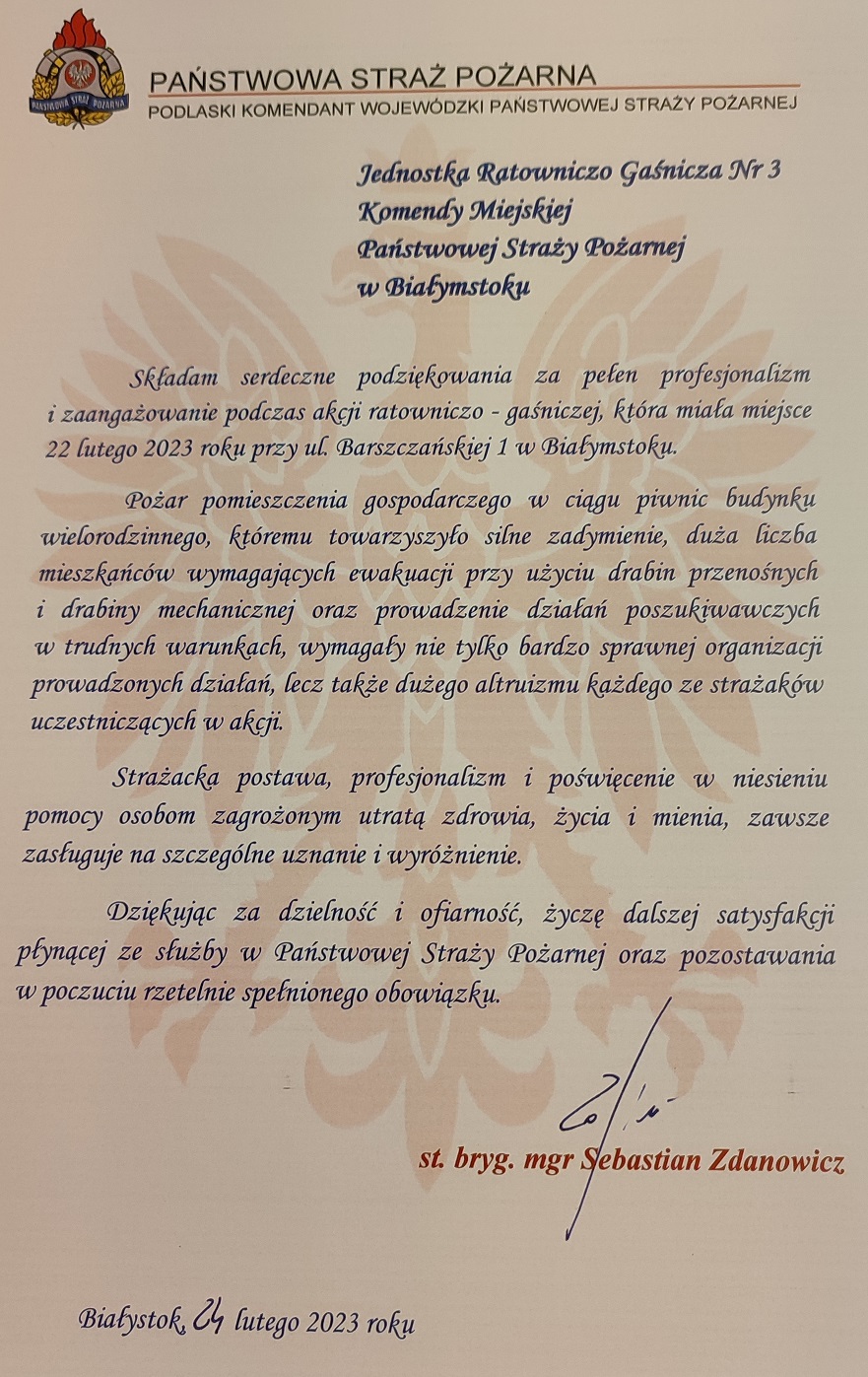 Głos zabrał również Zastępca Podlaskiego Komendanta Wojewódzkiego PSP – st. bryg. Paweł Ostrowski, który przekazał dane statystyczne za działalność ochrony przeciwpożarowej na terenie województwa podlaskiego w 2022 roku. Następnie na ręce Dowódców JRG nr 1, JRG nr 3 oraz JRG nr 4 zostały przekazane podziękowania od Podlaskiego Komendanta Wojewódzkiego PSP strażakom biorącym udział w akcji ratowniczo- gaśniczej, która miała miejsce 22 lutego 2023 roku przy ul. Barszczańskiej w Białymstoku.