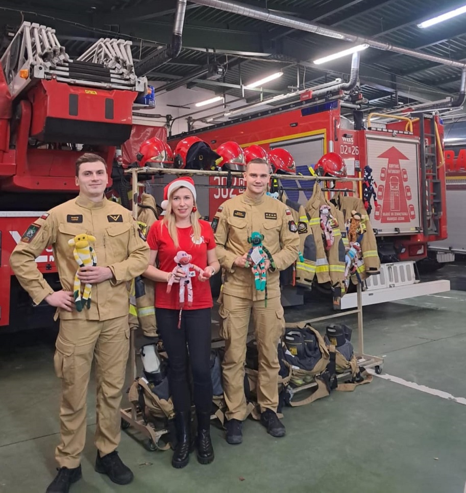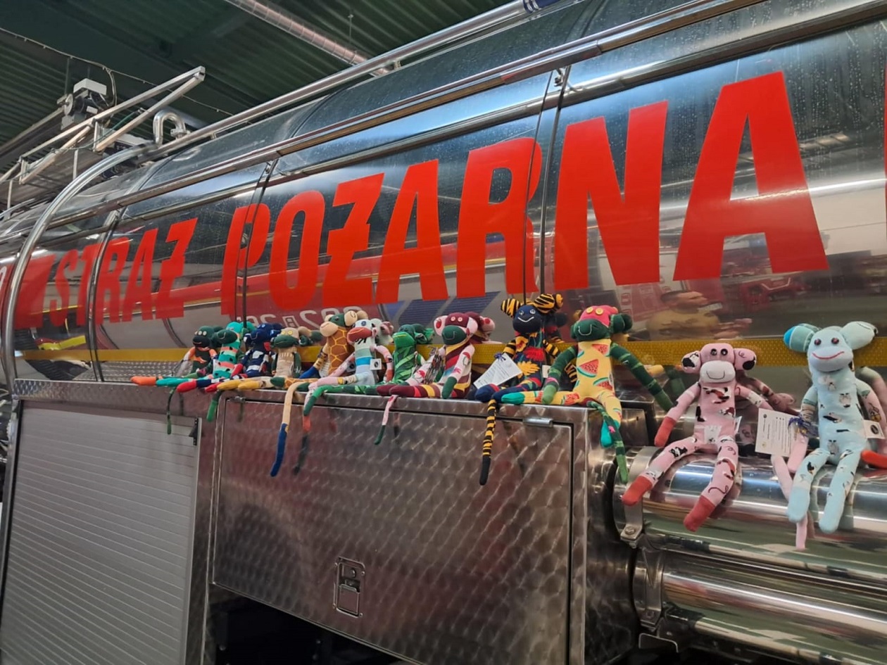 Strażacy rozlokowali nowych towarzyszy w postaci maskotek, na pojazdy pożarnicze. Małpki czekają do wyjazdu!