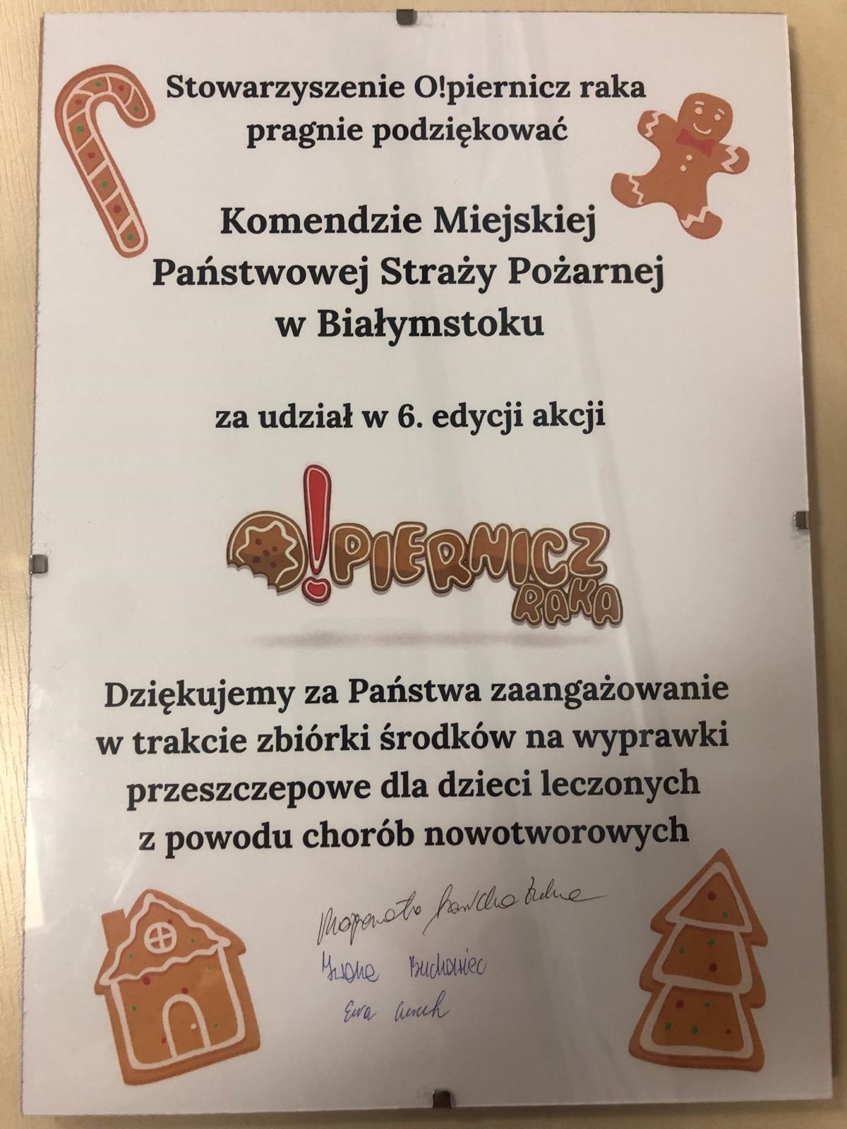 „Dziękujemy za Państwa zaangażowanie w trakcie zbiórki środków na wyprawki przeszczepowe dla dzieci leczonych z powodu chorób nowotworowych” – podziękowanie z takim przesłaniem w imieniu wszystkich strażaków odebrał Komendant Miejski PSP w Białymstoku.