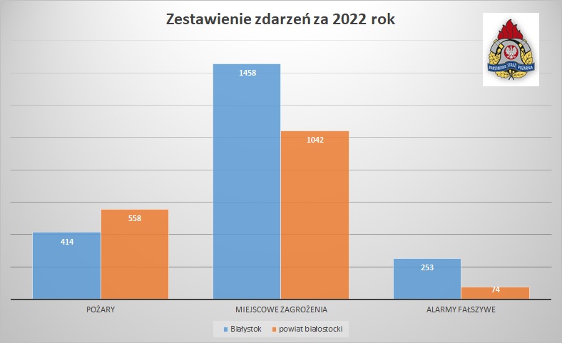 W 2022 roku na terenie miasta Białegostoku odnotowano 2125 zdarzeń (w tym 414 pożarów, 1458 miejscowych zagrożenia i 253 alarmów fałszywych). Na terenie powiatu białostockiego odnotowano 1674 zdarzeń (w tym 558 pożarów, 1042 miejscowych zagrożeń i 74 alarmy fałszywe).