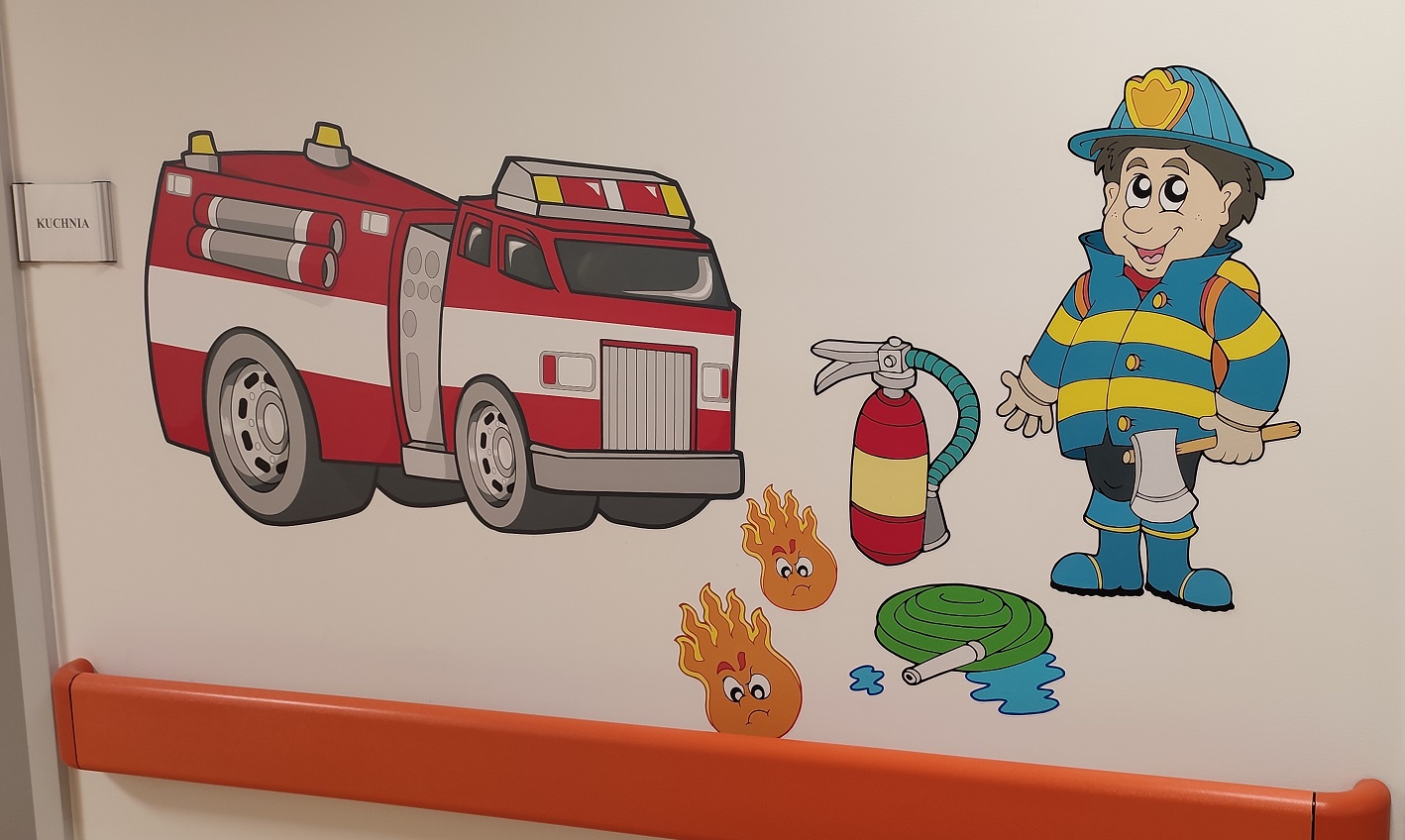 - naklejki dydaktyczne z bajkowymi postaciami, które są rozmieszczone na korytarzu i w salach chorych