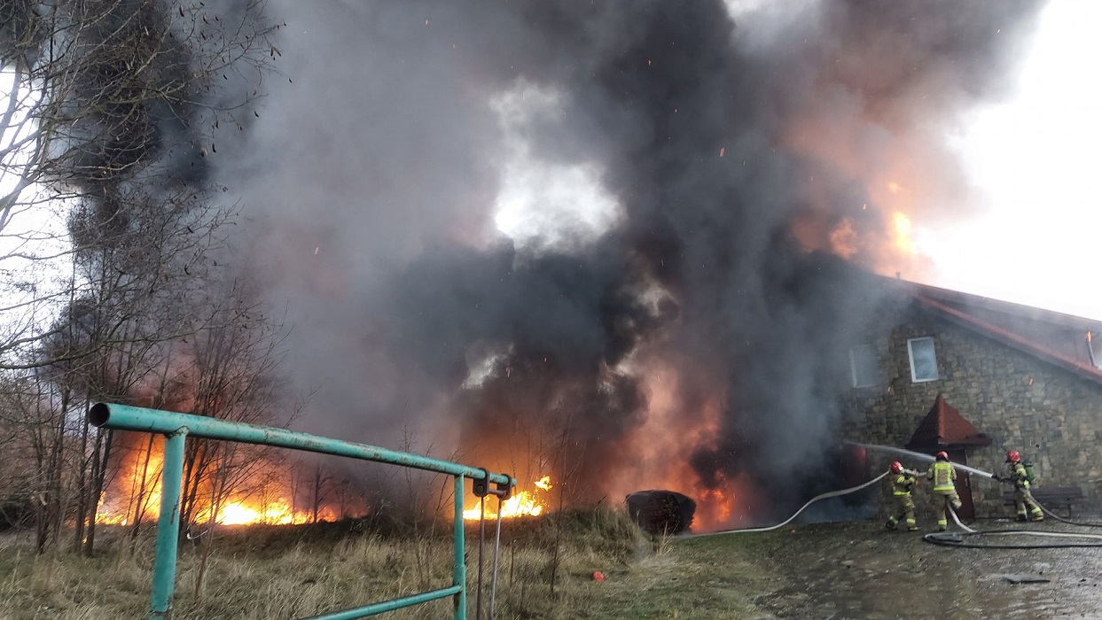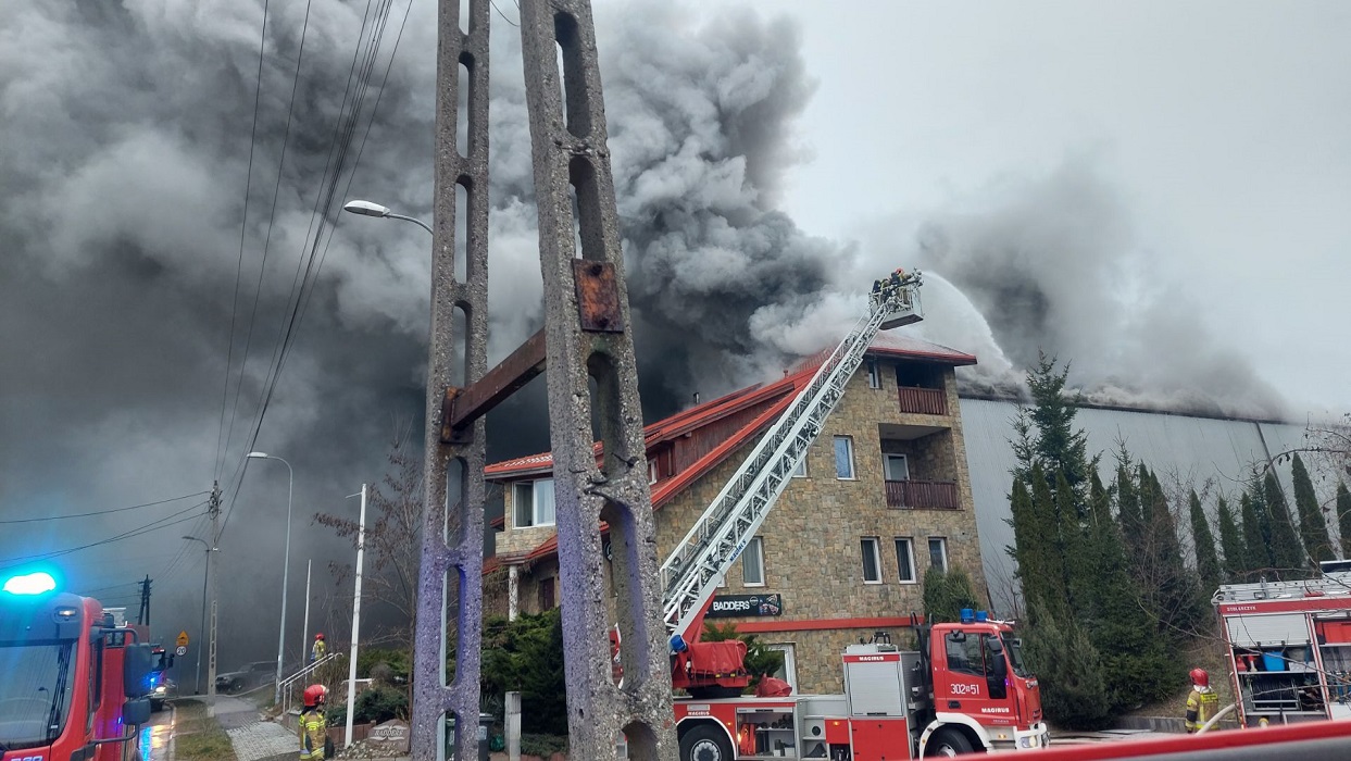 Pożar budynku biurowego wraz z przyległą halą sportową