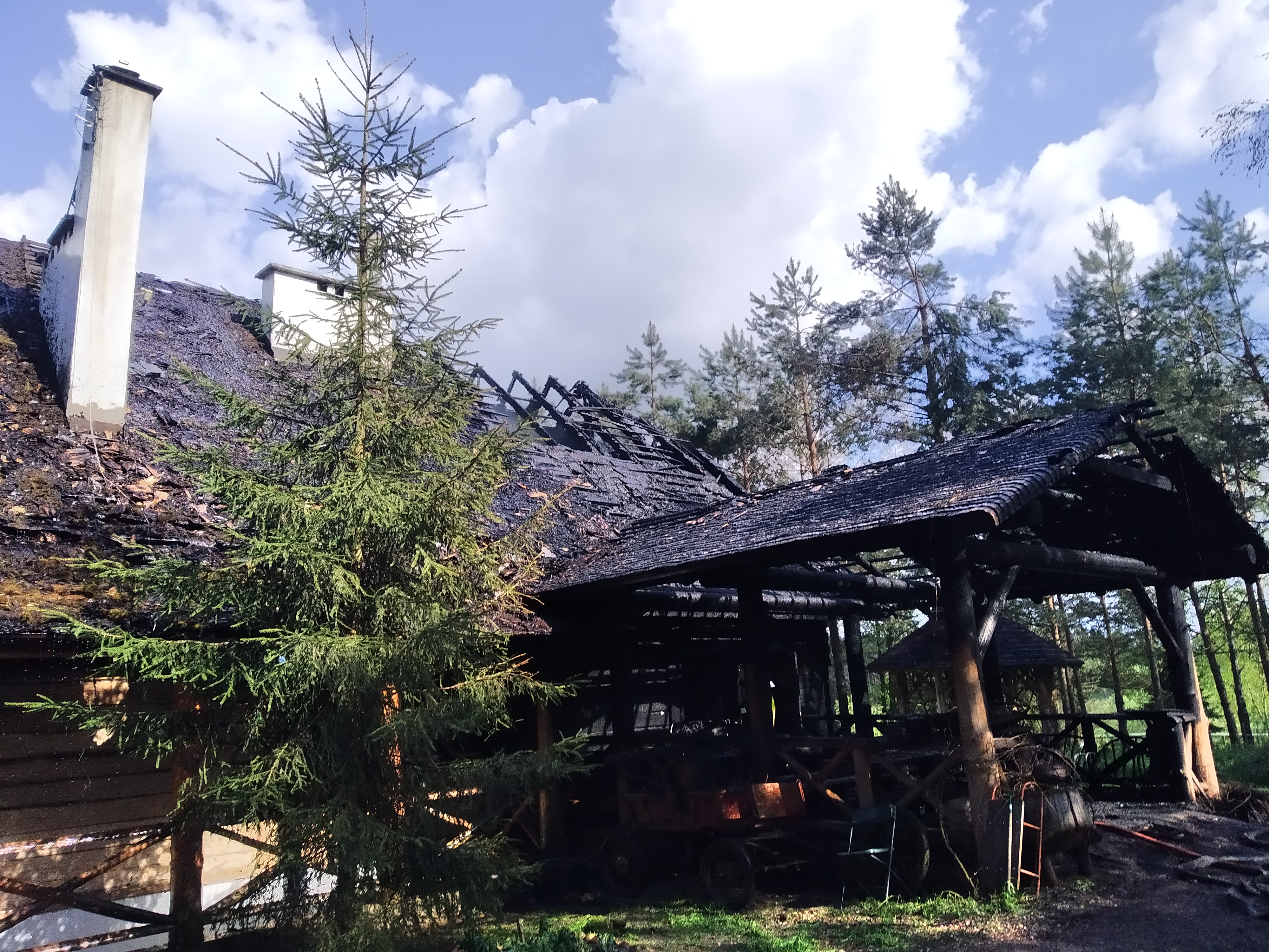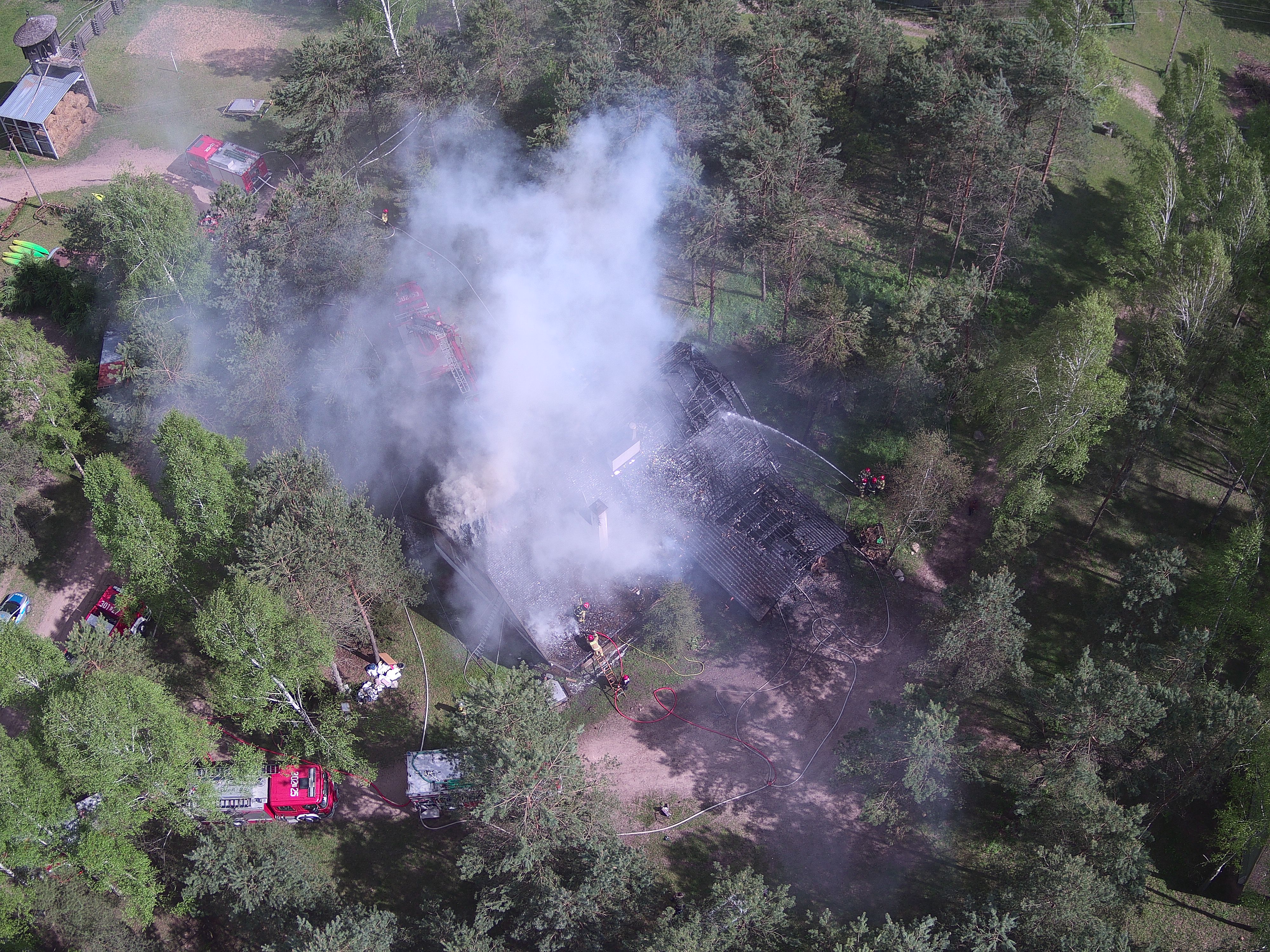 W momencie przybycia pierwszych sił i środków Jednostek Ochrony Przeciwpożarowej, dach i poddasze budynku było całkowicie objęte pożarem oraz zadymione wszystkie kondygnacje. Właściciel na miejscu poinformował Kierującego Działaniami Ratowniczymi o braku osób wewnątrz obiektu.