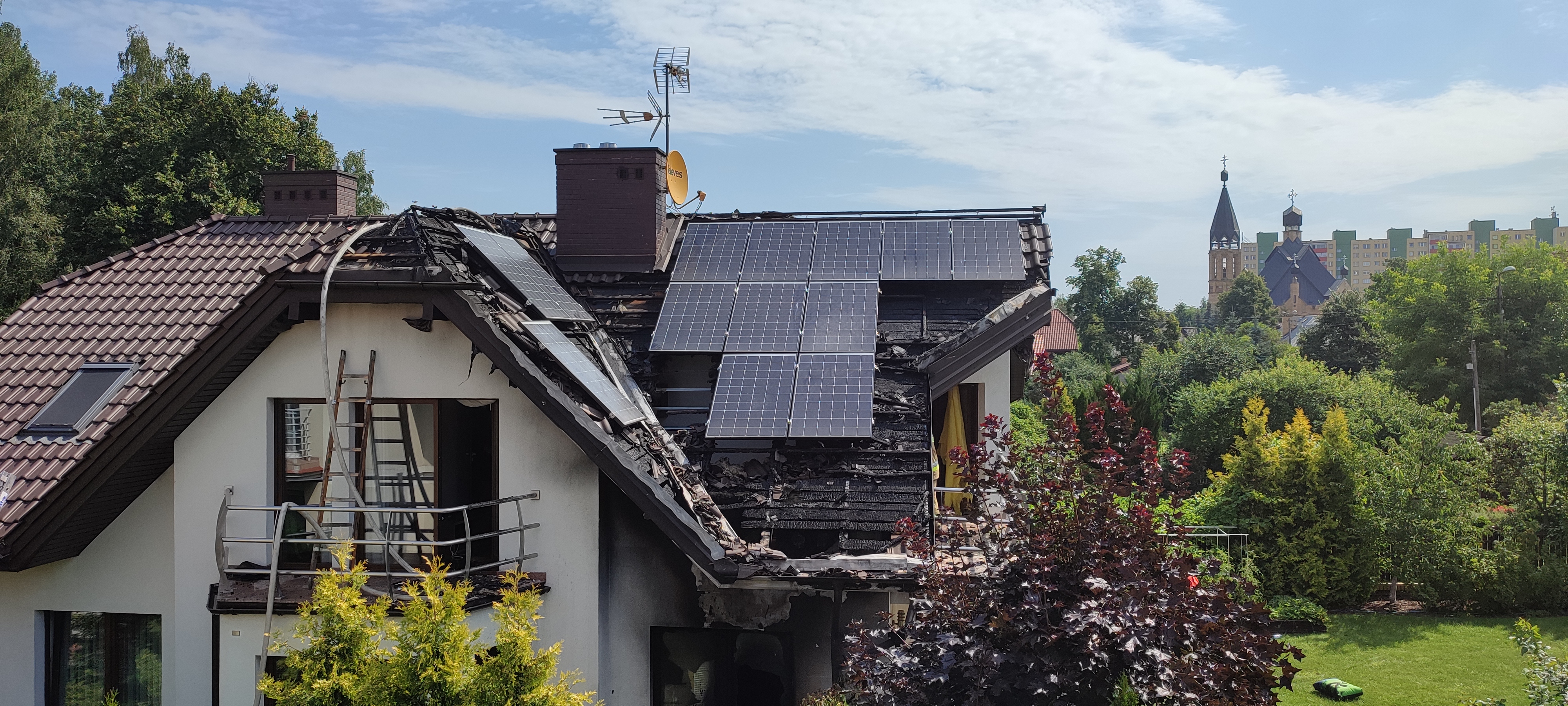 Pożar domu jednorodzinnego z instalacją fotowoltaiczną na dachu