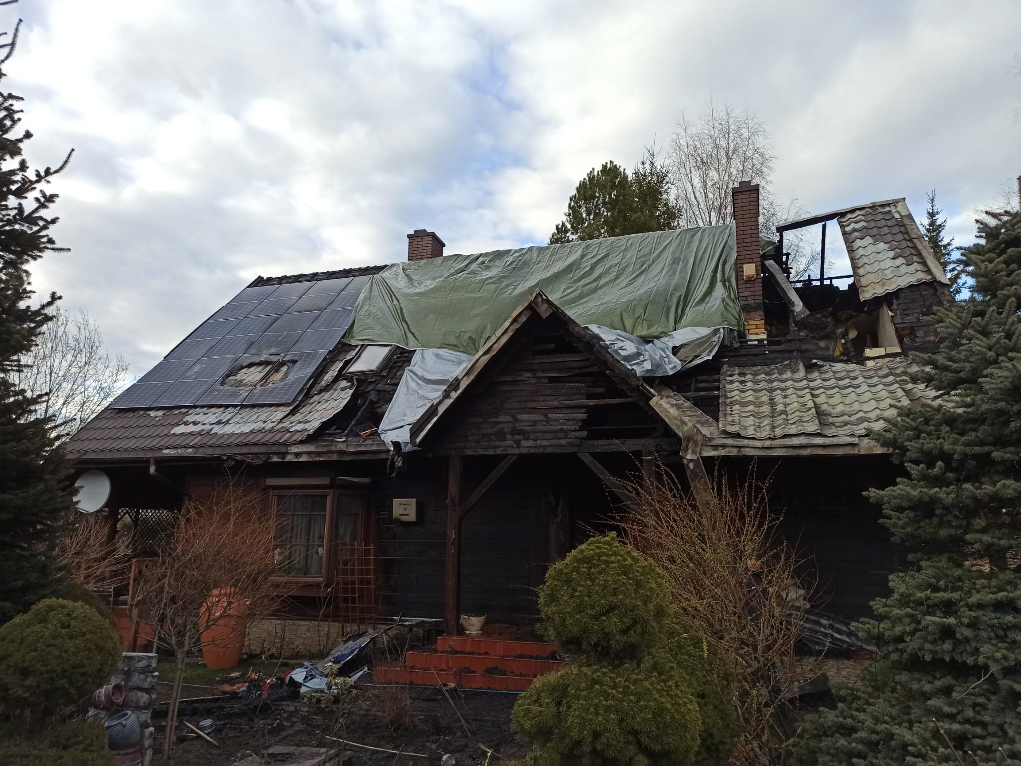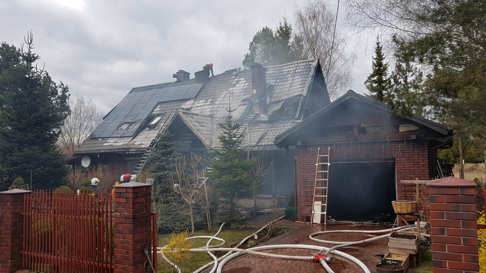 Na miejscu zdarzenia stwierdzono rozwinięty pożar drewnianego budynku jednorodzinnego. Na części połaci dachowej zainstalowana była instalacja fotowoltaiczna. W trakcie powstania pożaru w domu przebywał właściciel, który samodzielnie ewakuował się na zewnątrz przed przybyciem pierwszego zastępu gaśniczego. Po przebadaniu przez Zespół Ratownictwa Medycznego, mężczyzna został przetransportowany do szpitala w celu przeprowadzenia dalszych badań.