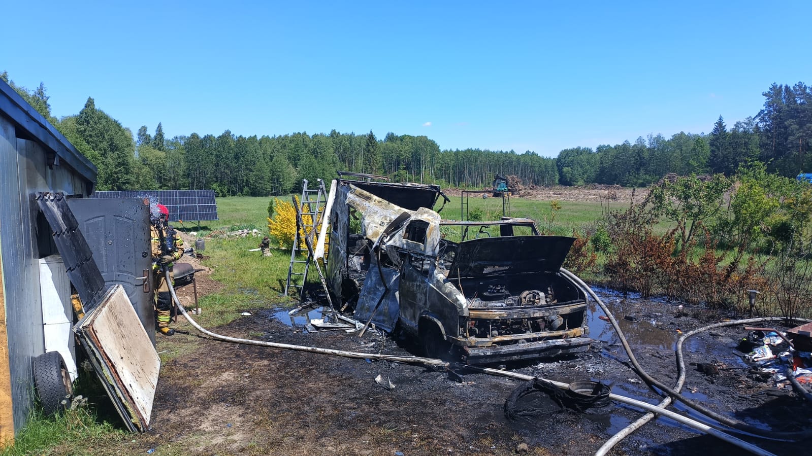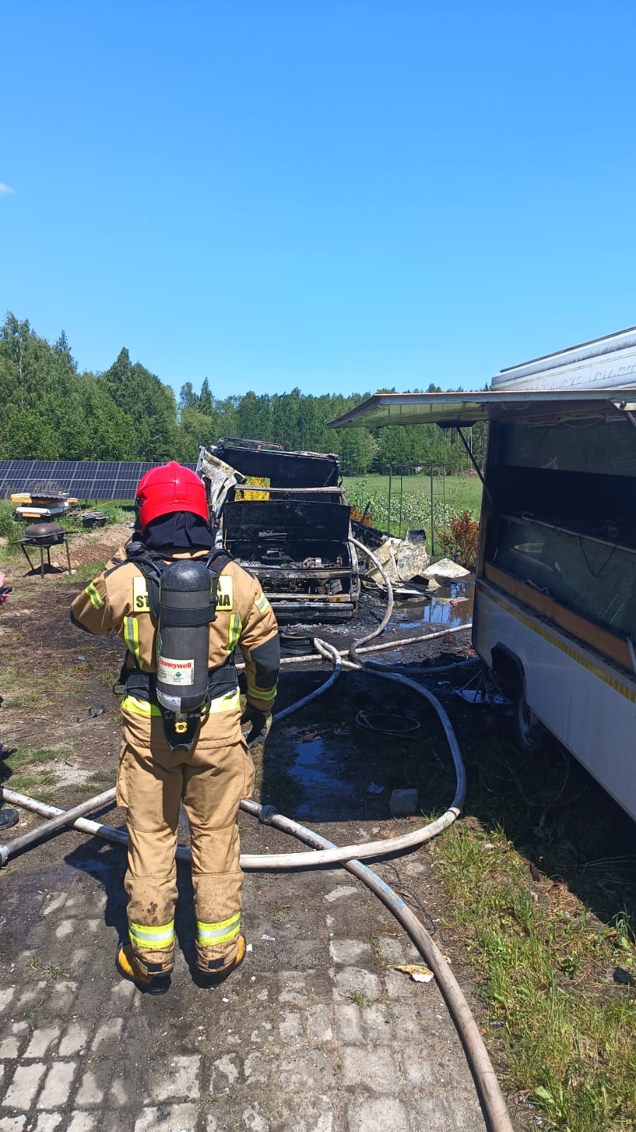 Na miejsce zdarzenia zadysponowano zastępy ratowniczo-gaśnicze z Państwowej oraz Ochotniczej Straży Pożarnej. W trakcie dojazdu Straży Pożarnej widoczne było intensywne zadymienie. Po przybyciu ratowników stwierdzono rozwinięty pożar samochodu osobowego typu kamper. Pożarem częściowo objęty tył pojazdu dostawczego. Działania Straży skupiły się na gaszeniu zastanego pożaru, a pracujący ratownicy zabezpieczeni byli w sprzęt ochrony układu oddechowego. W trakcie działań z jednego z samochodów objętych pożarem wyniesiono 1 butlę propan-butan. Po stwierdzeniu braku znamion wpływu ognia na butle, umieszczono je w bezpiecznym miejscu. Po ugaszeniu pożaru przystąpiono do niezbędnych prac rozbiórkowych połączonych z przeszukaniem i dogaszaniem znalezionych zarzewi ognia. Stwierdzono, że na dachu spalonego pojazdu znajdowały się panele fotowoltaiczne, które w wyniku zdarzenia zostały doszczętnie zniszczone. Po likwidacji zagrożenia, działania zakończono.