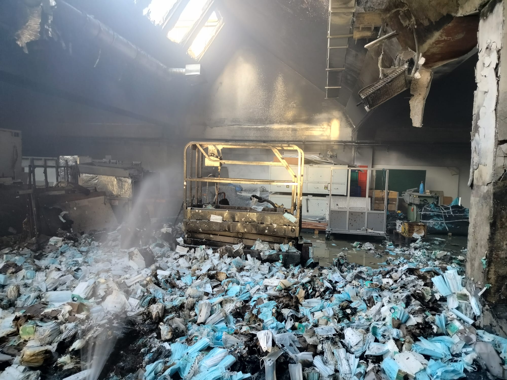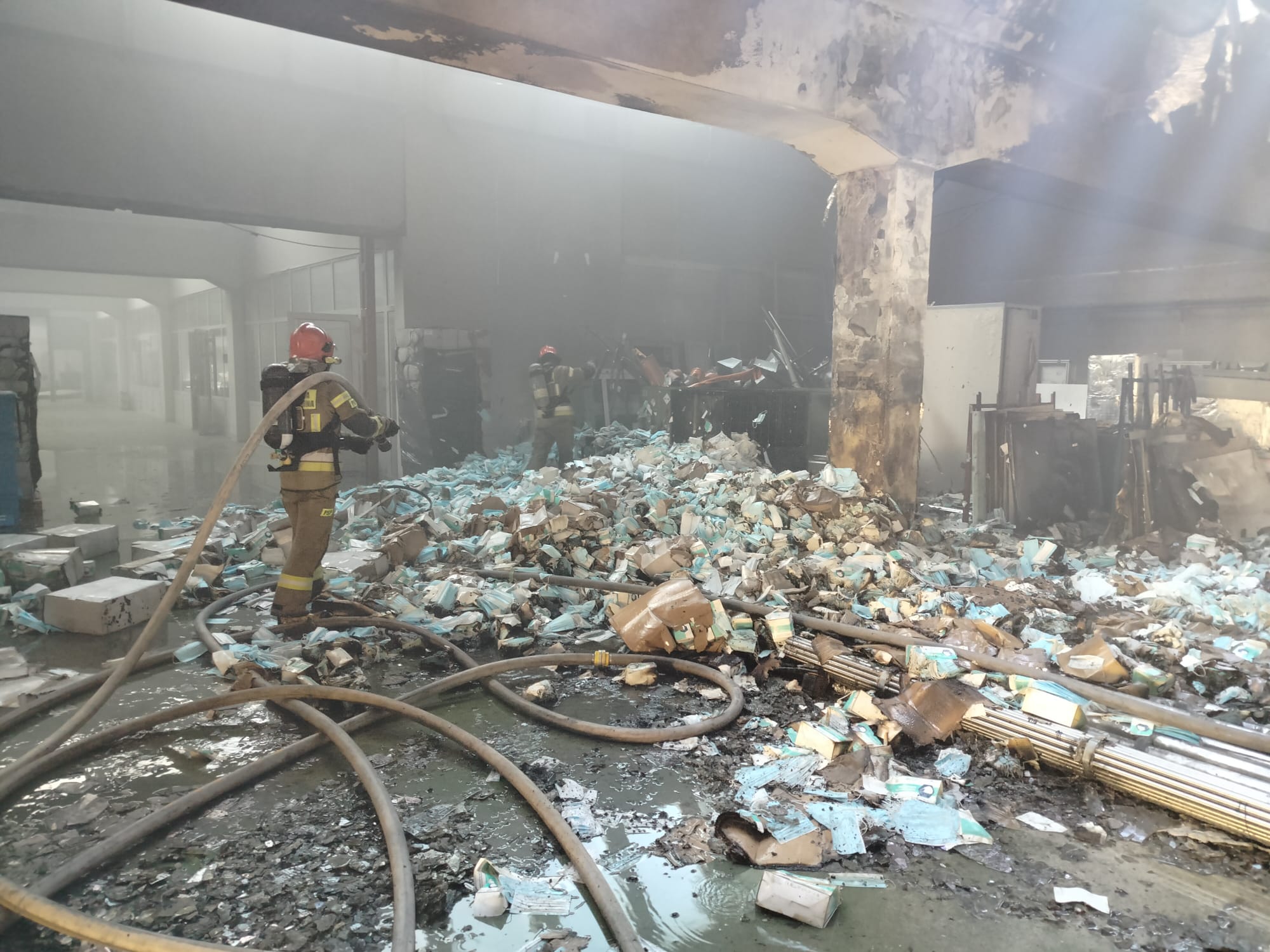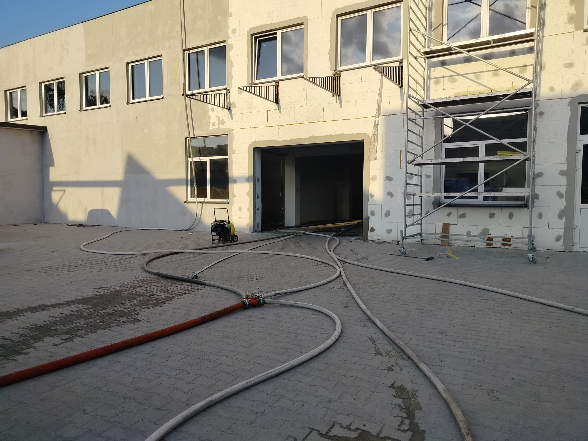 Po przybyciu na miejsce zdarzenia pierwszych funkcjonariuszy Państwowej Straży Pożarnej okazało się, że pożarem objęta jest część magazynowa budynku z widocznym czarnym dymem wydobywającym się z dachu obiektu oraz przez bramę magazynową. Wszyscy pracownicy opuścili budynek przed przyjazdem straży pożarnej i nie uskarżali się na jakiekolwiek dolegliwości związane ze zdarzeniem. Budynek murowany kryty papą, wyposażony w instalację elektryczną, na dachu znajdowały się panele fotowoltaiczne niezagrożone pożarem. Działania ratowników polegały na zabezpieczeniu miejsca zdarzenia oraz w pierwszej fazie podaniu 1 prądu wody do wewnątrz budynku w natarciu na źródło ognia przez otwarte duże drzwi garażowe. Po dojeździe kolejnych zastępów wprowadzono dwa prądy wody do środka budynku i jeden na dach hali przy użyciu drabiny przystawnej. W trakcie działań przybyły na miejsce zakład energetyczny poinformował Kierującego Działaniami Ratowniczymi o odłączeniu zasilania do budynku. W kulminacyjnym momencie działań podawano 3 prądy gaśnicze w natarciu i jeden w obronie (jeden na dach budynku oraz trzy do jego wnętrza). Po zlokalizowaniu pożaru przystąpiono do przelewania ukrytych zarzewi ognia oraz sprawdzenia pomieszczeń budynku z jednoczesnym ich oddymianiem. Po zakończeniu działań obiekt sprawdzono miernikiem wielogazowym i kamerą termowizyjną.