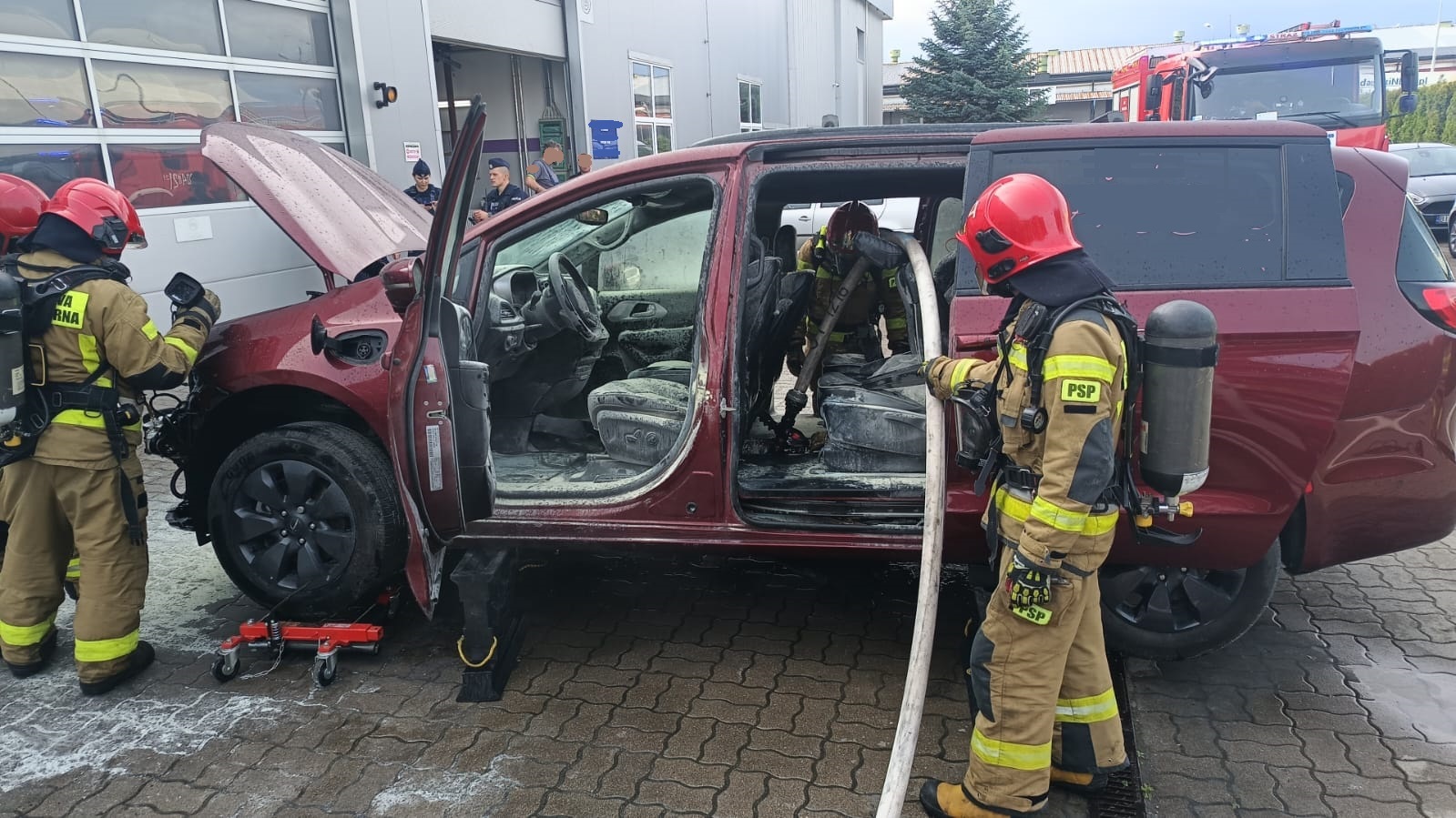 W chwili przybycia Jednostek Ochrony Przeciwpożarowej, na miejscu zdarzenia zastano pracowników warsztatu samochodowego, którzy podjęli próbę ugaszenia pożaru samochodu hybrydowego przy pomocy gaśnic proszkowych. Po przeprowadzeniu rozpoznania ustalono, że doszło do zwarcia instalacji elektrycznej wysokiego napięcia w samochodzie hybrydowym Chrysler Pacifica typu Plug In.