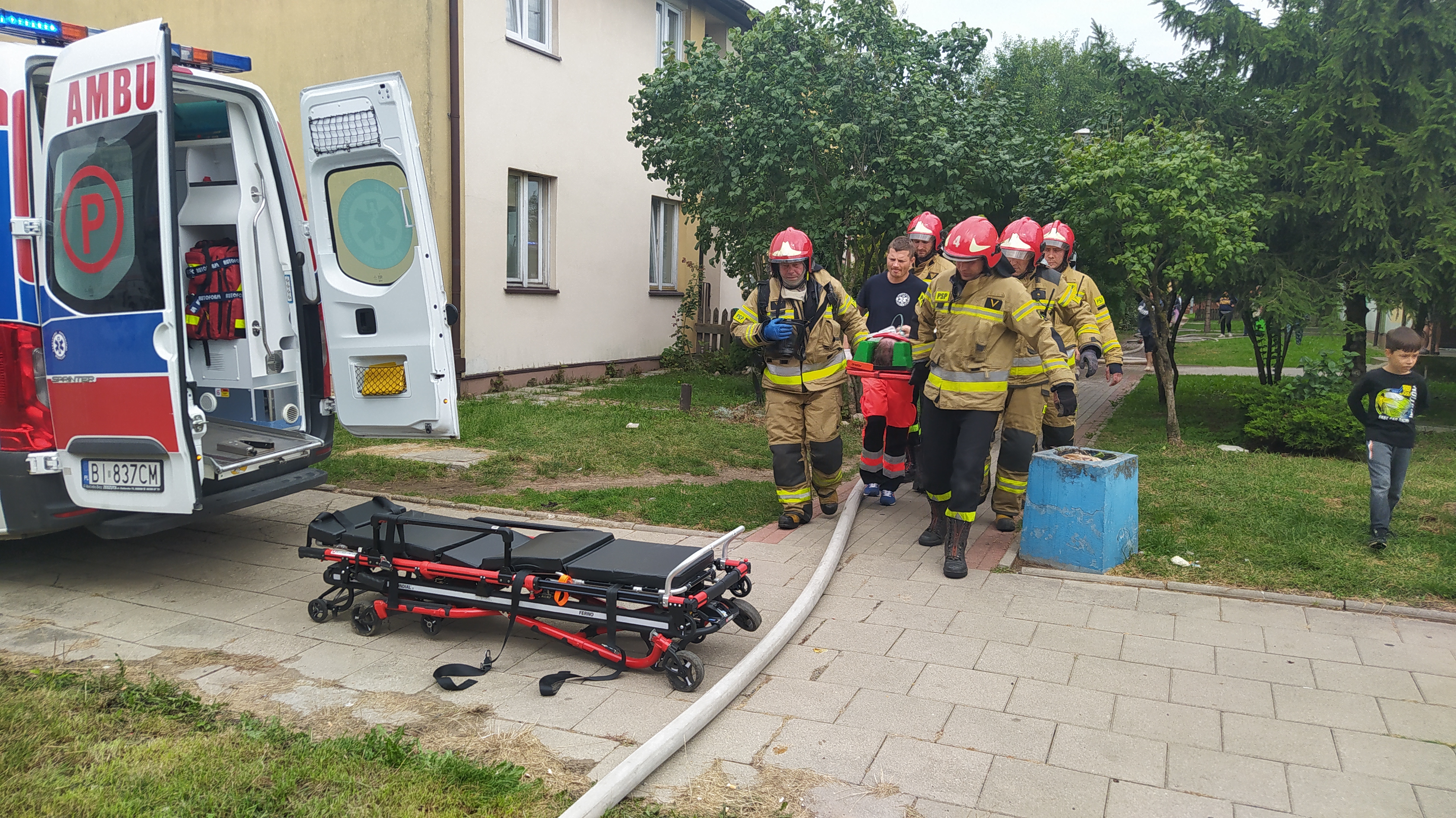 Po dotarciu na miejsce pierwszych zastępów zastano dym wydobywający się z okna na I piętrze. Otrzymano informację od mieszkańców, że w środku może ktoś przebywać. Działania Straży Pożarnej polegały na wyważeniu drzwi do mieszkania. Ratownicy zabezpieczeni w sprzęt ochrony układu oddechowego oraz linię gaśniczą weszli do środka. W mieszkaniu zastano duże zadymienie oraz płomienie widoczne w salonie. Na podłodze zastano leżącą starszą kobietę, którą natychmiast ewakuowano na zewnątrz. Strażacy udzielili jej kwalifikowanej pierwszej pomocy. Kobieta szybko odzyskała przytomność, brak widocznych obrażeń. Przeszukiwano pozostałe pomieszczenia z równoczesnym dogaszaniem pożaru, nie znaleziono więcej osób poszkodowanych. Po przybyciu na miejsce ZRM udzielono pomocy w transporcie poszkodowanej do karetki, która następnie została zabrana na SOR. Budynek oddymiono i sprawdzono miernikiem wielogazowym, sprawdzono również pozostałe mieszkanie na I piętrze, nikt więcej nie został poszkodowany. W działaniach udział brało 15 strażaków i 5 pojazdów Straży Pożarnej.