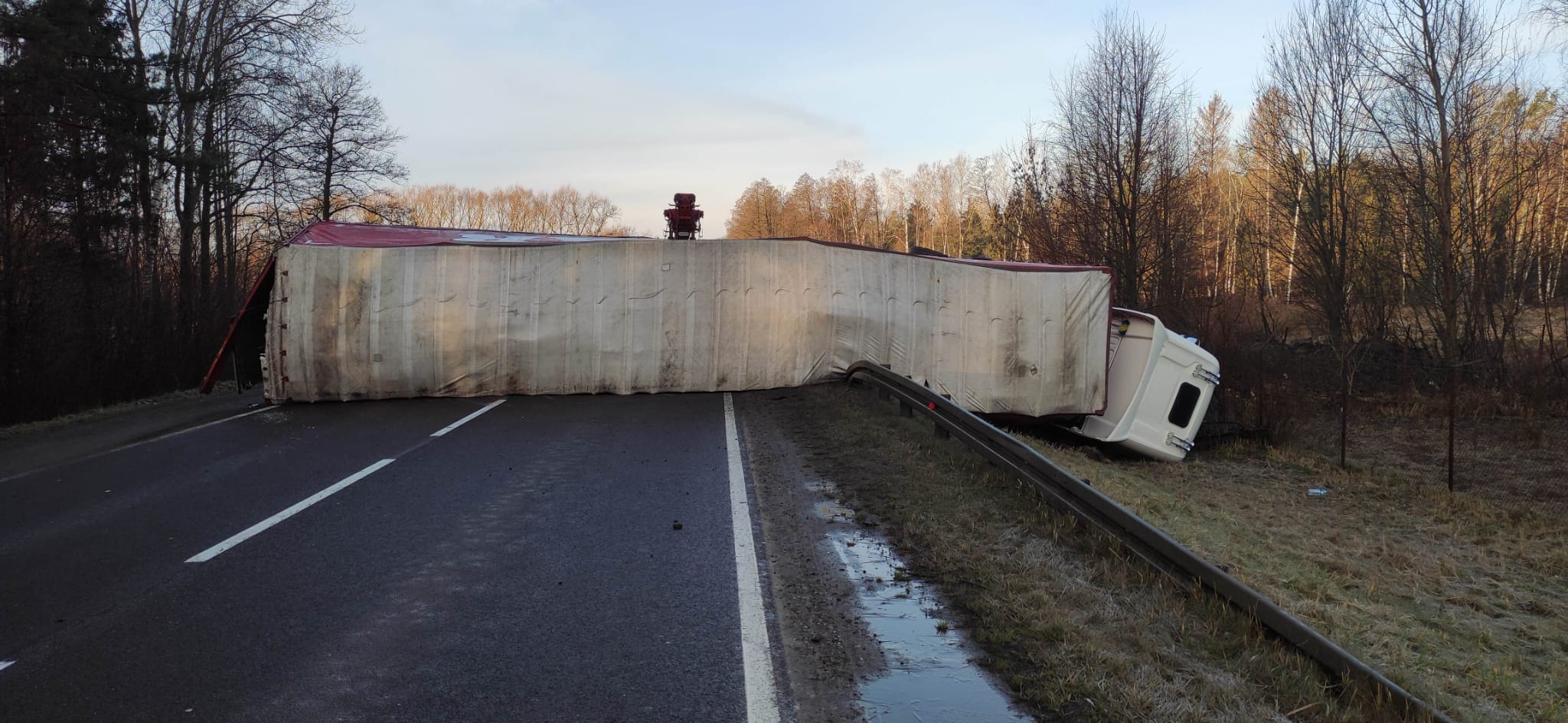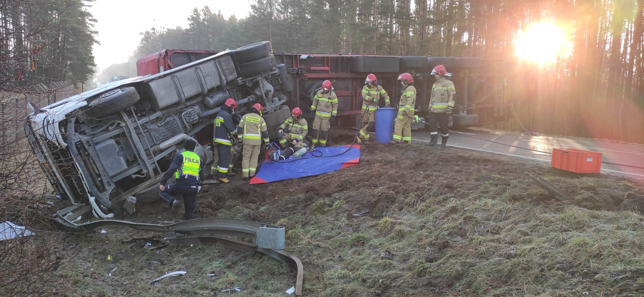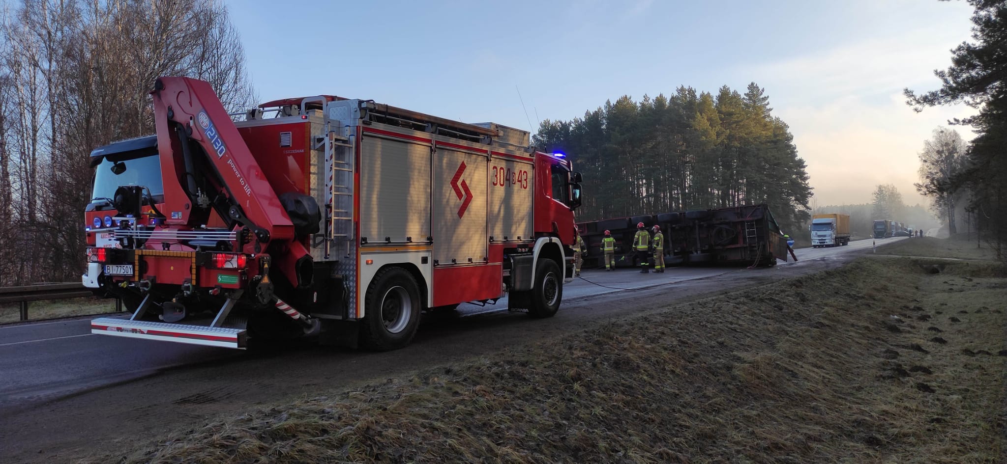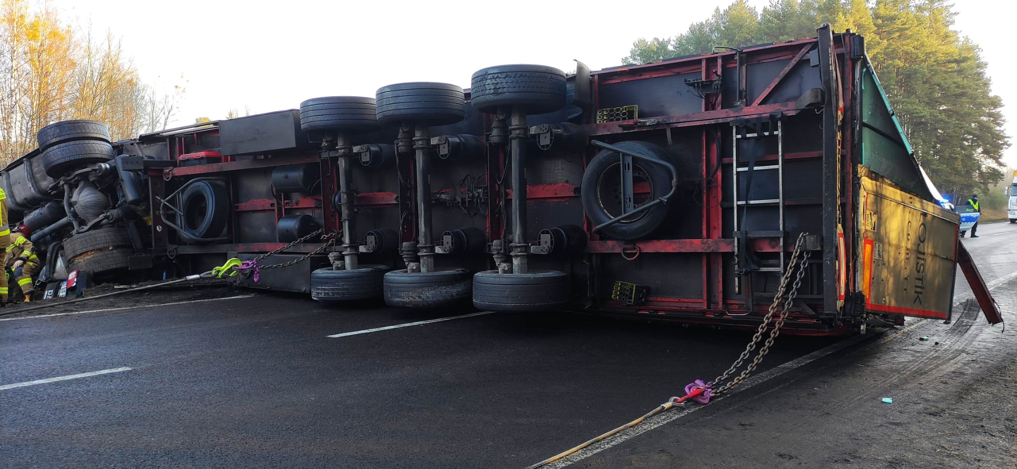 Jednym z nich był przewrócony ciągnik siodłowy wraz z naczepą, leżący na prawym boku w poprzek drogi krajowej nr 65 w miejscowości Sobolewo. Droga była zablokowana w obu kierunkach. W naczepie znajdowało się około 22 ton materiałów tekstylnych w rolkach, które częściowo znajdowały się na drodze. Stwierdzono również niewielkie uszkodzenie zbiornika paliwa, z którego wyciekał olej napędowy. Działania pierwszego zastępu polegały na zabezpieczeniu miejsca zdarzenia oraz zadysponowaniu dodatkowych sił i środków (Samochód Ciężki Ratownictwa Chemicznego, Samochód Ciężki Ratownictwa Technicznego oraz Samochód Ciężki Ratownictwa Technicznego typu MEGA-CITY (holownik)). Po dojeździe Samochodu Ciężkiego Ratownictwa Chemicznego sprawiono zestaw składający się z pompy pneumatycznej i przepompowano z uszkodzonego zbiornika do beczki około 50 litrów oleju napędowego. Po dojeździe kolejnych zastępów przystąpiono do postawienia na koła ciągnika siodłowego wraz z naczepą przy użyciu 2 wyciągarek z pojazdu ratownictwa technicznego MEGA-CITY oraz wyciągarki z pojazdu ratownictwa technicznego Scania. Po postawieniu na koła pojazdu oraz odłączeniu akumulatorów, odciągnięto go na pas drogi w kierunku Białegostoku, udrożniając pas drogi w kierunku Bobrownik.