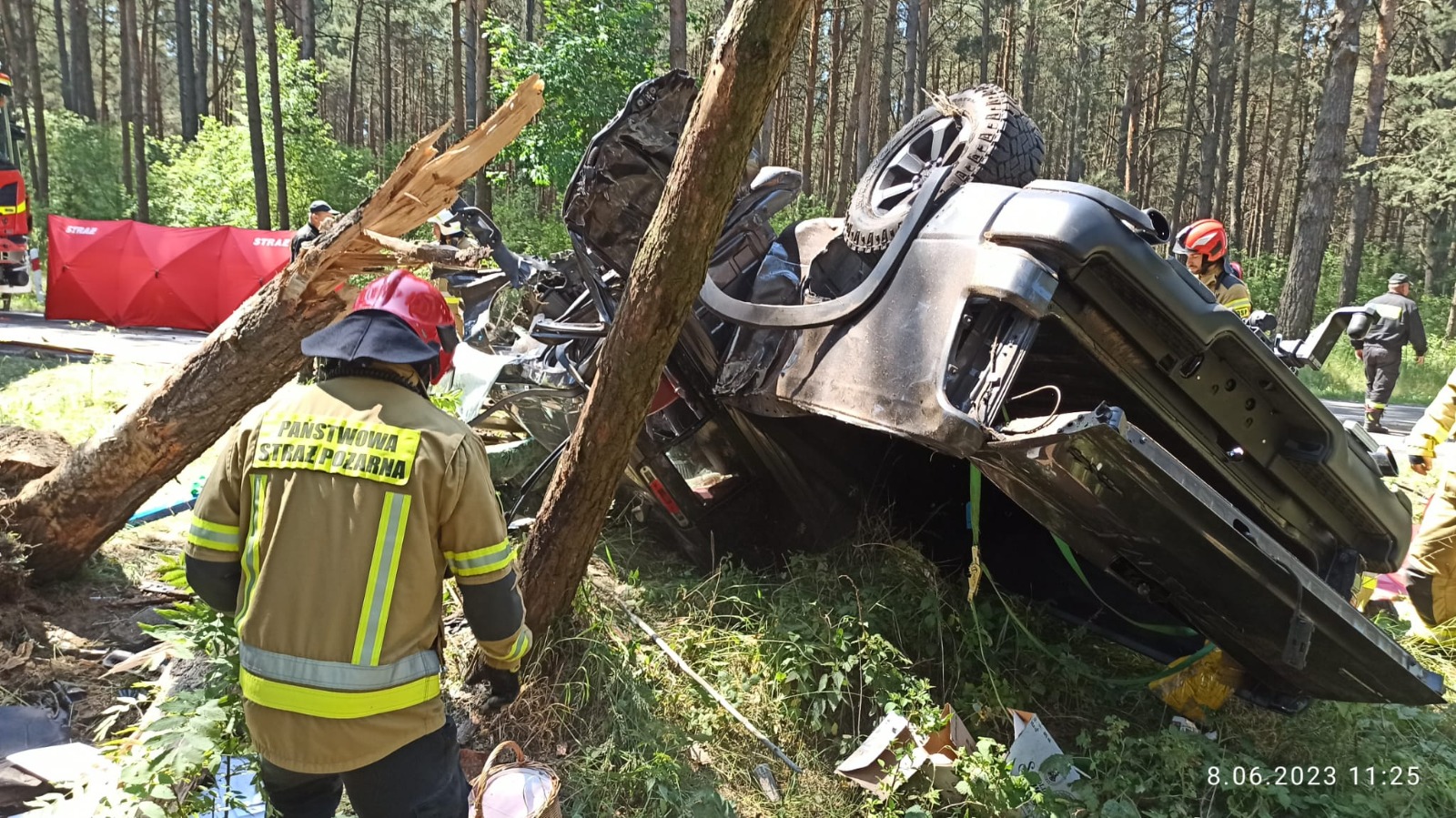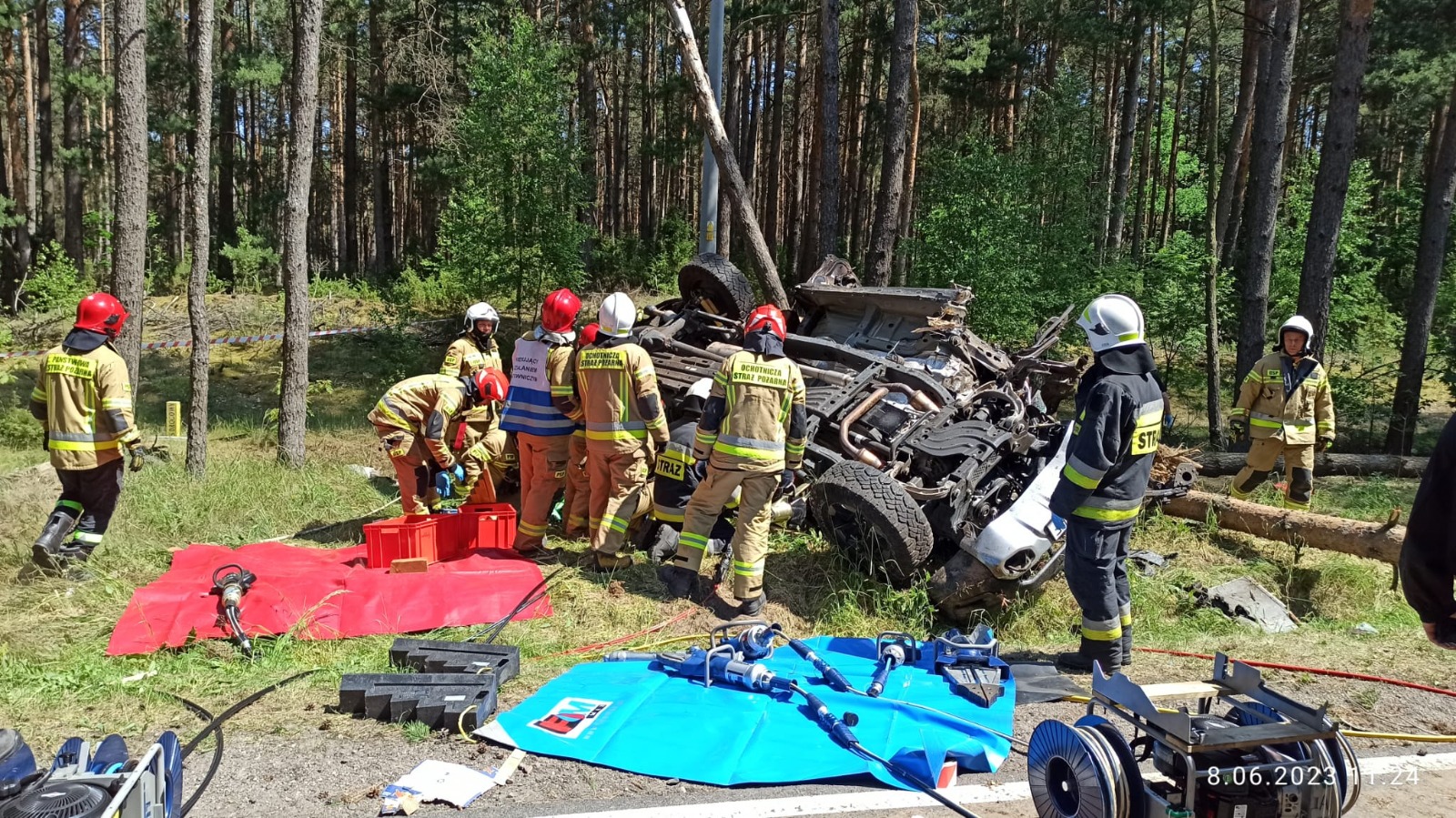 Po przyjeździe na miejsce zdarzenia pierwszego zastępu jednostki ochrony przeciwpożarowej zastano samochód osobowy po dachowaniu. Pojazdem podróżowały 2 osoby dorosłe i dziecko. Osoby dorosłe były zakleszczone w aucie natomiast dziecko znajdowało się poza autem. Strażacy uwolnili jedną z zakleszczonych osób i przekazali ją oraz dziecko przybyłemu na miejsce Zespołowi Ratownictwa Medycznego. Po wykonaniu przy użyciu sprzętu hydraulicznego dostępu do drugiej osoby, ZRM przebadał poszkodowanego i stwierdził jego zgon. Pozostałe osoby poszkodowane zostały przetransportowane śmigłowcem oraz karetką do szpitali, w celu przeprowadzenia dalszych badań.