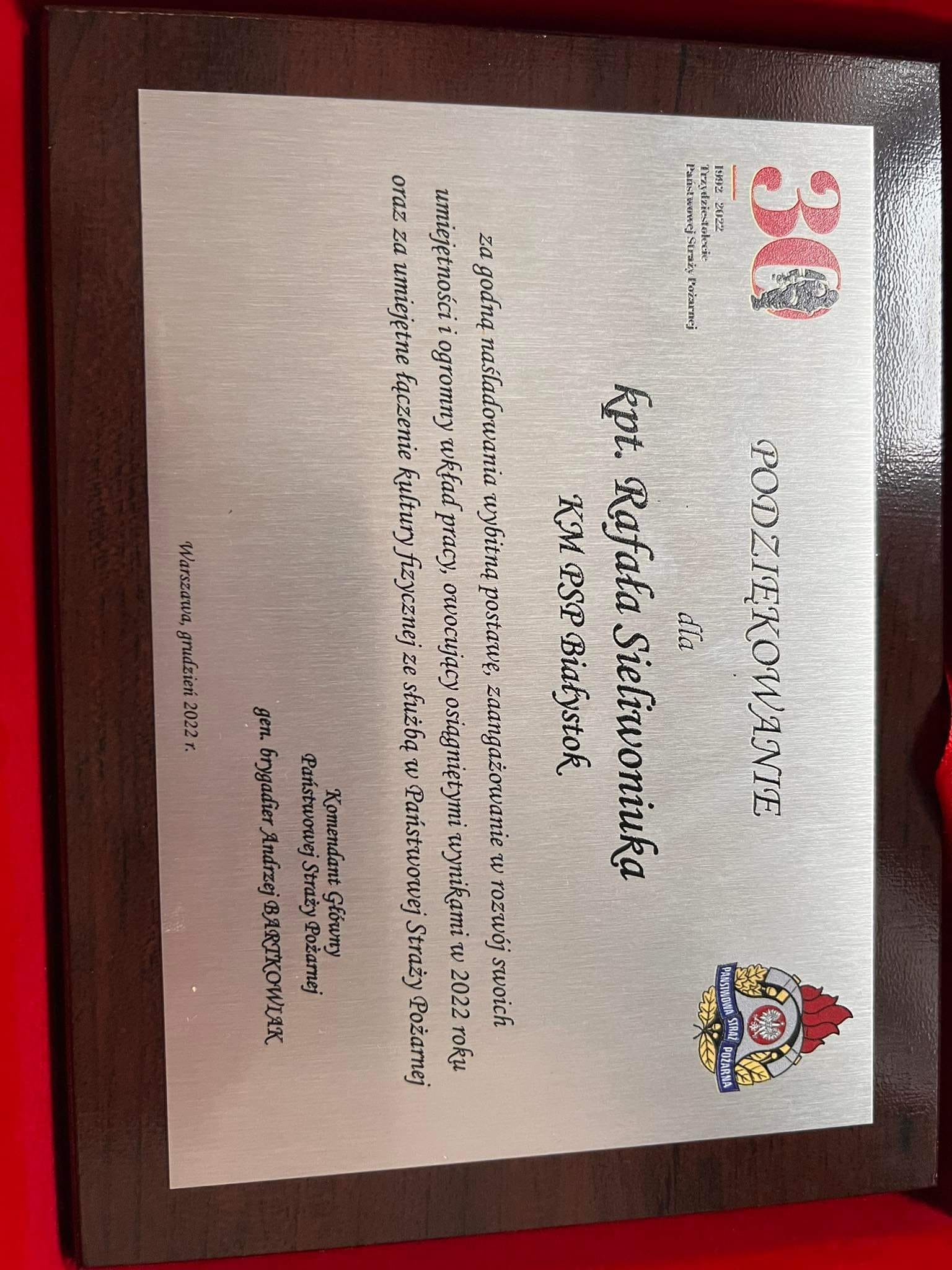 W dniu 1 grudnia 2022 roku funkcjonariusz KM PSP w Białymstoku kpt. Rafał Sieliwoniuk brał udział w spotkaniu wyróżniających się strażaków – sportowców z całego kraju, które odbyło się w Komendzie Głównej Państwowej Straży Pożarnej w Warszawie.