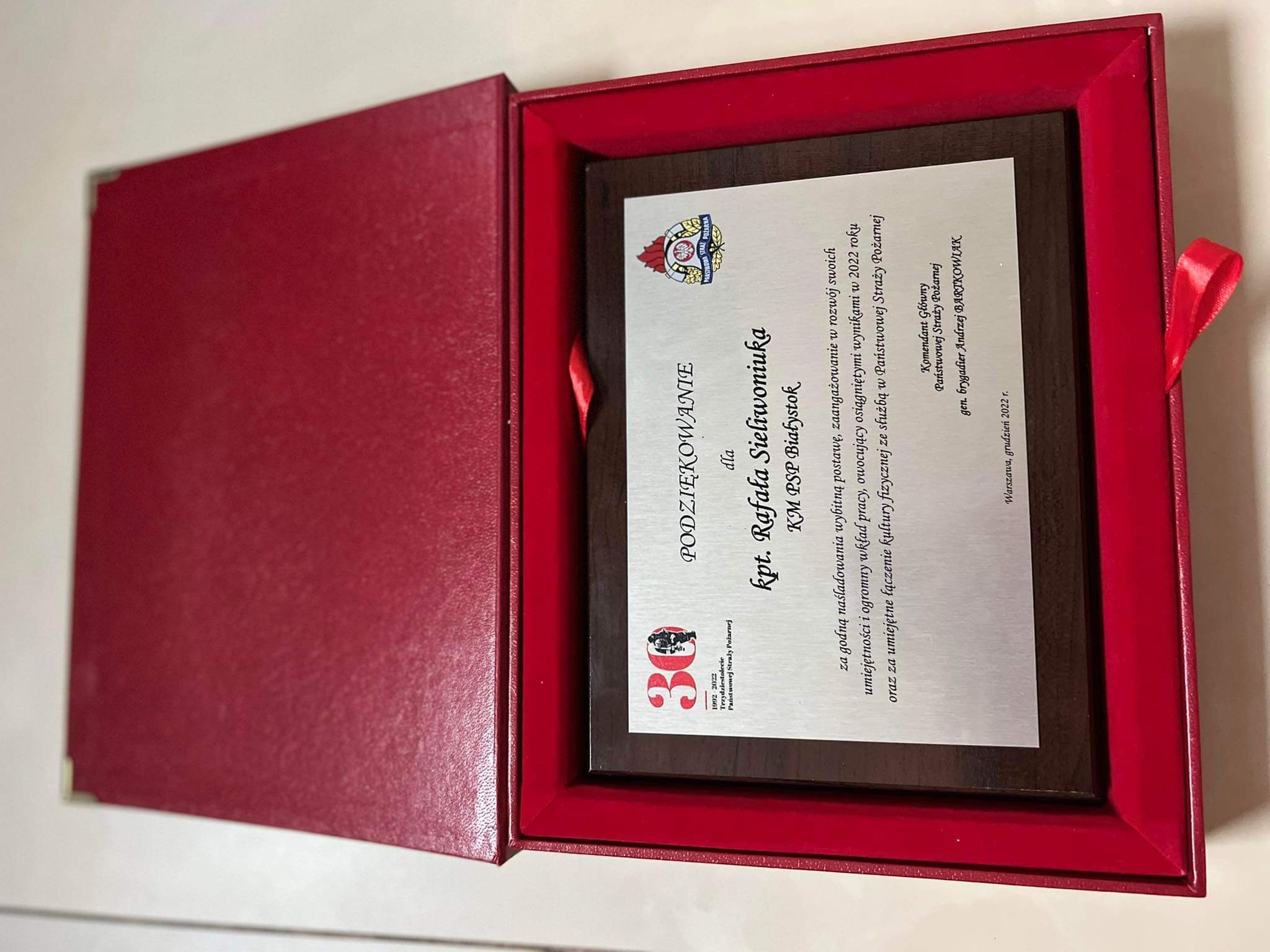- powołanie do reprezentacji województwa podlaskiego na XXX Świętokrzyski Turniej w Dwuboju Pożarniczym, który odbył się 2 czerwca 2022 roku. Funkcjonariusz Komendy Miejskiej PSP w Białymstoku zwyciężył w każdej konkurencji ww. Turnieju. Pożarniczy tor przeszkód 100 m pokonał w czasie 17,36 s., a wspinanie przy użyciu drabiny hakowej na trzecie piętro zajęło mu 14,92 s. Dzięki tym czasom zwyciężył w klasyfikacji indywidualnej. Zdobył 3 puchary oraz nagrody rzeczowe,