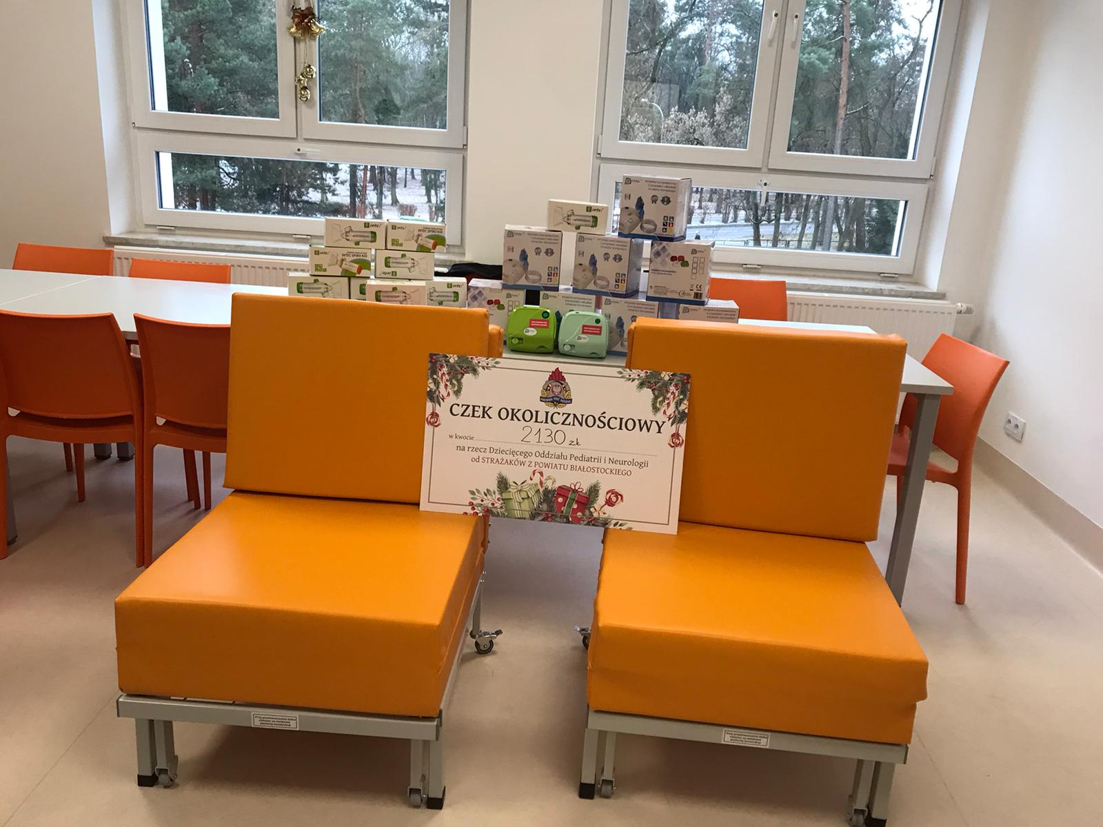 W sumie udało się zebrać 8970 złotych! Dziękujemy za uczestnictwo w zbiórce Komendzie Miejskiej PSP w Białymstoku i wszystkim JRG podległym KM PSP w Białymstoku. Za powyższą kwotę zostały zakupione dwa łóżka szpitalne „Bożenka” jest to łóżko-fotel dla rodziców, którzy przebywają ze swoimi dziećmi w szpitalu. Zakupiliśmy również radioodtwarzacz do świetlicy szpitalnej, 10 inhalatorów i 14 komór inhalacyjnych do podawania leków wziewnych. Przygotowaliśmy również 20 paczek dla dzieci przebywających w szpitalu w czasie świąt, pozostała kwota 2130 zł. została przekazana w gotówce na ręce pani ordynator lek. med. Grażyna Nawara, pieniądze te pozwolą na uzupełnianie braków w świetlicy szpitalnej.