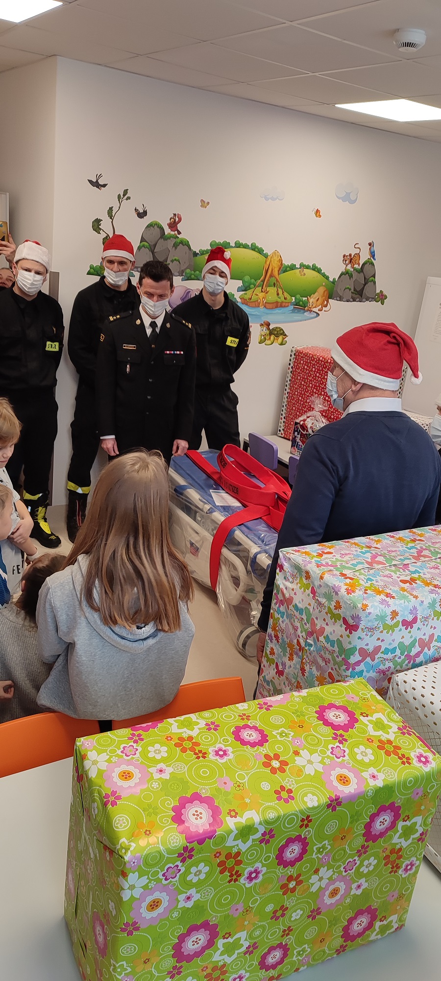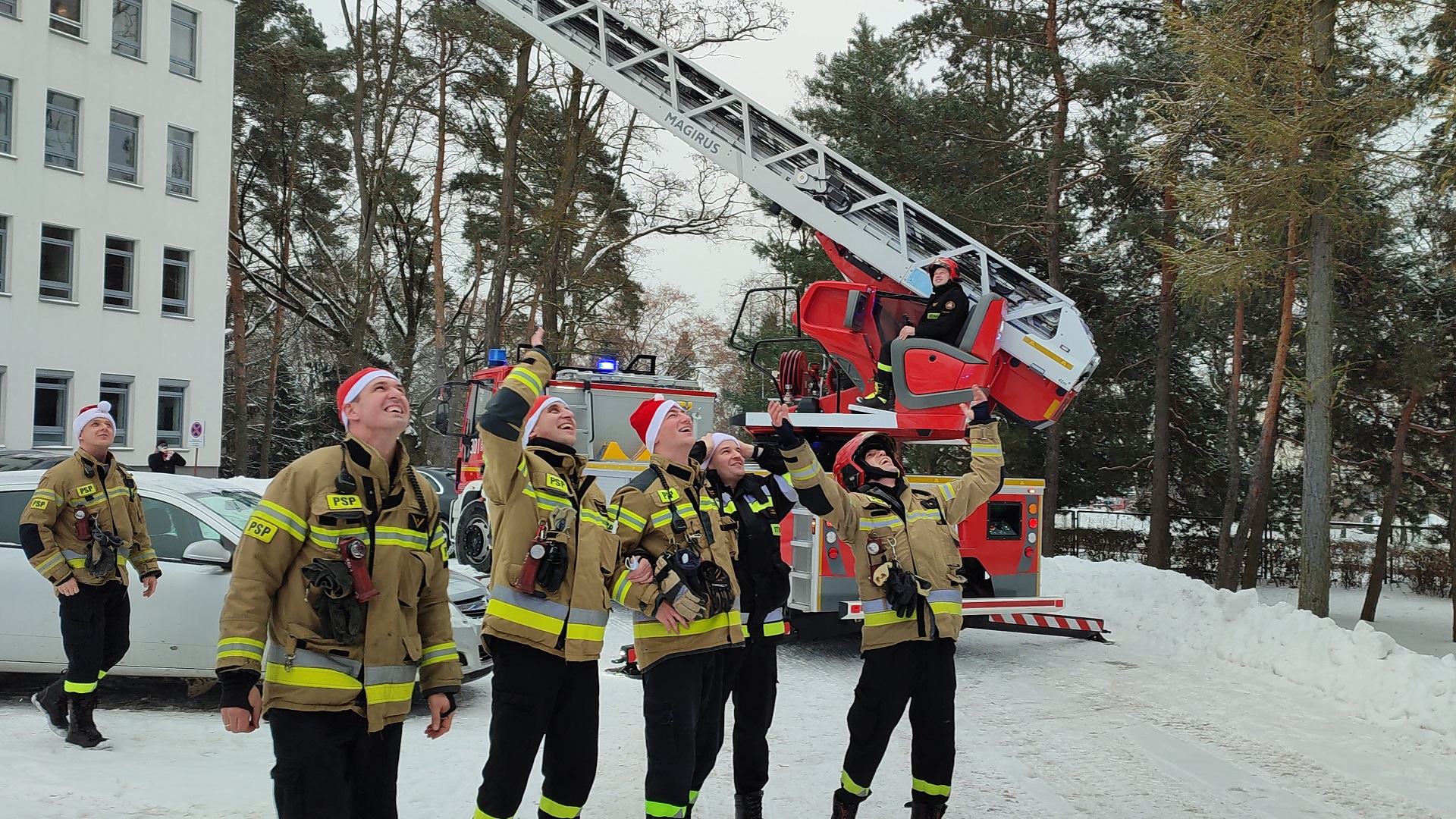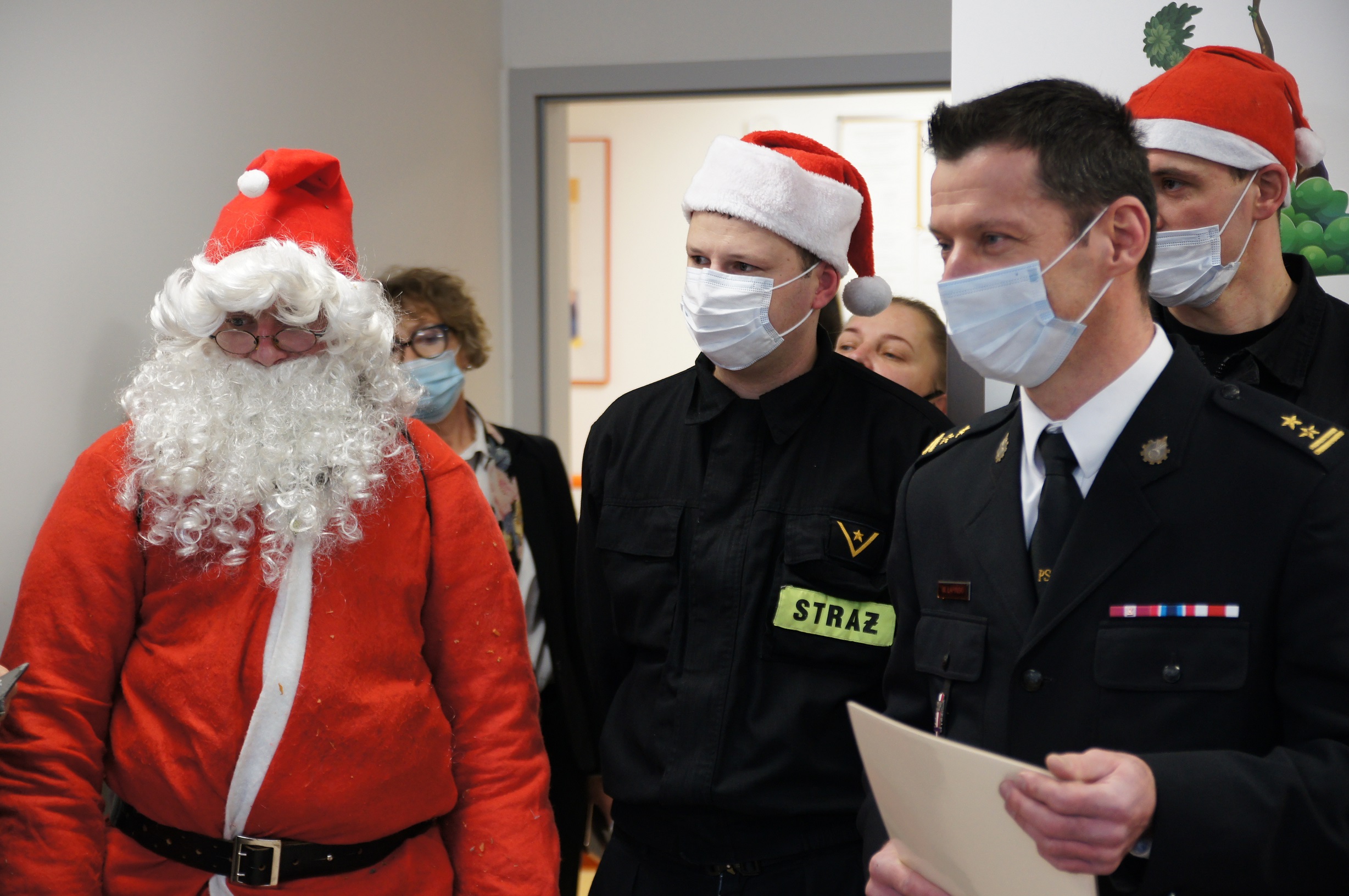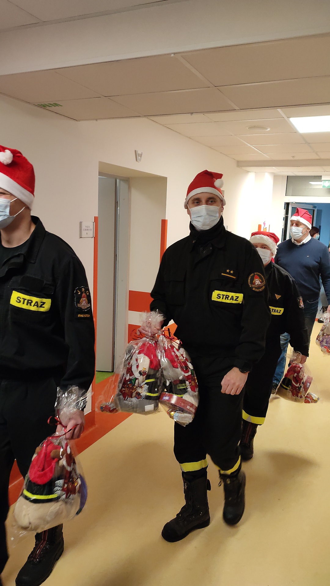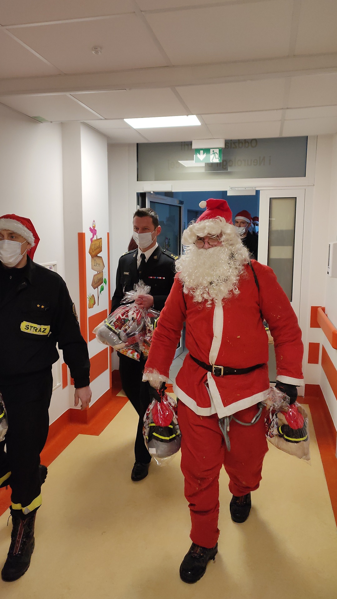 Przybyłe na miejsce zastępy potwierdziły tą informację i niezwłocznie przystąpiły do ratowania Świętego Mikołaja. Całym działaniom przyglądały się przez okna dzieci z Oddziału Pediatrii i Neurologii Dziecięcej. To dla nich został przygotowany ten spektakl, aby choć na chwilę zapomniały o problemach zdrowotnych, a na ich twarzy pojawił się uśmiech i radość z tej nietypowej sytuacji. Uratowany Święty Mikołaj, razem ze swoimi pomocnikami strażakami udał się na oddział, gdzie wręczył dzieciom prezenty.