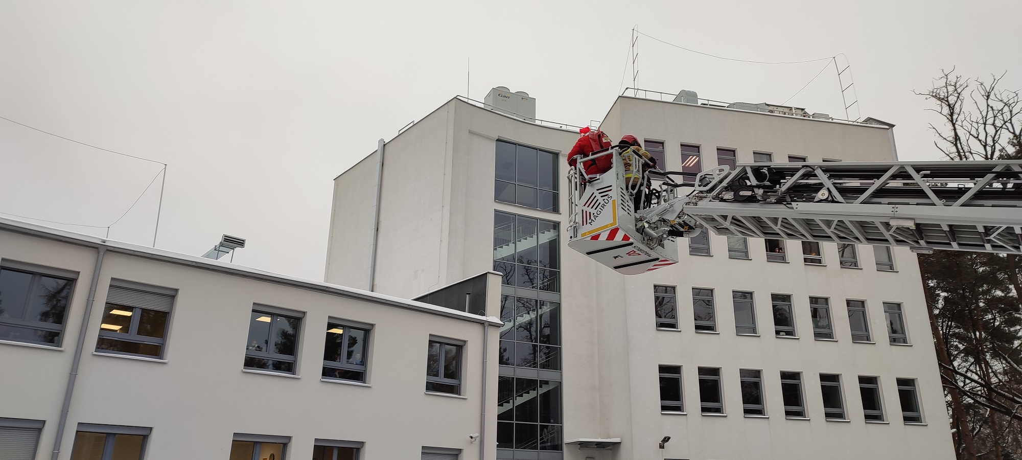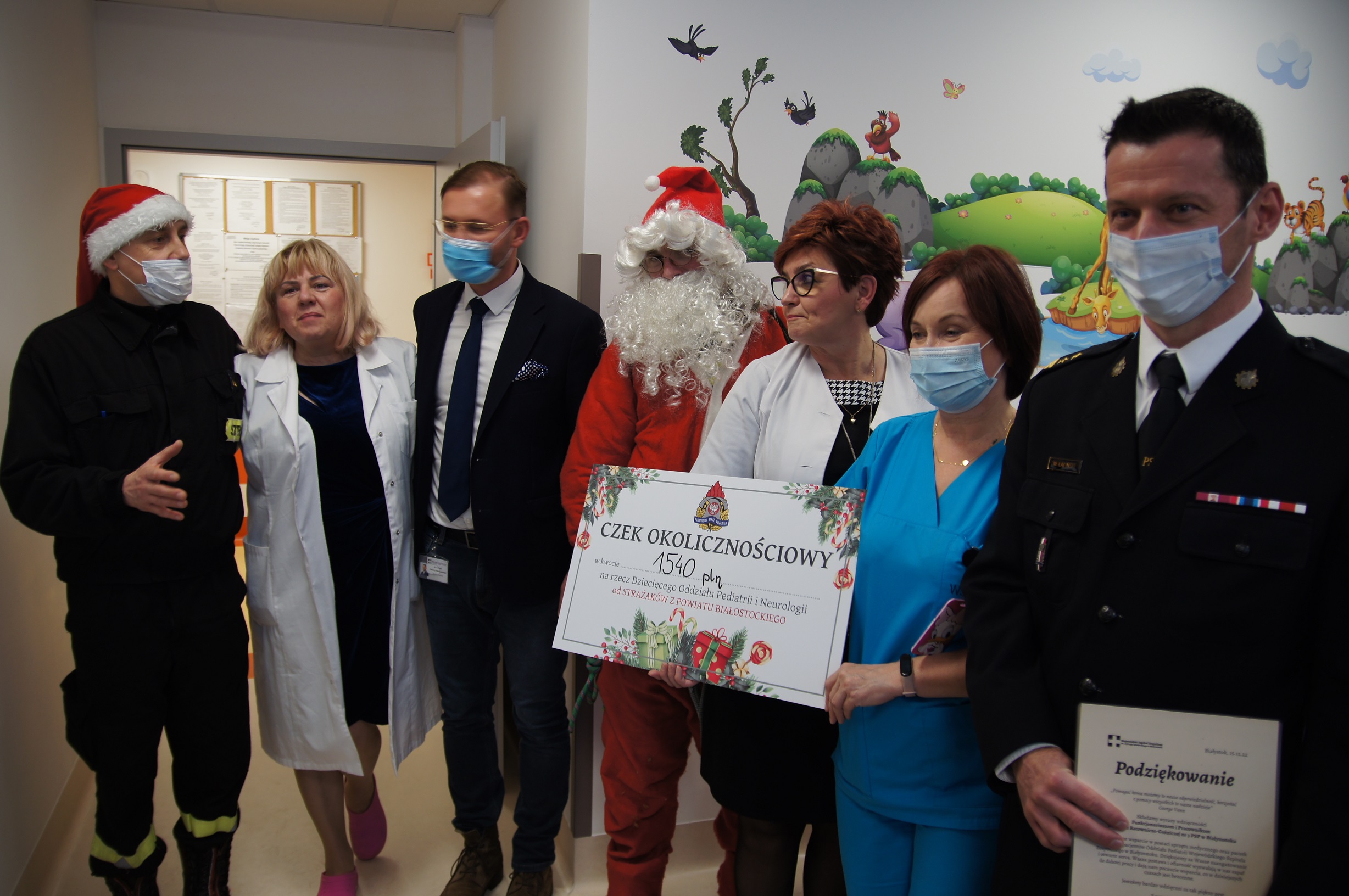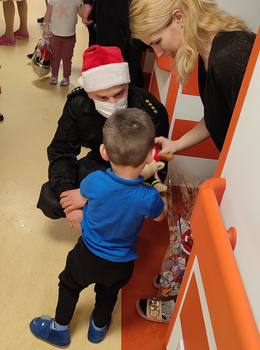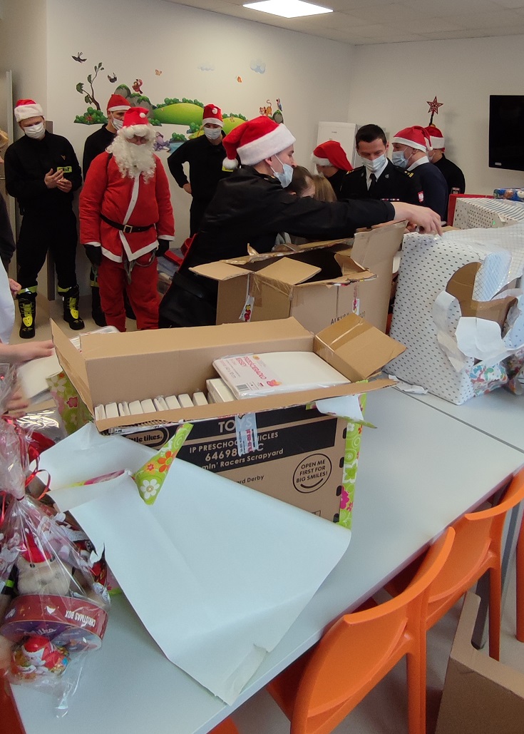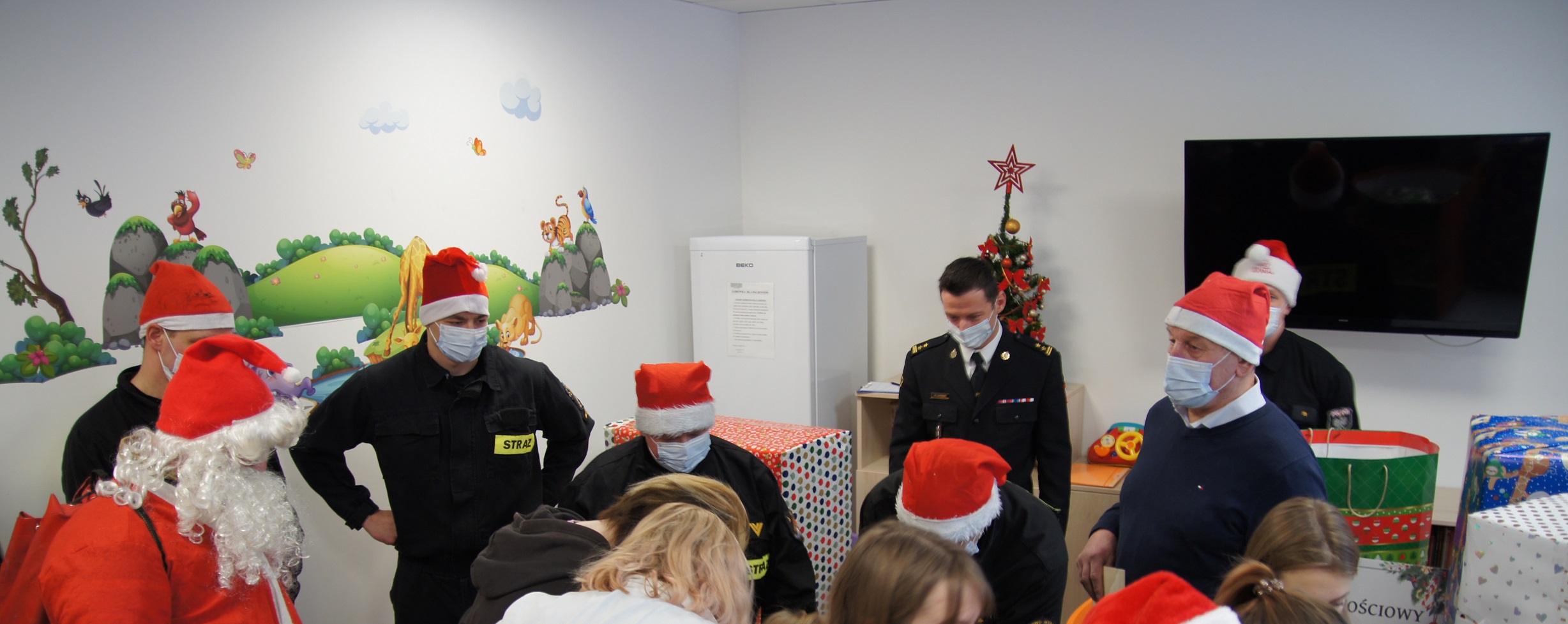 Przybyłe na miejsce zastępy potwierdziły tą informację i niezwłocznie przystąpiły do ratowania Świętego Mikołaja. Całym działaniom przyglądały się przez okna dzieci z Oddziału Pediatrii i Neurologii Dziecięcej. To dla nich został przygotowany ten spektakl, aby choć na chwilę zapomniały o problemach zdrowotnych, a na ich twarzy pojawił się uśmiech i radość z tej nietypowej sytuacji. Uratowany Święty Mikołaj, razem ze swoimi pomocnikami strażakami udał się na oddział, gdzie wręczył dzieciom prezenty.