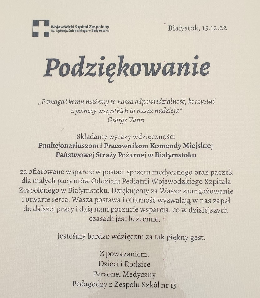 15 grudnia 2022 r. po godz. 10.00 funkcjonariusze Komendy Miejskiej PSP w Białymstoku zostali poinformowani o uwięzionym na drzewie Świętym Mikołaju, na terenie Wojewódzkiego Szpitala Zespolonego im. J. Śniadeckiego w Białymstoku.
