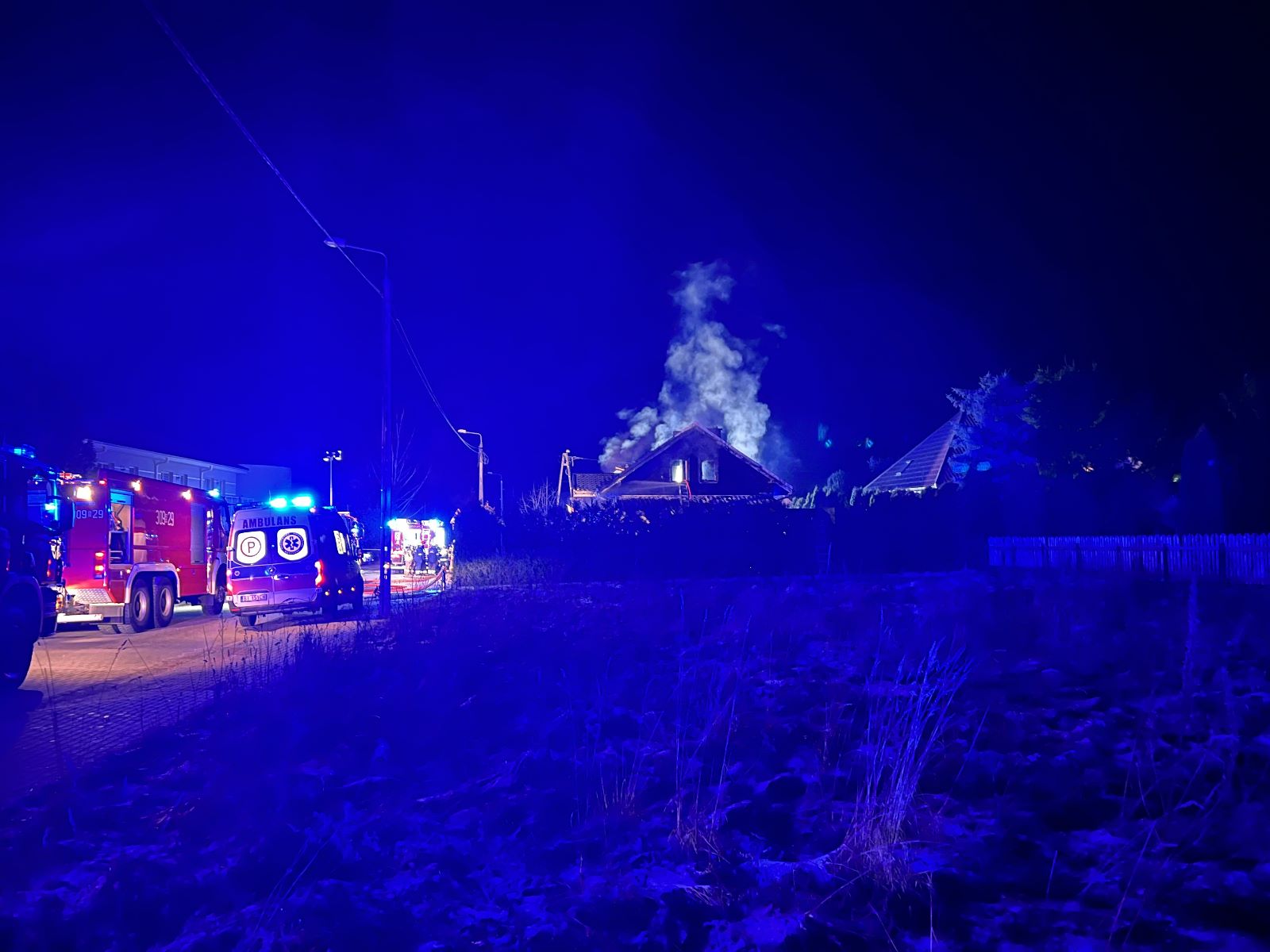 Na miejsce natychmiast zostało zadysponowane 6 zastępów Jednostek Ochrony Przeciwpożarowej. W chwili przybycia pierwszego zastępu zastano rozwinięty pożar domu jednorodzinnego dwukondygnacyjnego. Ogień, który wydostawał się z okien budynku rozprzestrzenił się również na dach domu. Strażacy w celu opanowania pożaru podali 4 prądy gaśnicze do wnętrza palącego się domu. W budynku odłączono również zasilanie gazowe i energetyczne. Po lokalizacji źródła ognia, do wnętrza budynku zostały wprowadzone 3 roty ratowników, zabezpieczonych w sprzęt ochrony układu oddechowego. Strażacy po przeszukaniu budynku odnaleźli w nim 4 osoby poszkodowane (w wieku ok. 3, 8, 10 i 45 lat), które zostały ewakuowane na zewnątrz. U wszystkich ewakuowanych osób będący na miejscu lekarz stwierdził brak funkcji życiowych. Po ugaszeniu ukrytych zarzewi ognia oraz przewietrzeniu budynku, jeszcze raz sprawdzono wszystko za pomocą kamery termowizyjnej oraz mierników wielogazowych – wskazania w normie.
