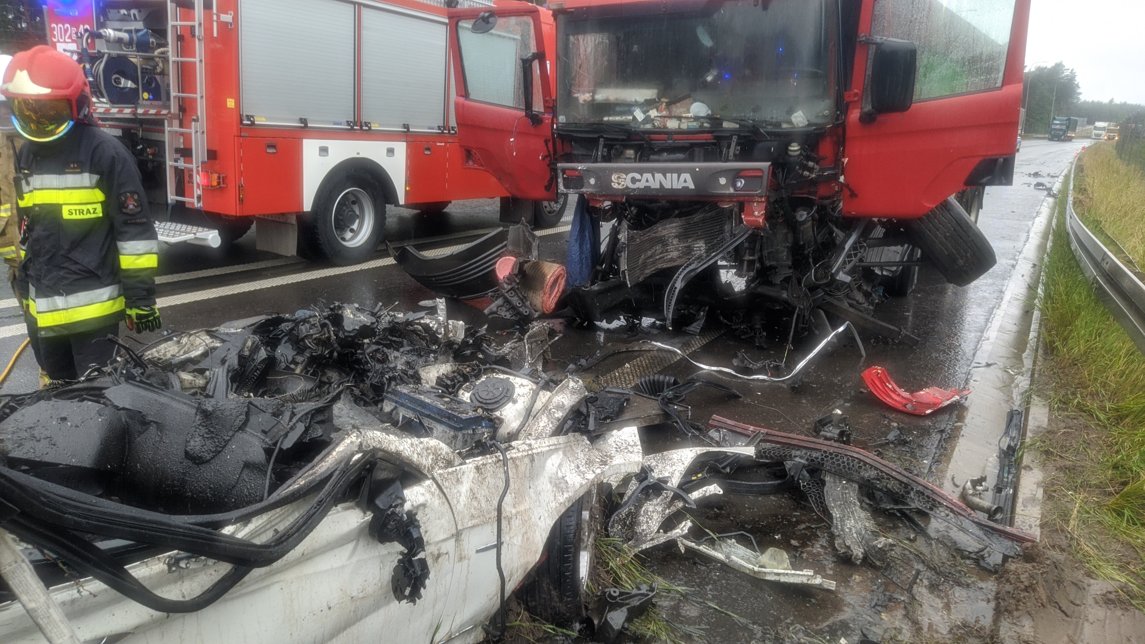 Według świadka zdarzenia, kierujący samochodem osobowym Mercedes stracił panowanie nad pojazdem, po czym zjechał na przeciwległy pas jezdni, gdzie czołowo zderzył się z samochodem ciężarowym Scania. Pojazdami podróżowali tylko kierowcy. W chwili przybycia na miejsce zdarzenia pierwszych zastępów JOP oraz Zespołu Ratownictwa Medycznego, kierujący Mercedesem był uwięziony we wraku swojego pojazdu, częściowo przygniecionym samochodem ciężarowym. Niestety w wyniku zdarzenia kierowca samochodu osobowego zginął na miejscu. Kierujący Scanią, który odniósł w zdarzeniu lekkie obrażenia klatki piersiowej oraz głowy został zabrany przez ZRM do szpitala na dalsze badania.