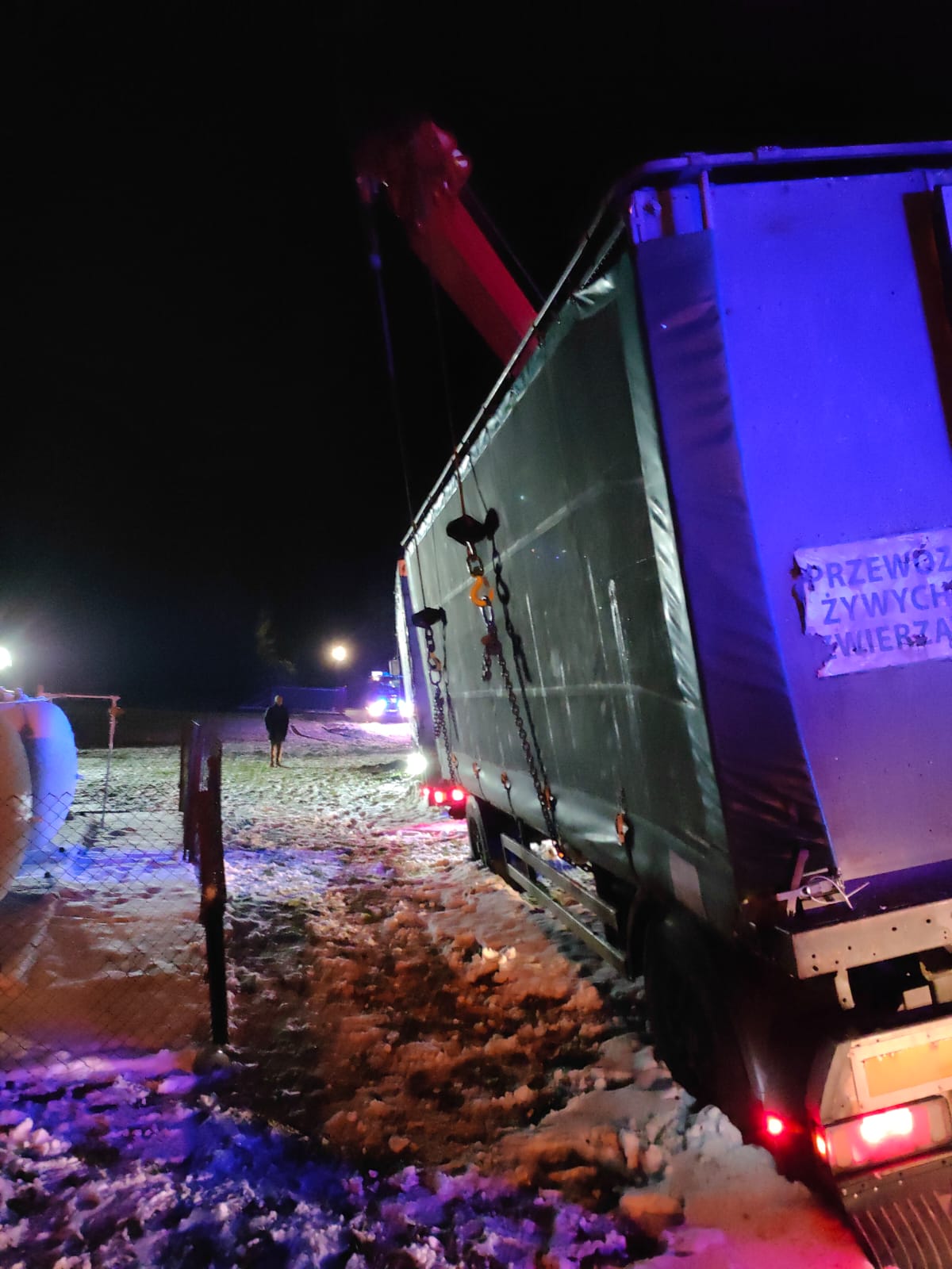 Po dojeździe na miejsce zdarzenia zastano samochód ciężarowy wraz z przyczepą, który zjechał z jezdni drogi prywatnej i na miękkim terenie przechylił się na bok. W przyczepie przewożono indyki w ilości ok. 1770 sztuk. Zestaw niebezpiecznie przechylał się na dwa zbiorniki z gazem o pojemności 6500 l każdy. Działania zastępów z JRG nr 4 KM PSP w Białymstoku polegały na uniesieniu przyczepy, którą następnie wyciągnięto na drogę. Później wyciągnięto również samochód ciężarowy. Po zakończeniu działań kierowca zestawu podpiął przyczepę i dalej mógł kontynuować jazdę.