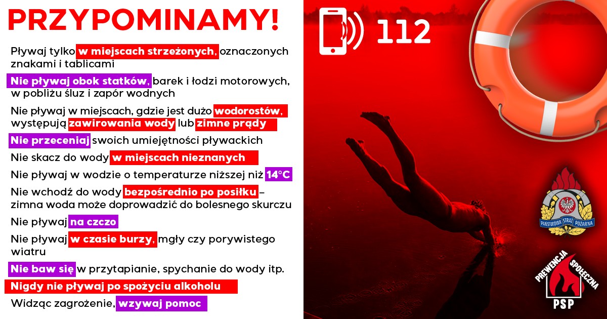 W związku ze zbliżającymi się wakacjami i sezonem wypoczynkowym przypominamy o zasadach bezpiecznego wypoczynku nad wodą. W czerwcowy długi weekend w Polsce utonęło aż 21 osób ! Są to statystyki, które skłaniają do postawienia pytań dotyczących edukacji w zakresie bezpieczeństwa w akwenach wodnych. Wiele osób nie przestrzega podstawowych zasad lub kieruje się brawurą, przez co tracą to, co najcenniejsze - swoje zdrowie i życie.