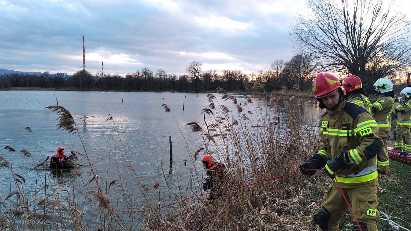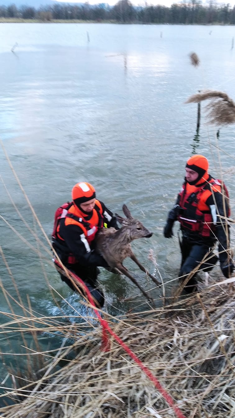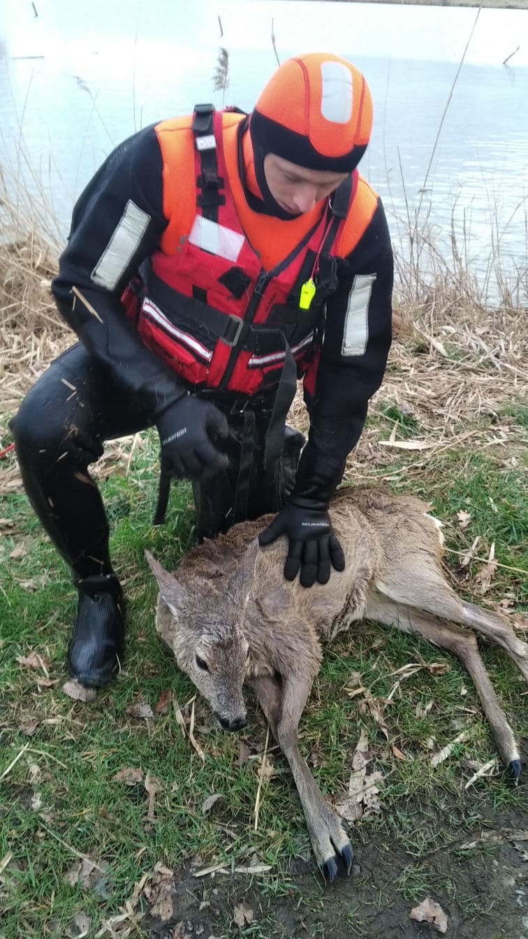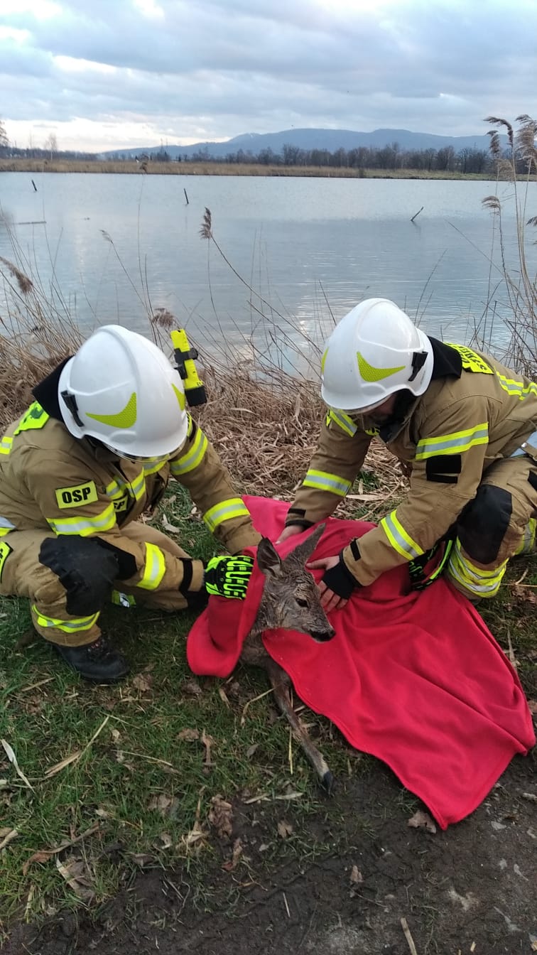 Kiedy strażacy przybyli na miejsce zdarzenia, zaplątane zwierzę znajdowało się w stawie ok. 30 m od brzegu. Strażacy zabezpieczeni w suche skafandry uwolnili sarnę i wyciągnęli ją na brzeg. Zwierzę ze względu na duże wycieńczenie nie było w stanie stanąć na własne nogi, dlatego przekazano go pracownikom Ośrodka Rehabilitacji "Mysikrólik".