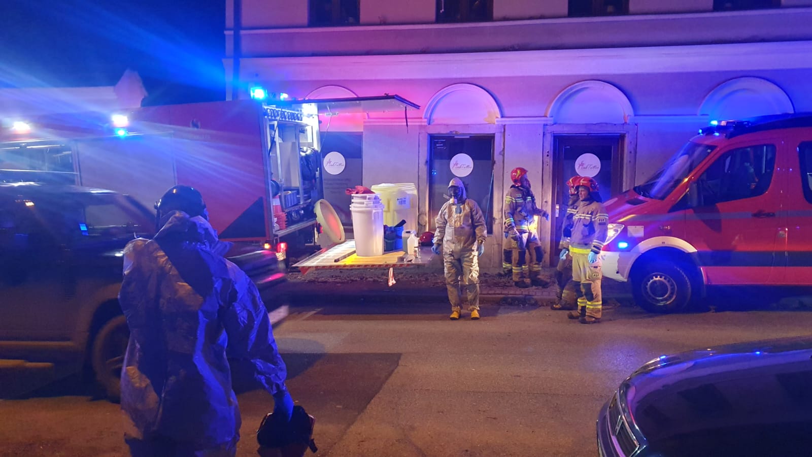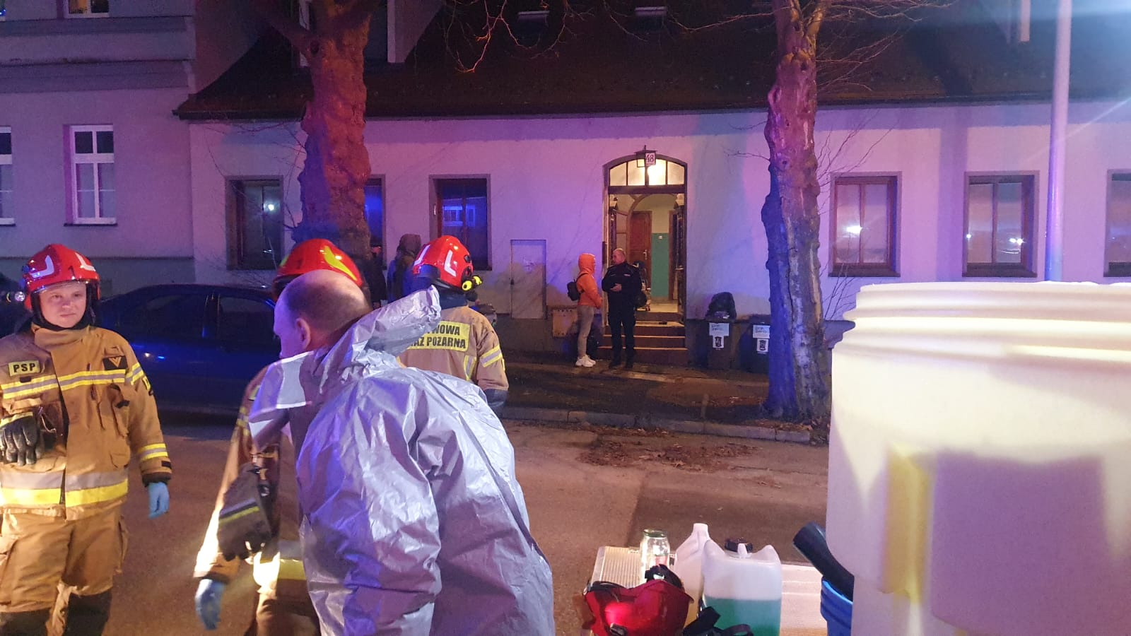 Po przybyciu zastępów straży pożarnej na miejsce zdarzenia ustalono, że na korytarzu oraz klatce schodowej pierwszego piętra rozlano butelkę (50ml) fabrycznie oznakowaną - kwas masłowy ( sprawca nieznany, wtargnął do kamienicy). Mieszkańcy znajdowali się przed wejściem do budynku - w stanie ogólnym dobrym, brak konieczności udzielania pomocy medycznej.