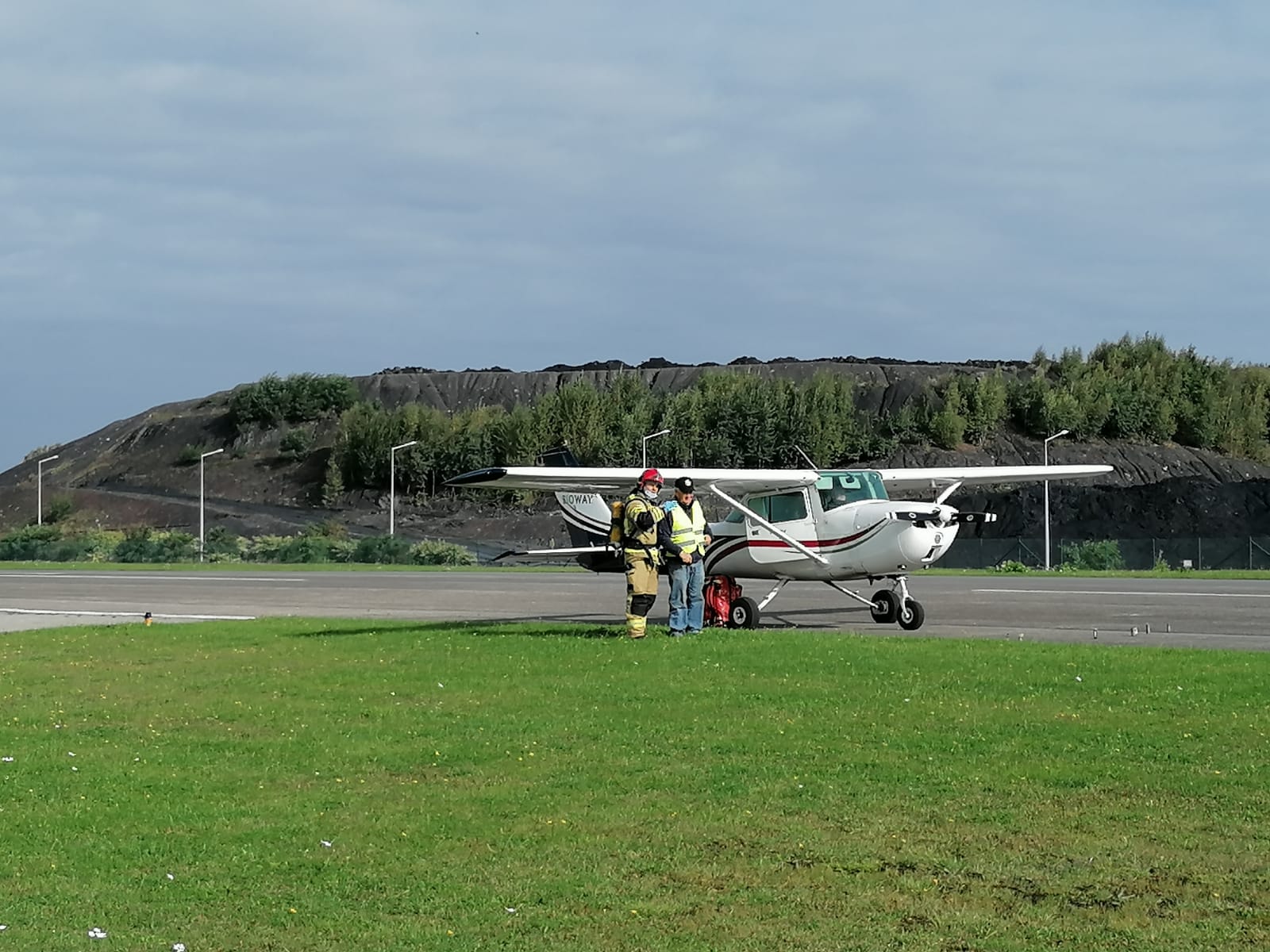 Mały samolot z dwoma osobami na pokładzie podczas lądowania na drodze startowej, dostaje boczny podmuch wiatru z lewej strony, co spowodowało utratę kontroli nad maszyną i wypadnięcie z asfaltowej drogi startowej. Samolot uległ uszkodzeniu, a znajdujący się w samolocie pasażer wraz z pilotem odnieśli różnego typu obrażenia. Z samolotu wydobywa się gesty dym.