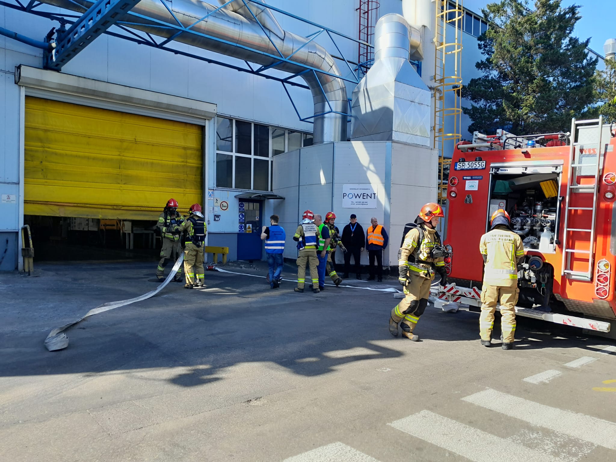 Po zakończonych ćwiczeniach ratownicy zostali oprowadzeni po terenie zakładu, w celu zaznajomienia się z rozmieszczeniem poszczególnych pomieszczeń, stref zagrożenia, a także dostępnych źródeł przeciwpożarowego zaopatrzenia w wodę.