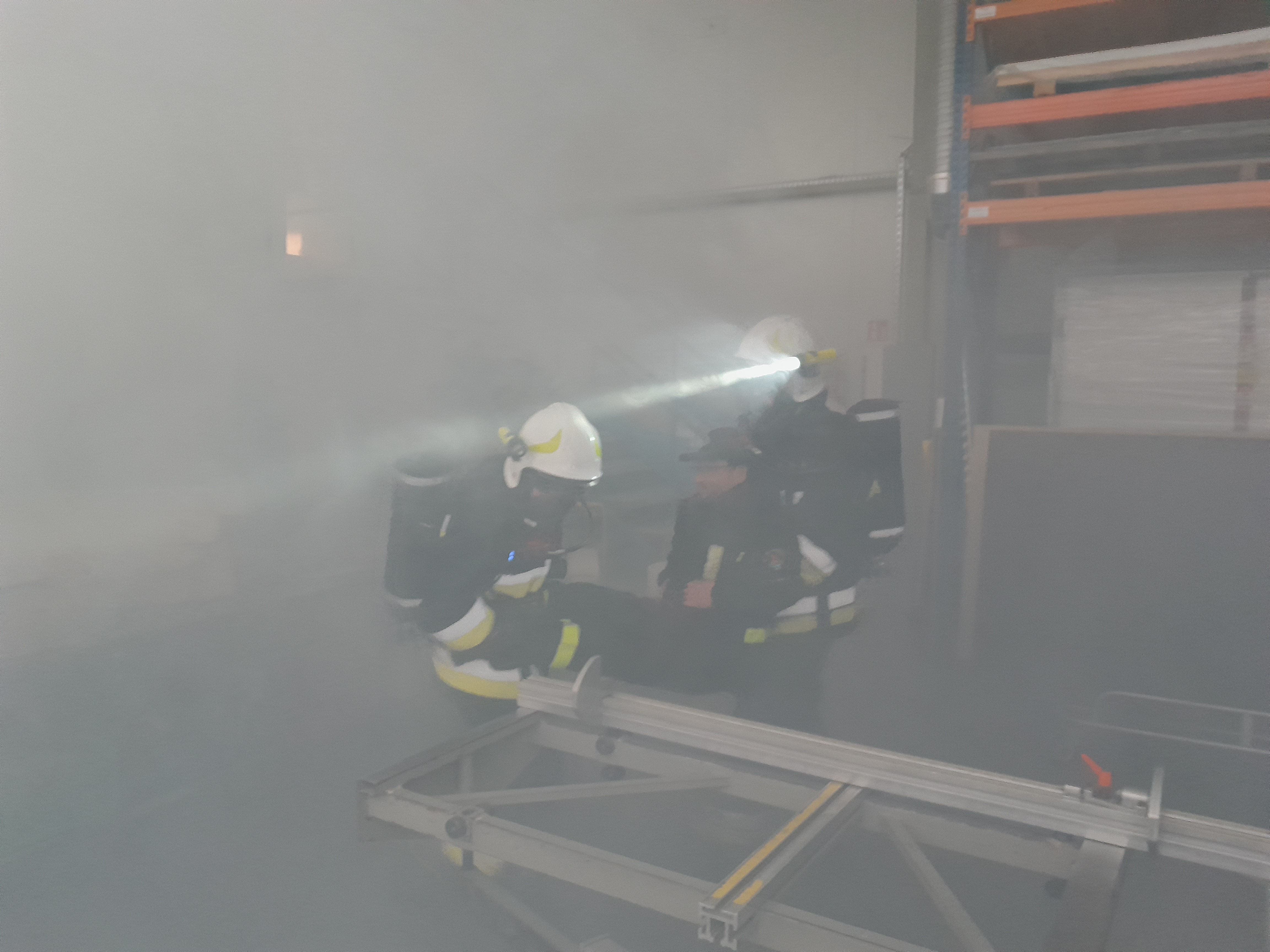 W wyniku awarii dochodzi do zapalenia się maszyny wraz z materiałem (pianka) wewnątrz. Osoba obsługująca maszynę zostaje ranna i pozostaje przy maszynie. Pozostała część pracowników ewakuowała się na zewnątrz hali. Dodatkowo z uwagi na duże zadymienie w magazynie podręcznym zostaje uwięziony pracownik.