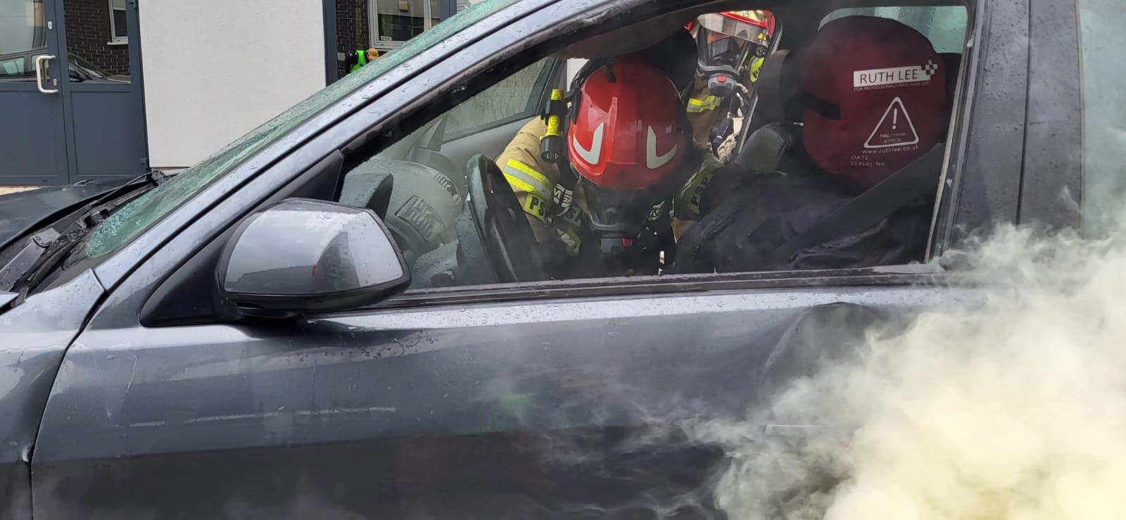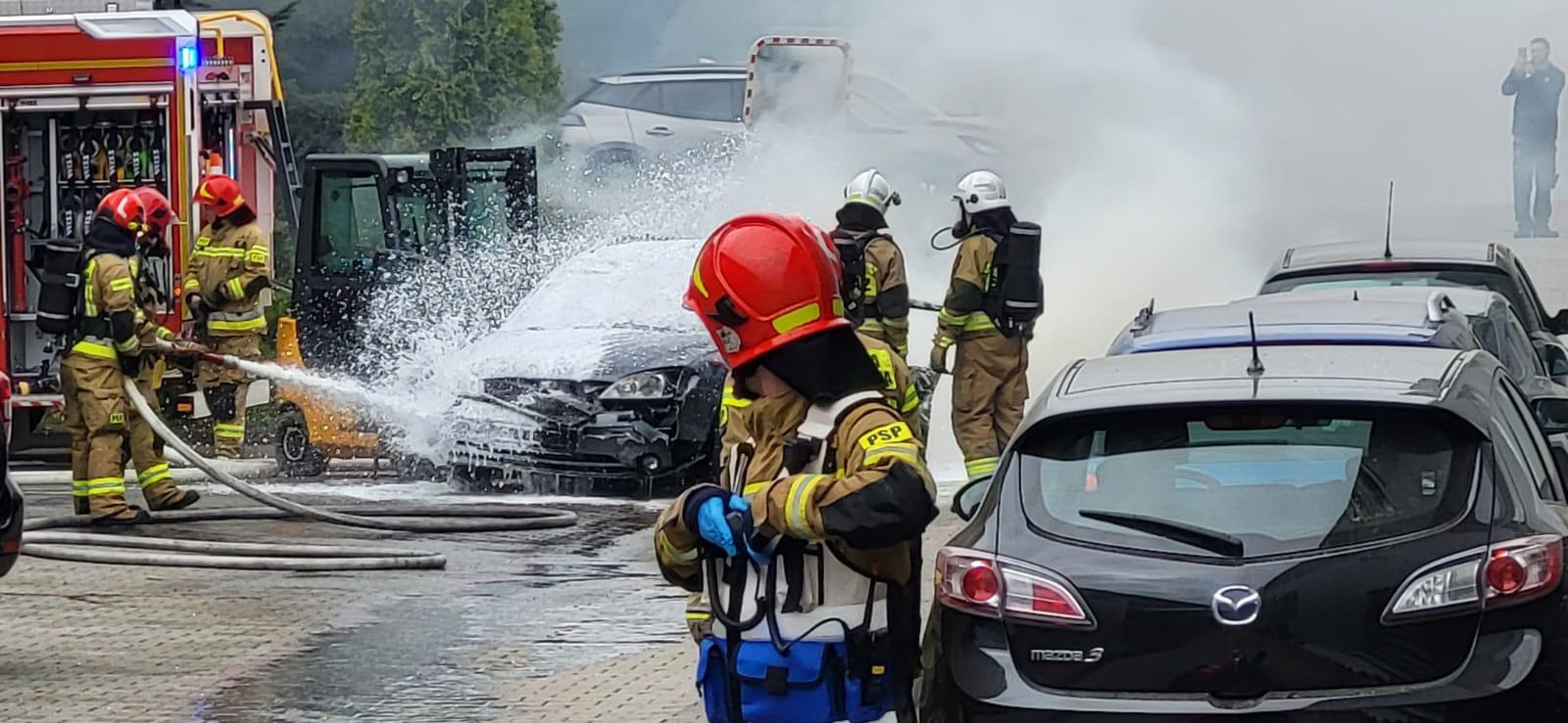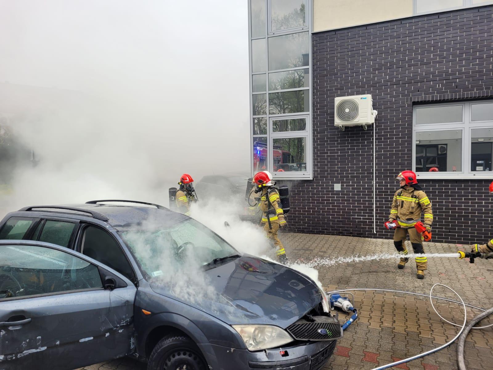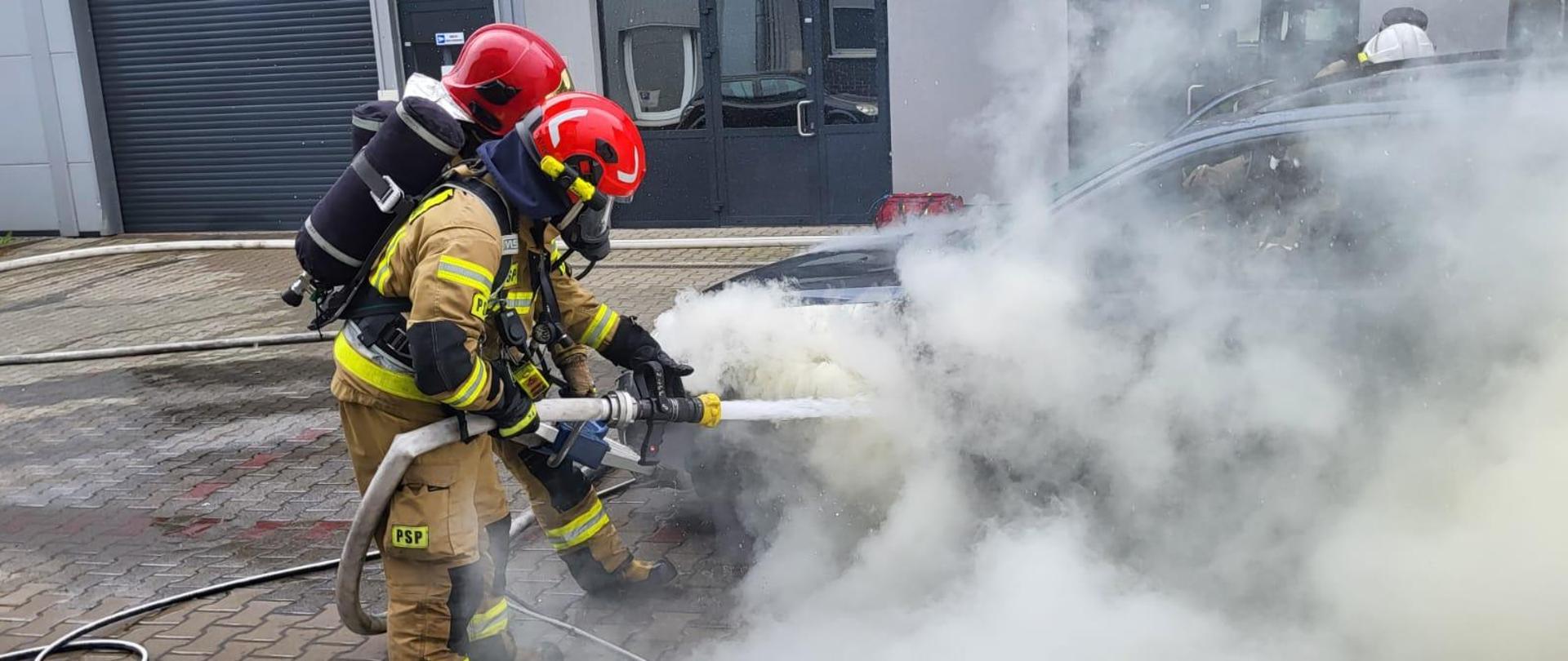 Zadania strażaków w pierwszej fazie polegały na zabezpieczeniu miejsca zdarzenia, wyciągnięciu uwięzionego kierowcy samochodu osobowego z pojazdu, ugaszeniu pożaru i udzieleniu kwalifikowanej pierwszej pomocy osobom poszkodowanym. Następnie przystąpiono do ugaszenia pożaru elewacji i dachu hali przy użyciu drabiny mechanicznej.
