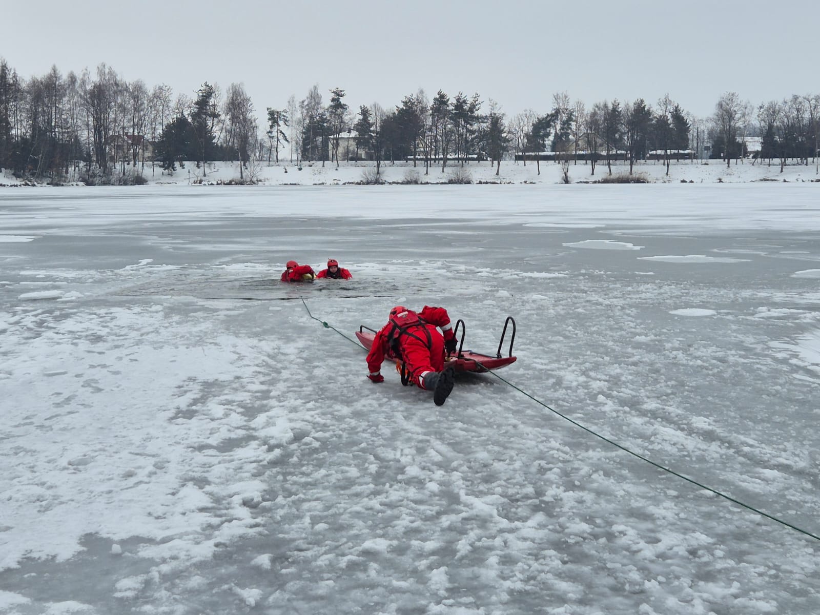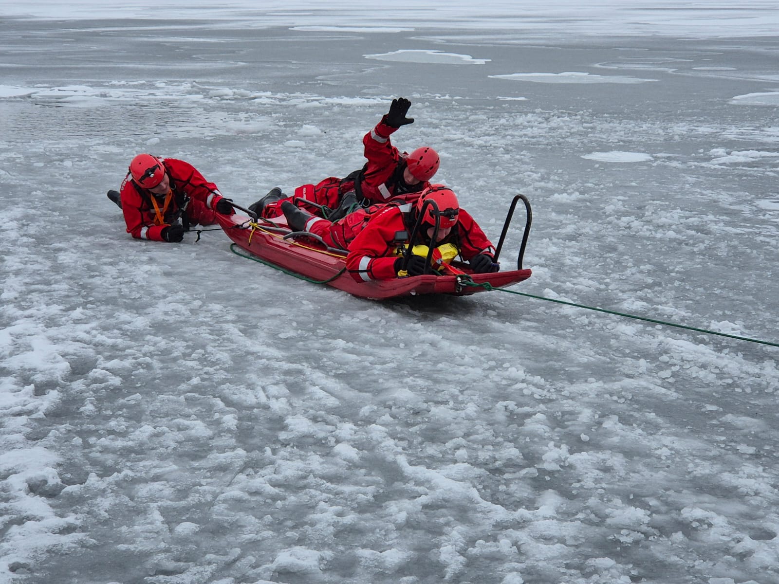 Wykorzystanie sań lodowych: Ratownicy trenowali szybkie dotarcie do osoby tonącej w przeręblu. Sanie lodowe pozwalają na bezpieczne rozłożenie ciężaru ratownika na lodzie i stanowią stabilną platformę do wyciągania poszkodowanych z lodowatej wody.
