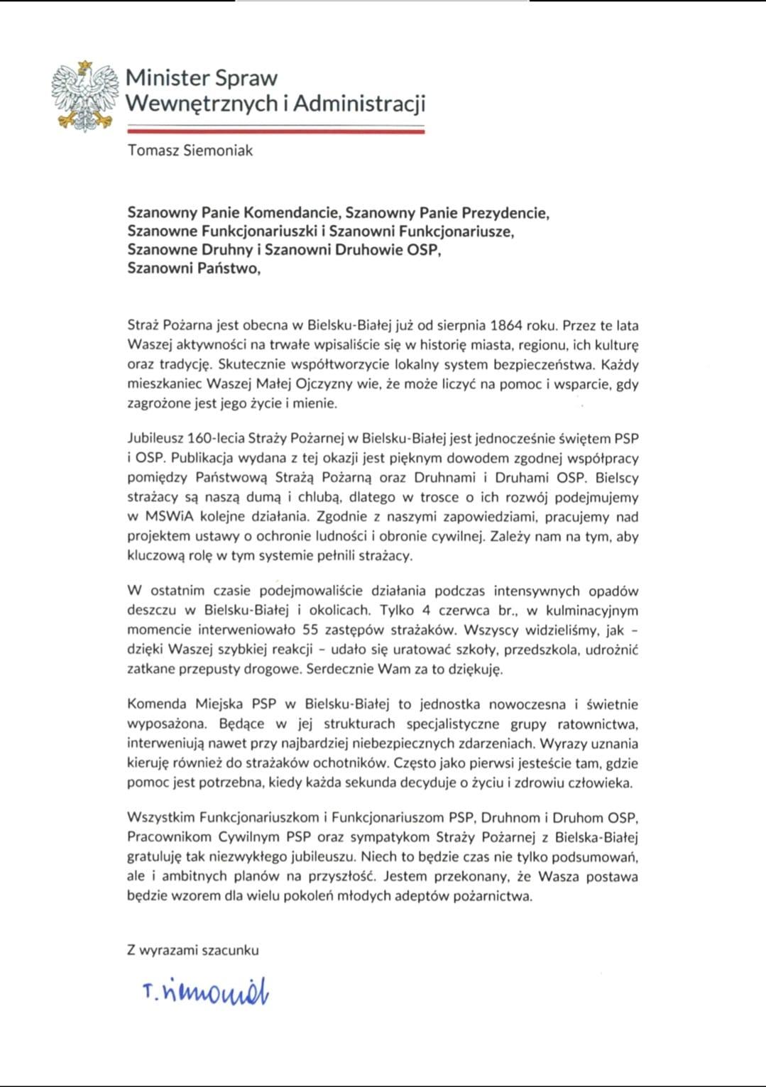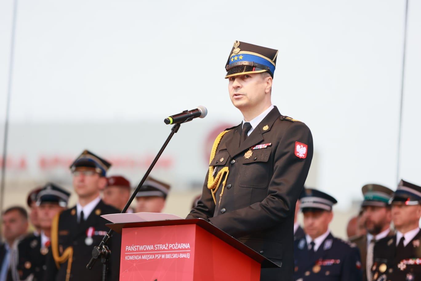 Zastępca Komendanta Głównego PSP st. bryg. Grzegorz Szyszko odczytał list okolicznościowy Ministra Spraw Wewnętrznych i Administracji Pana Tomasza Siemoniaka oraz złożył w imieniu Komendanta Głównego PSP nadbryg. dr inż. Mariusza Feltynowskiego gratulacje z okazji jubileuszu 160-lecia istnienia straży pożarnej w Bielsku-Białej.