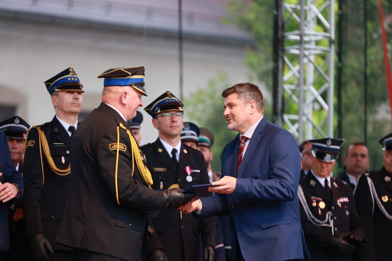 W dalszej części dzisiejszej uroczystości wyróżniono członków Ochotniczych Straży Pożarnych odznaczeniami, nadanymi przez Prezydium Zarządu Głównego ZOSRP RP. Wręczono 2 Złote Znaki Związku Ochotniczej Straży Pożarnej, 1 Medal Honorowy im. Bolesława Chomicza oraz 16 medali za Zasługi dla Pożarnictwa.
