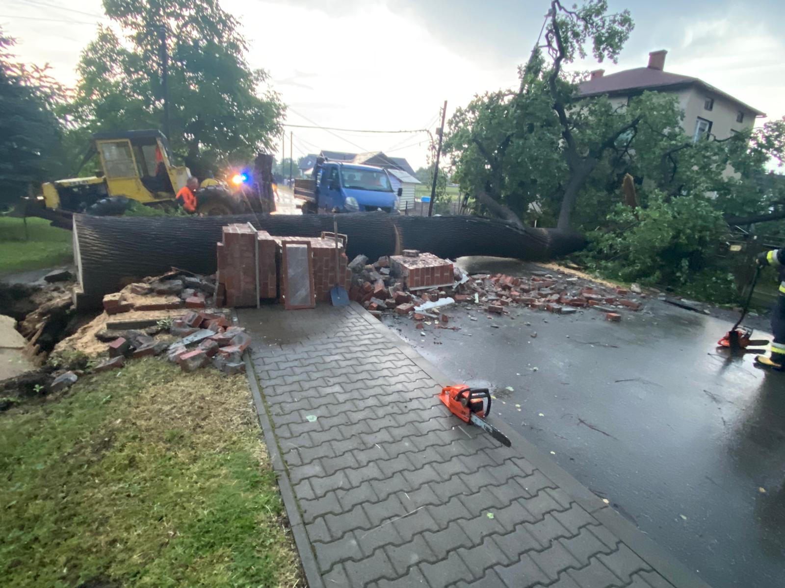 Do najpoważniejszego zdarzenia doszło w Zabrzegu, gdzie drzewo o wysokości ok. 20 m, przewróciło się na budynek mieszkalny. Kiedy strażacy przybyli na miejsce zdarzenia, pień drzewa o średnicy ok. 140 cm leżał w poprzek drogi, natomiast korona drzewa wraz z konarami częściowo oparła się o ścianę budynku. Przewrócone drzewo złamało słup energetyczny, zerwało przewody energetyczne oraz zniszczyło ogrodzenie posesji. Strażacy pocięli drzewo i usunęli konar z jezdni oraz ściany budynku. Z uwagi na rozmiar drzewa, działania strażaków wsparła zewnętrzna firma zajmująca się wycinką drzew.