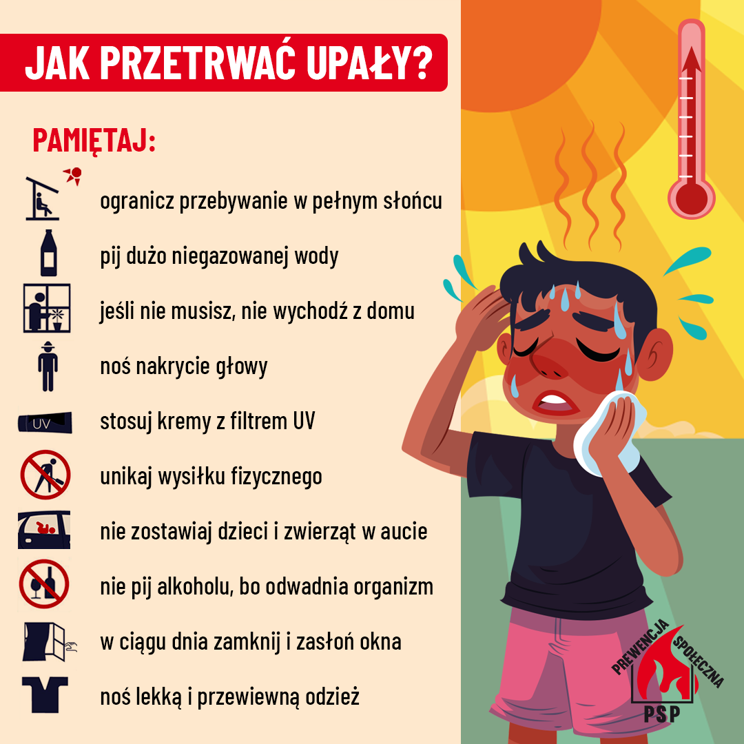 - należy unikać forsownego wysiłku fizycznego w najgorętszej porze dnia. Wysiłek fizyczny, jak np. bieganie może doprowadzić do odwodnienia, skurczów mięśni spowodowanych odwodnieniem i utratą minerałów, przegrzaniem organizmu lub udaru cieplnego;