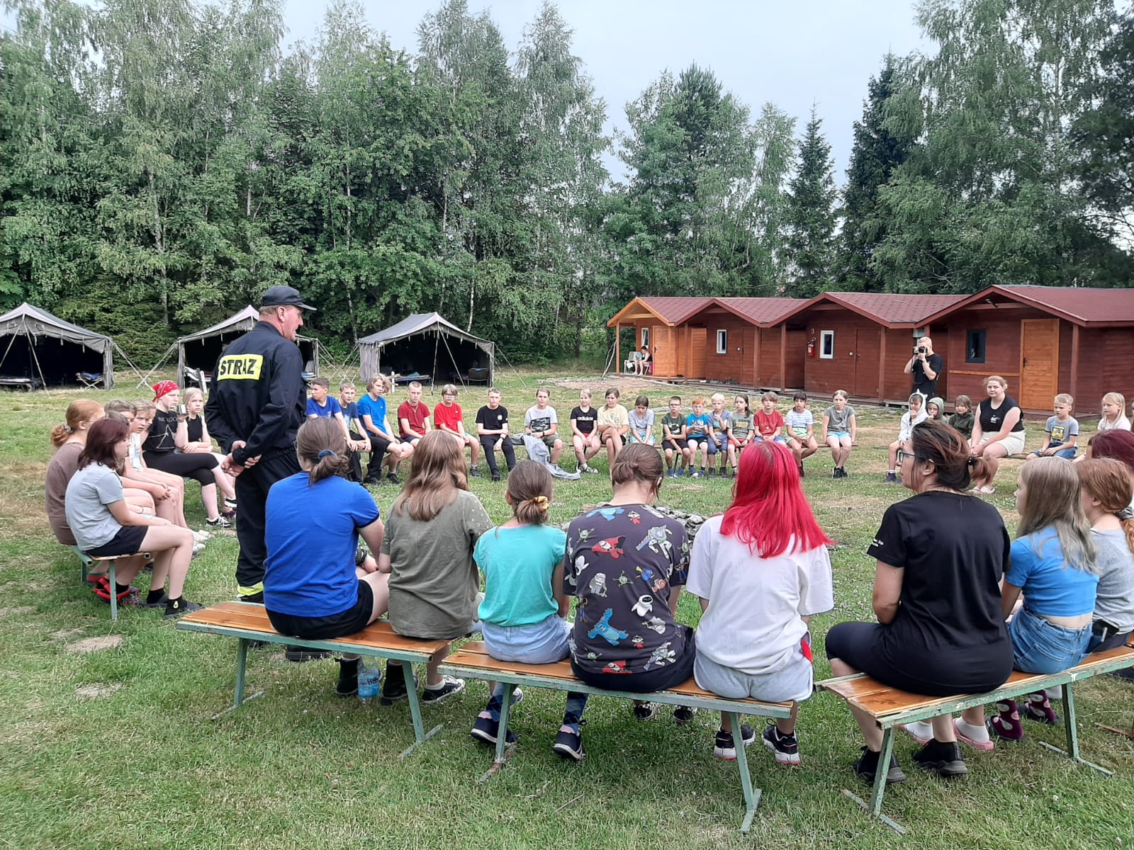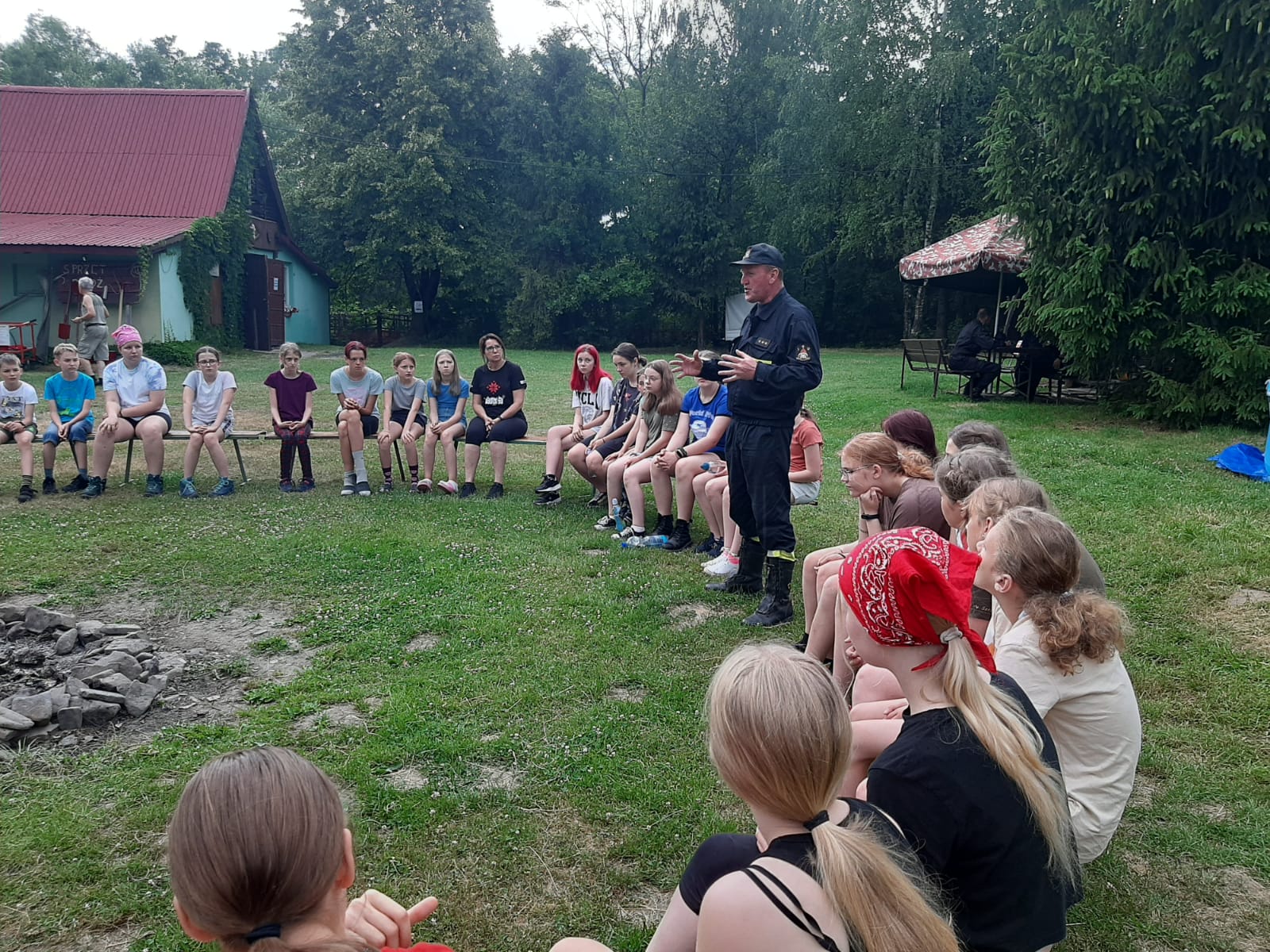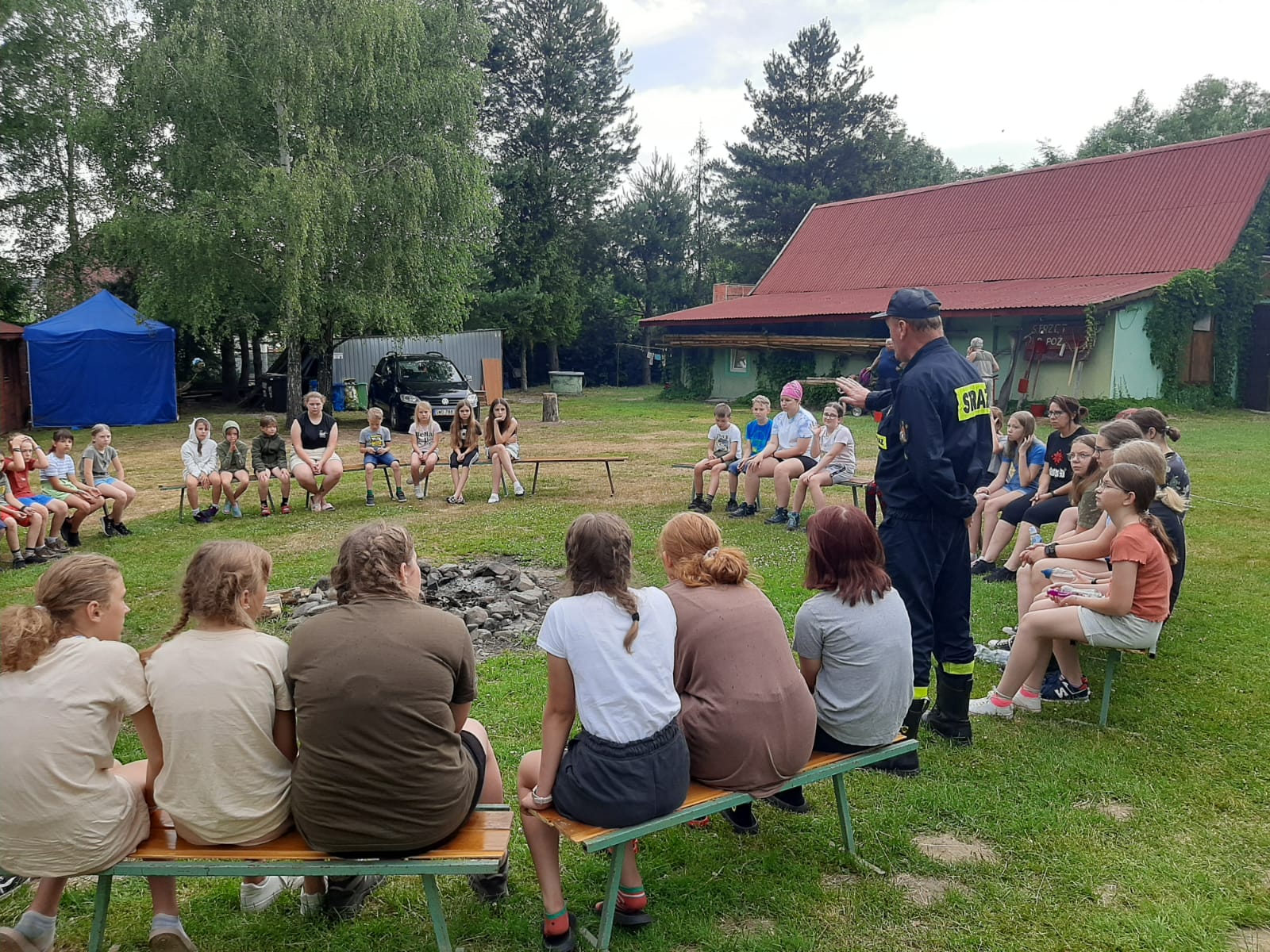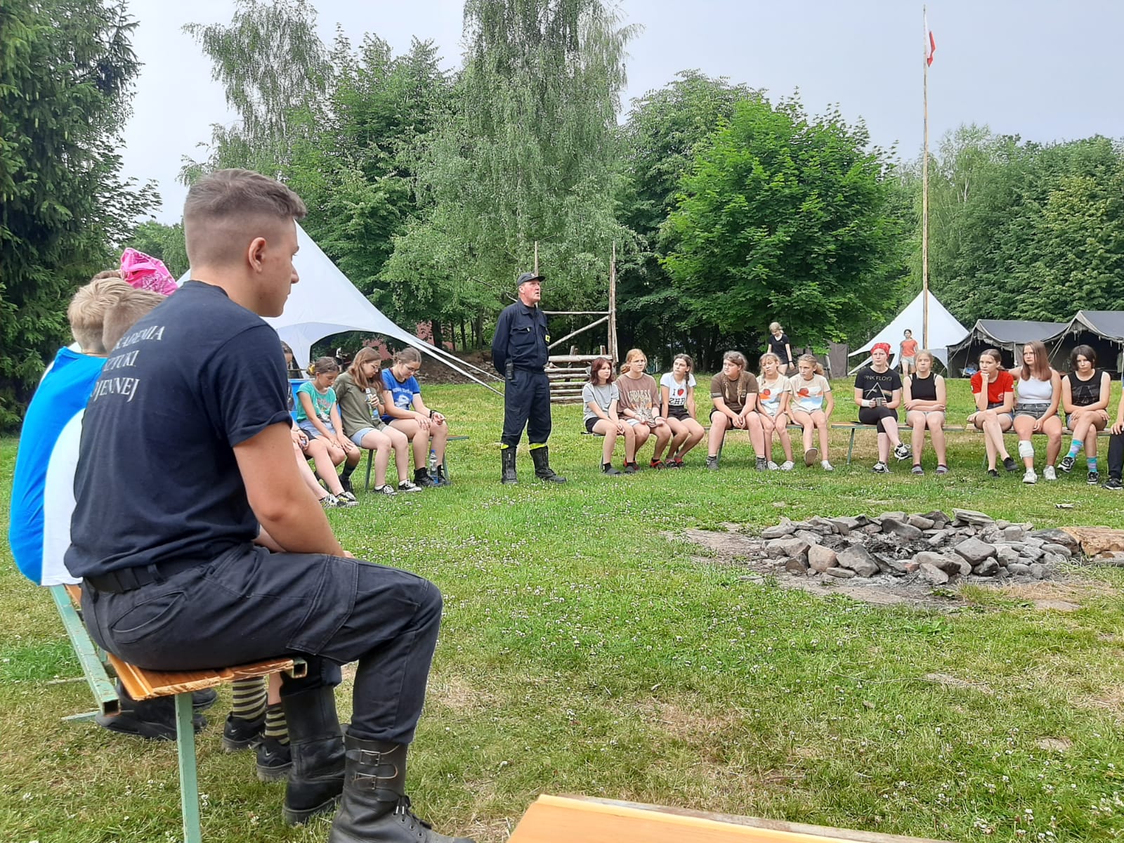 Podczas spotkania strażacy przeprowadzili zajęcia edukacyjne, obejmujące sposób postępowania podczas możliwych zagrożeń mogących wystąpić na terenie obozu – ze szczególnym uwzględnieniem pożarów, gwałtownych wyładowań atmosferycznych i obfitych opadów deszczu oraz silnych podmuchów wiatru.