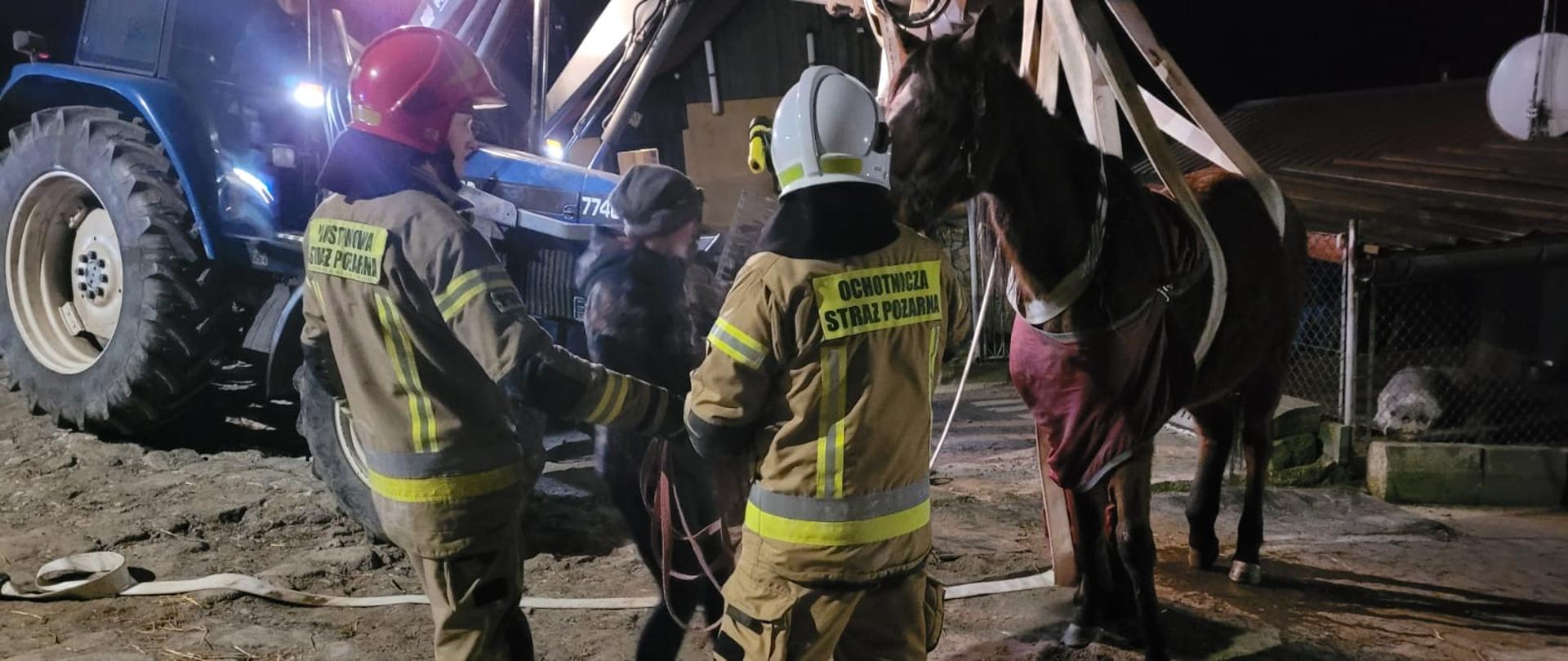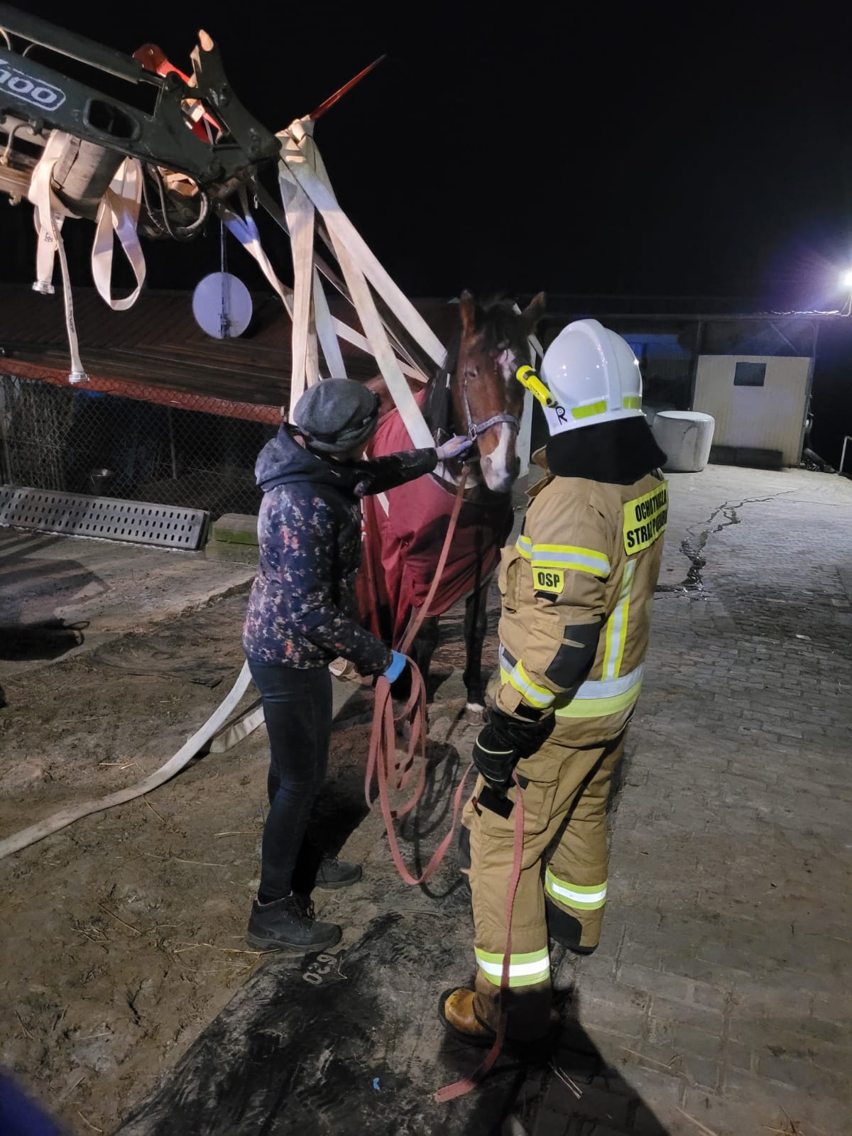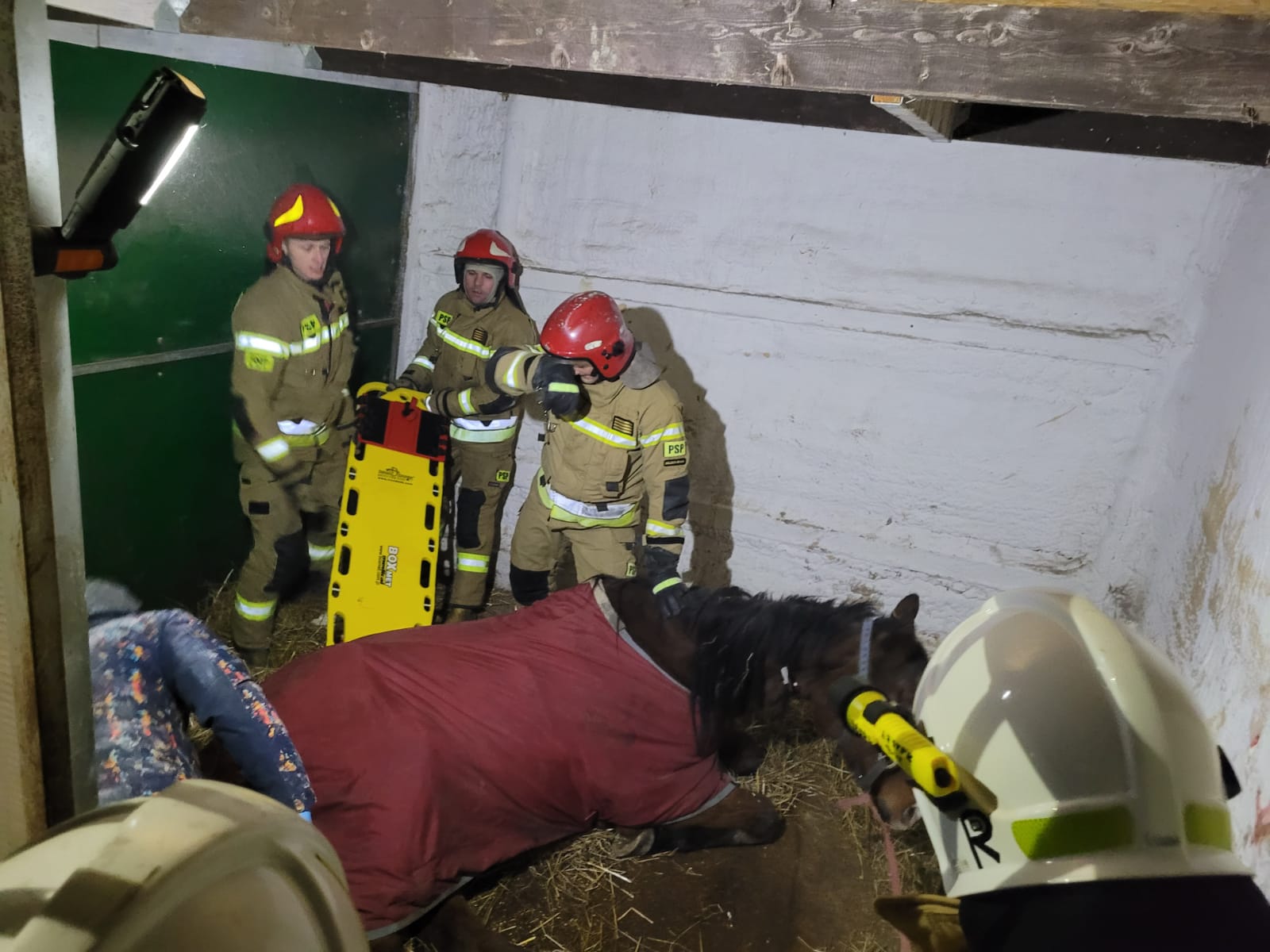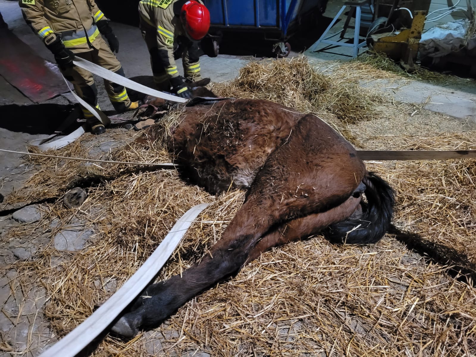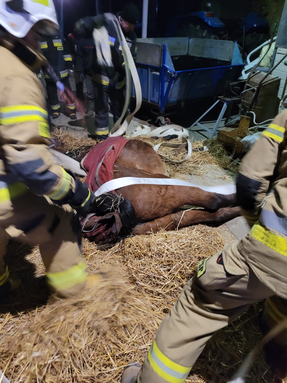 Strażacy wyciągnęli konia ze stajni w pozycji leżącej. Konia ewakuowano na rozścielonej słomie. Następnie do jego pionowania wykorzystano będący na miejscu traktor z widłami do bel słomy oraz węże strażackie, z których zrobiono pasy oplatające tułów konia.
